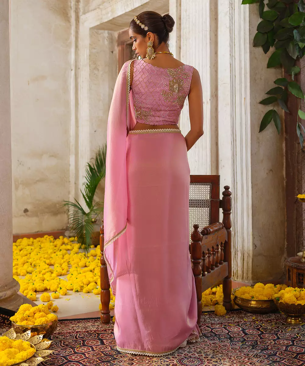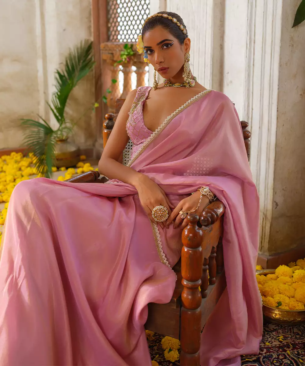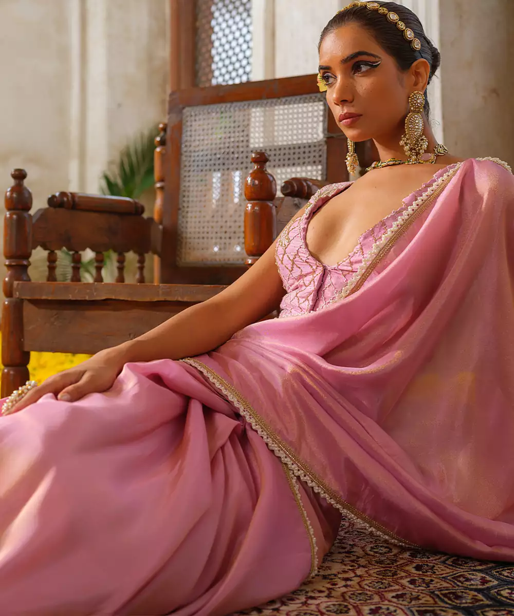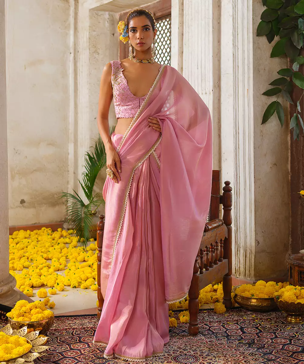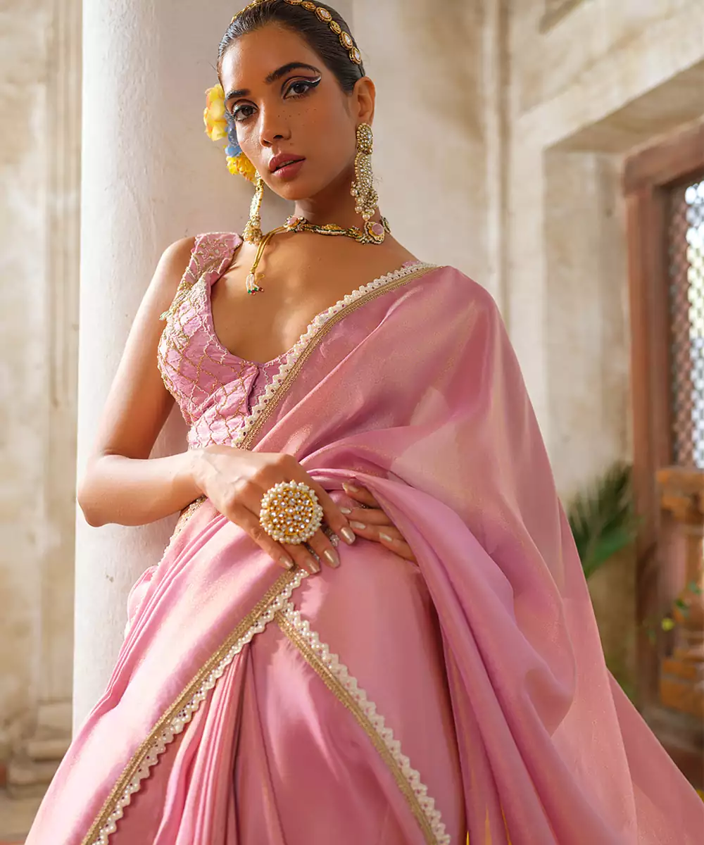 Exude Feminine Grace In This Pink Embroidered Tissue Silk Saree. The Lightweight, Luminous Tissue Silk Creates A Mesmerizing Glow, While The Intricate Floral Embroidery Adds A Touch Of Regal Charm. Perfectly Balanced Between Ethereal And Opulent, This Saree Is A Stunning Choice For Weddings And Festive Celebrations.