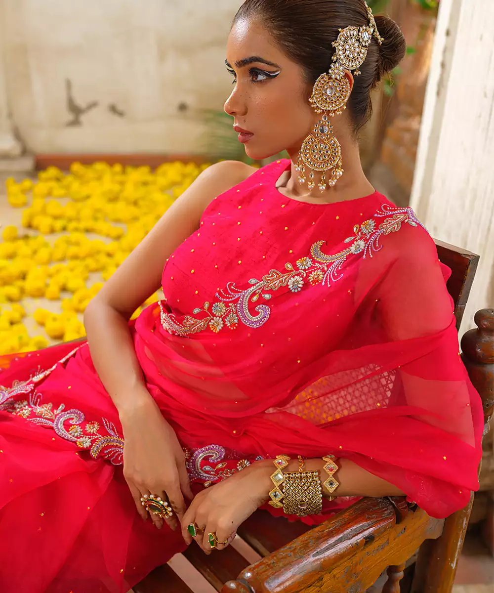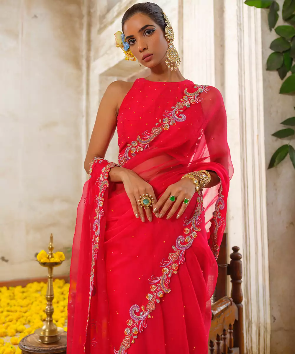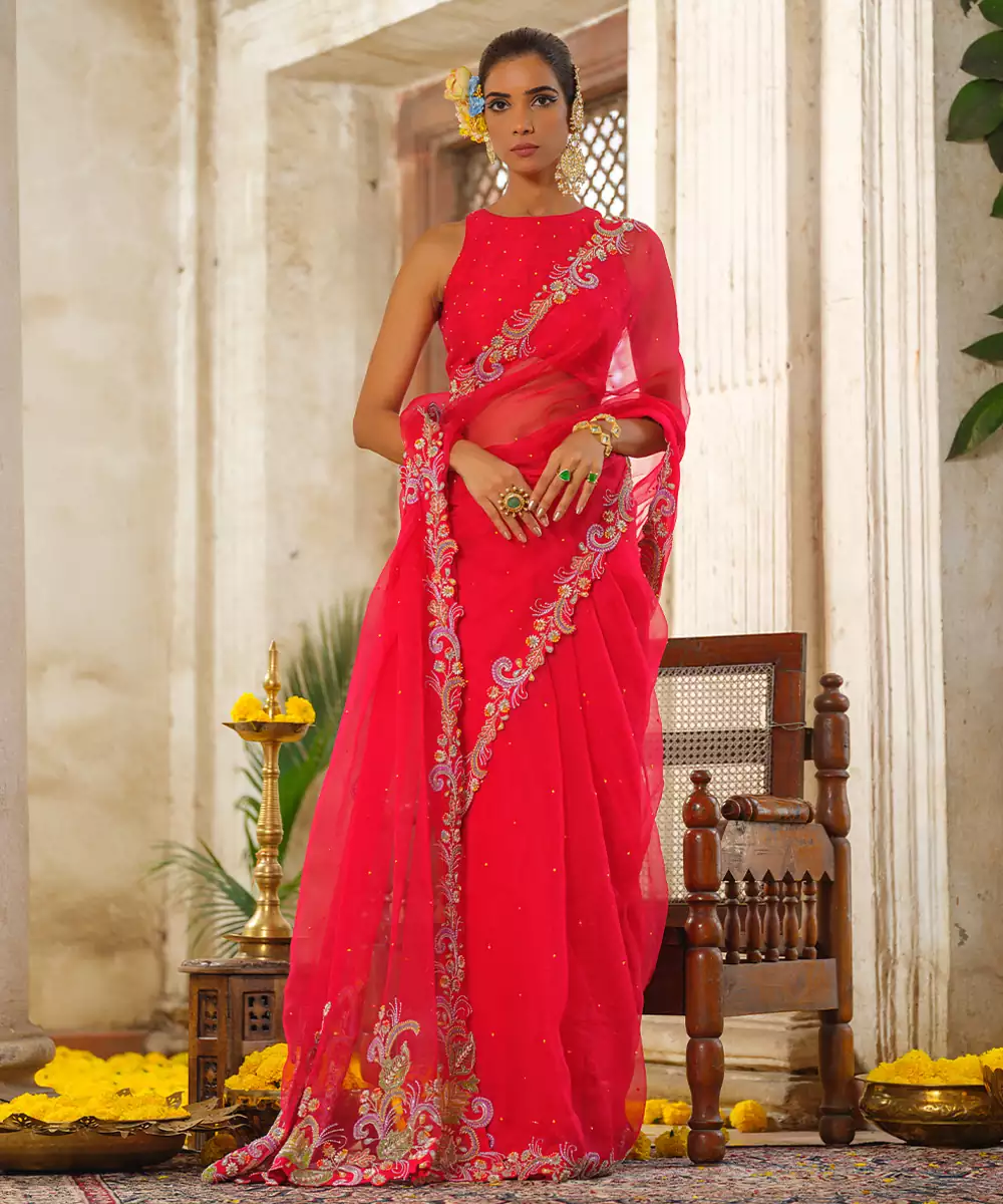 Stunning Red Embroidered Organza Saree Crafted In A Lightweight, Sheer Fabric With A Soft Natural Sheen. Intricate Embroidery Adds Rich Festive Charm, While The Graceful Drape Enhances Its Elegant Silhouette. Perfect For Weddings, Festive Celebrations, Parties, And Sophisticated Evening Occasions.