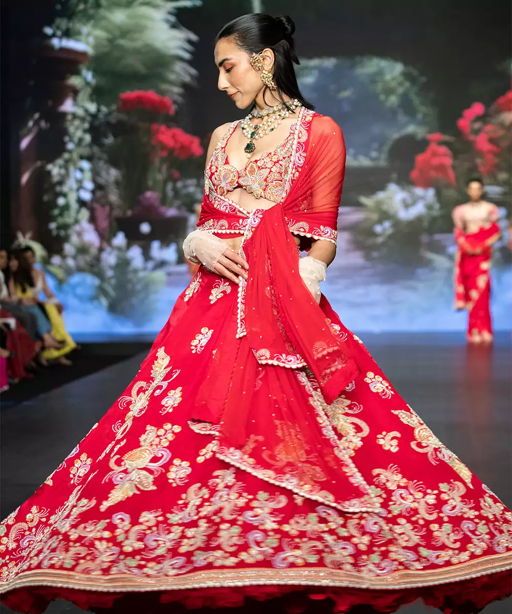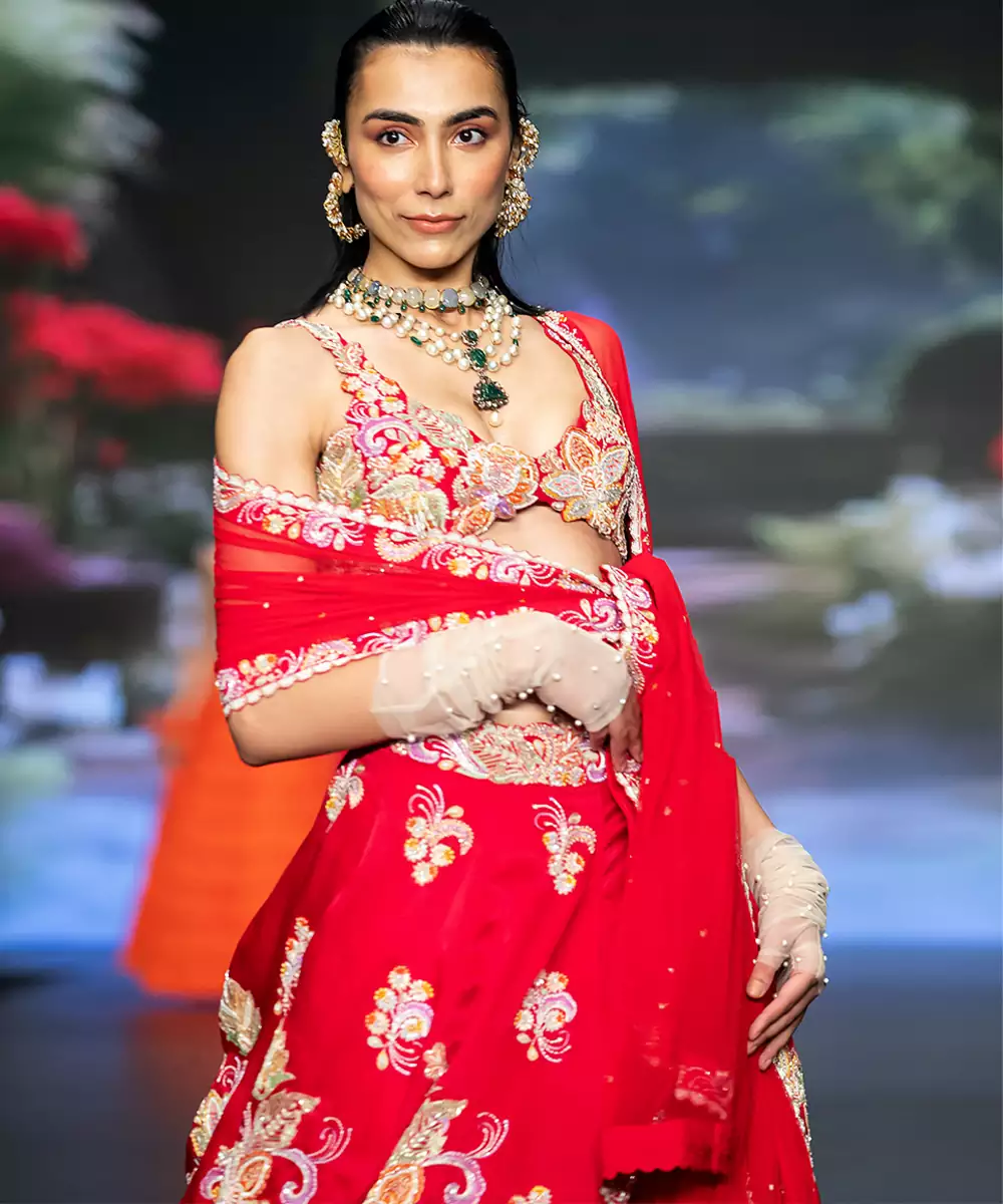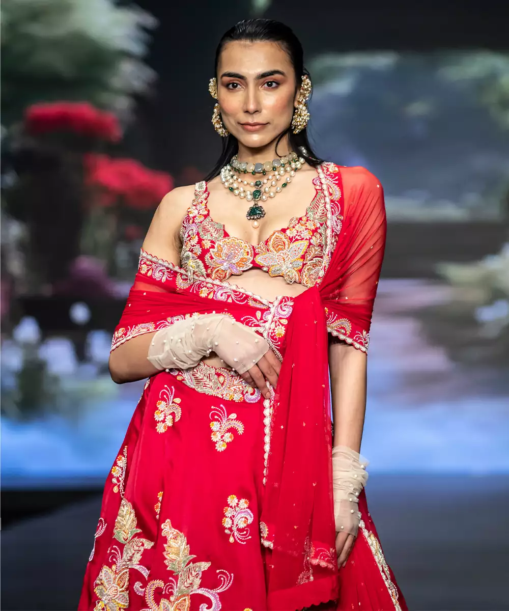 This Red Embroidered Silk Lehenga Set Exudes Timeless Bridal Elegance With Its Rich Silk Base And Intricate Traditional Motifs. Enhanced With Detailed Thread And Zari Work, It Offers A Luxurious Sheen And Graceful Flare. Perfect For Weddings And Festive Occasions, It Pairs Beautifully With Classic Jewelry For A Regal Ethnic Look.