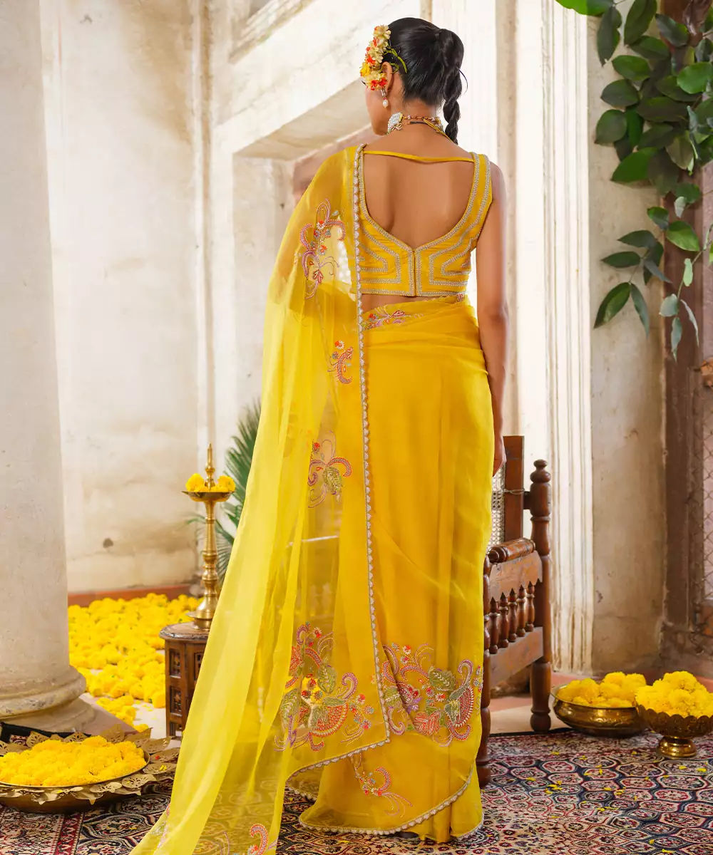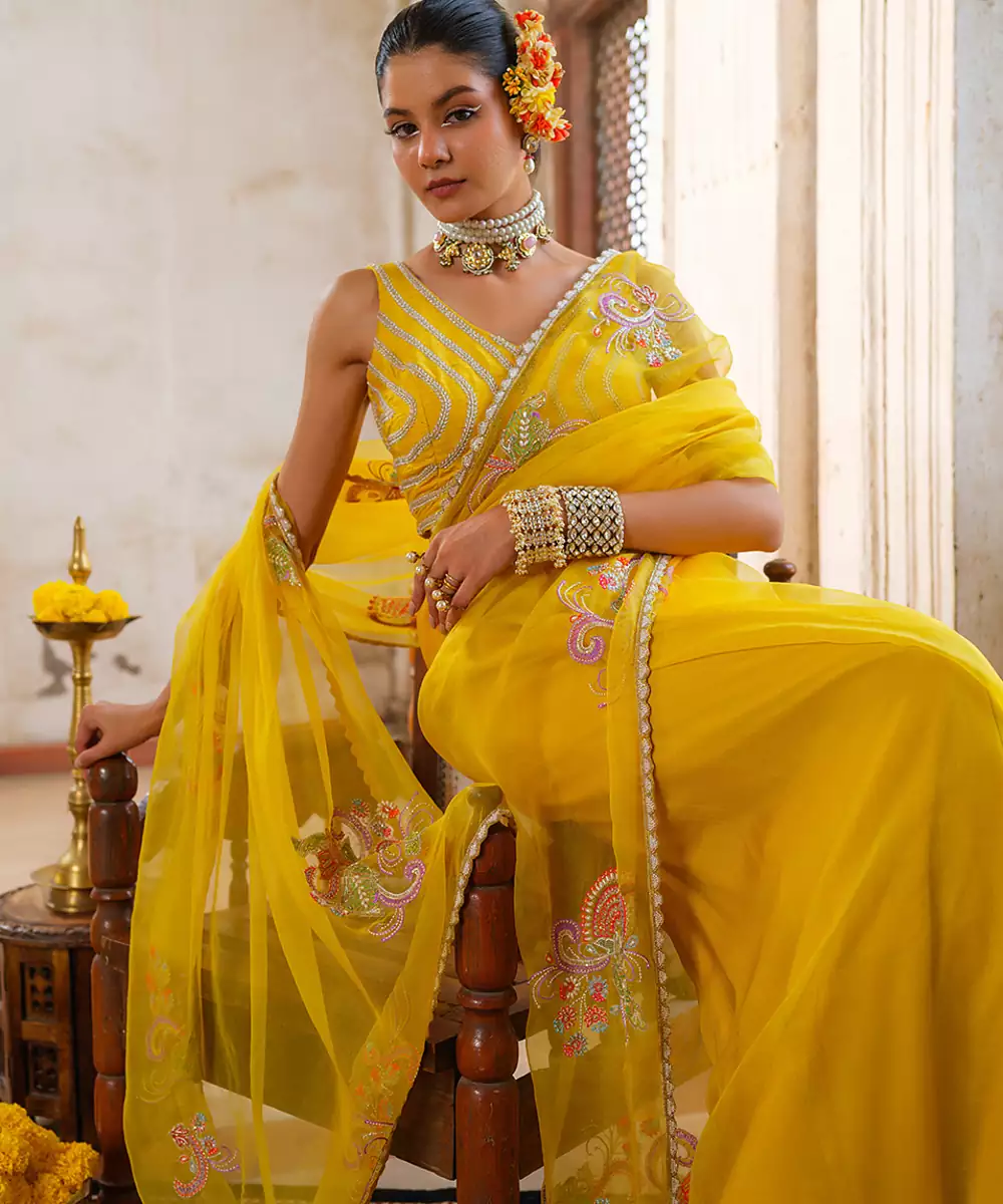 Radiant Yellow Embroidered Organza Saree Crafted In A Lightweight, Sheer Fabric With A Soft Natural Sheen. Intricate Embroidery Adds Festive Charm And Delicate Elegance, While The Graceful Drape Creates A Refined Silhouette. Perfect For Weddings, Festive Celebrations, Daytime Parties, And Special Occasions.