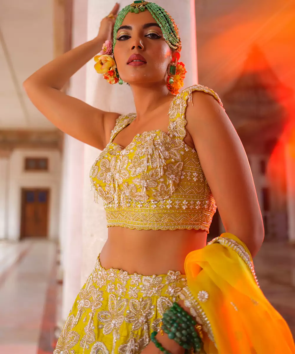 A Radiant Yellow Silk Lehenga Set Adorned With Exquisite Embroidery, Capturing Festive Vibrance And Timeless Elegance. The Rich Silk Fabric Drapes Gracefully, While Intricate Patterns Enhance Its Luxurious Appeal. Paired With A Matching Blouse And Dupatta, This Ensemble Is Perfect For Weddings, Haldi Ceremonies, And Joyful Festive Celebrations.