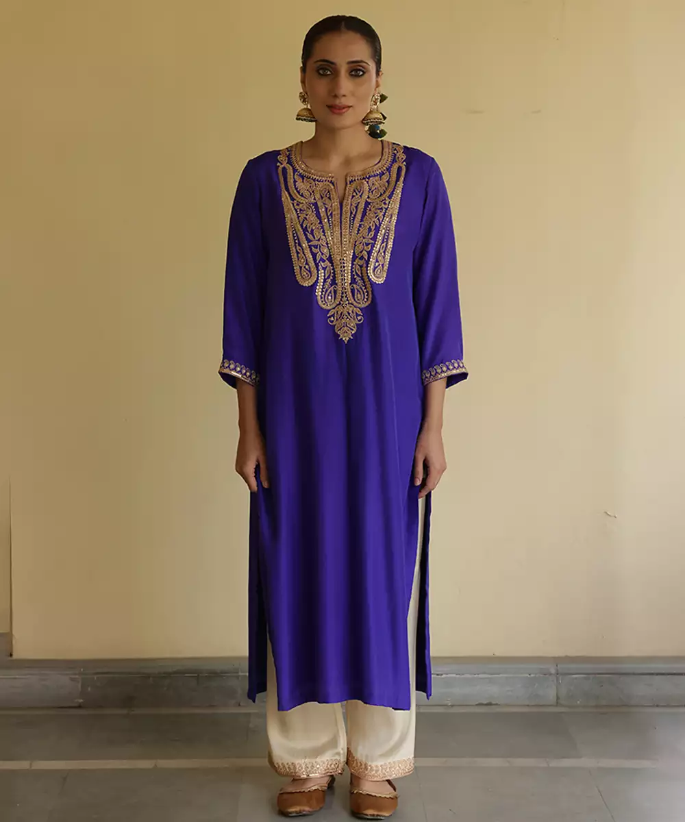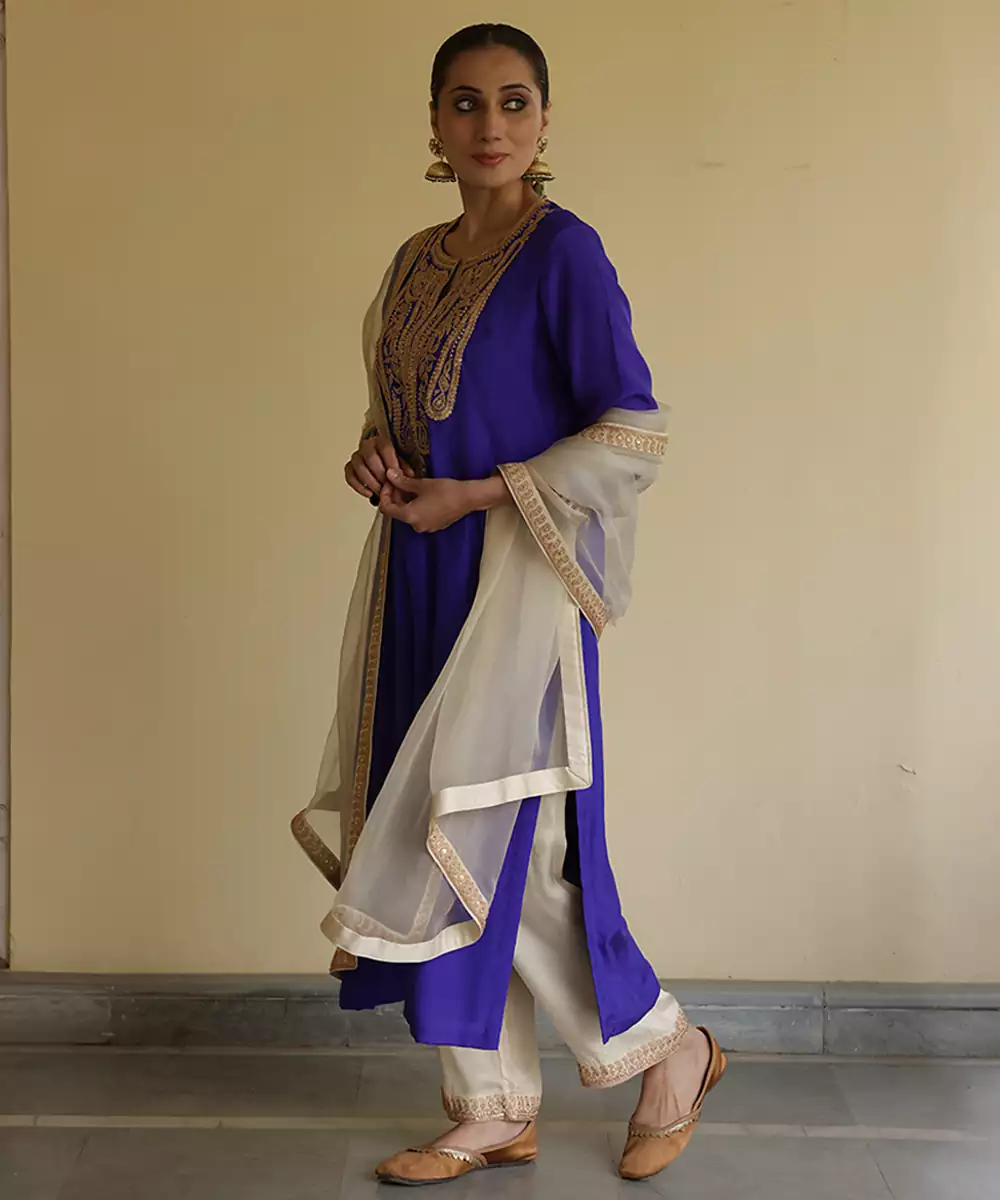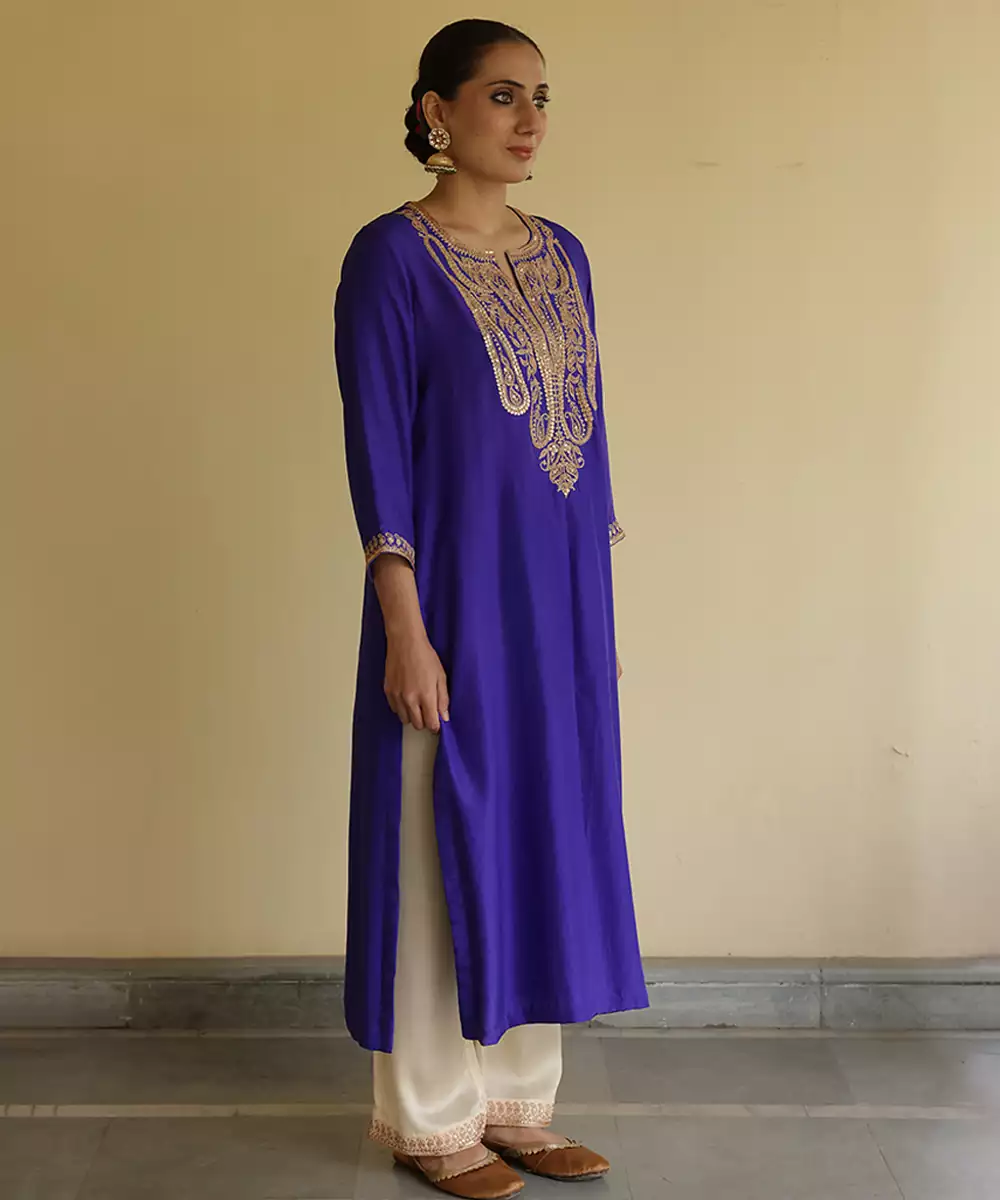 A Regal Blue Silk Kurta Set Adorned With Intricate Embroidery That Enhances Its Timeless Appeal. Crafted From Lustrous Silk, This Ensemble Offers A Graceful Silhouette And Luxurious Comfort. Perfect For Festive Gatherings And Celebrations, It Blends Traditional Artistry With Contemporary Elegance Effortlessly.