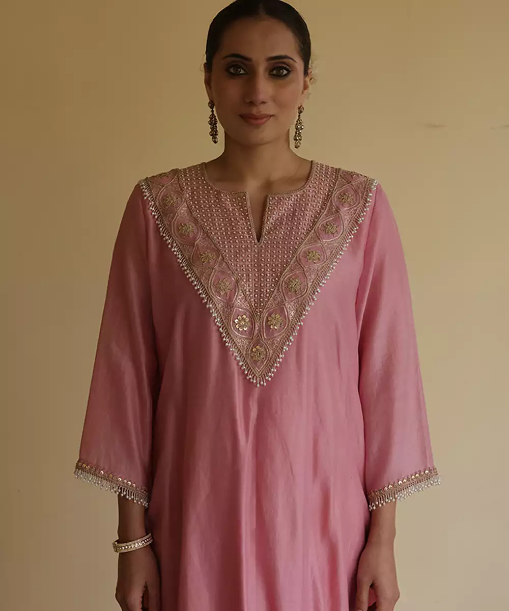 This Pink Chanderi Kurta Set Is Beautifully Embellished With Fine Embroidery, Enhancing Its Soft, Graceful Appeal. The Lightweight Texture Offers Comfort And Fluid Drape, Making It Suitable For Festive Occasions And Daytime Events. A Perfect Blend Of Elegance And Traditional Artistry.