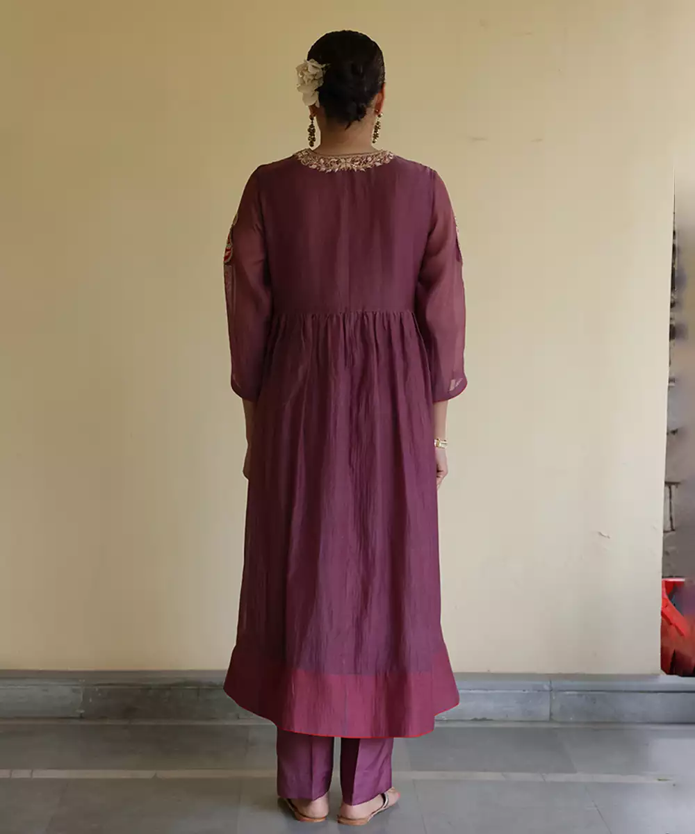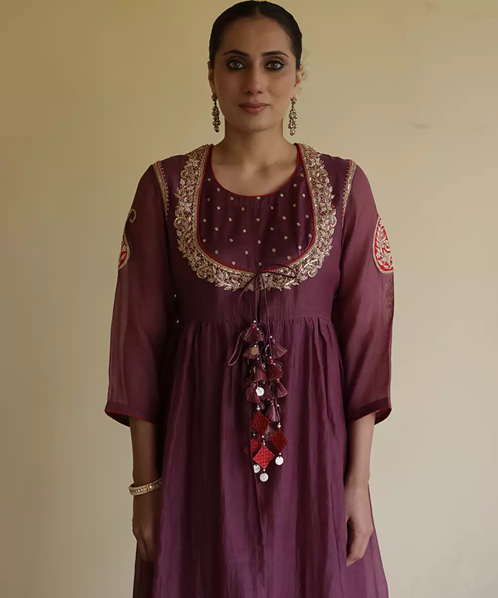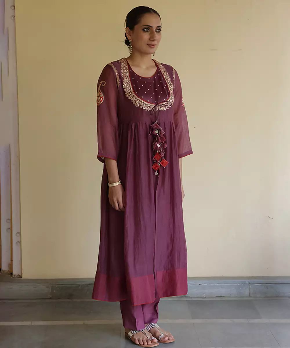 A Luxurious Purple Wine Chanderi Kurta Set Enhanced With Fine Embroidery For A Rich Ethnic Look. The Lightweight Chanderi Fabric Provides A Subtle Sheen And Elegant Drape. Perfect For Festive Occasions, It Balances Heritage Craftsmanship With Modern Sophistication Beautifully.