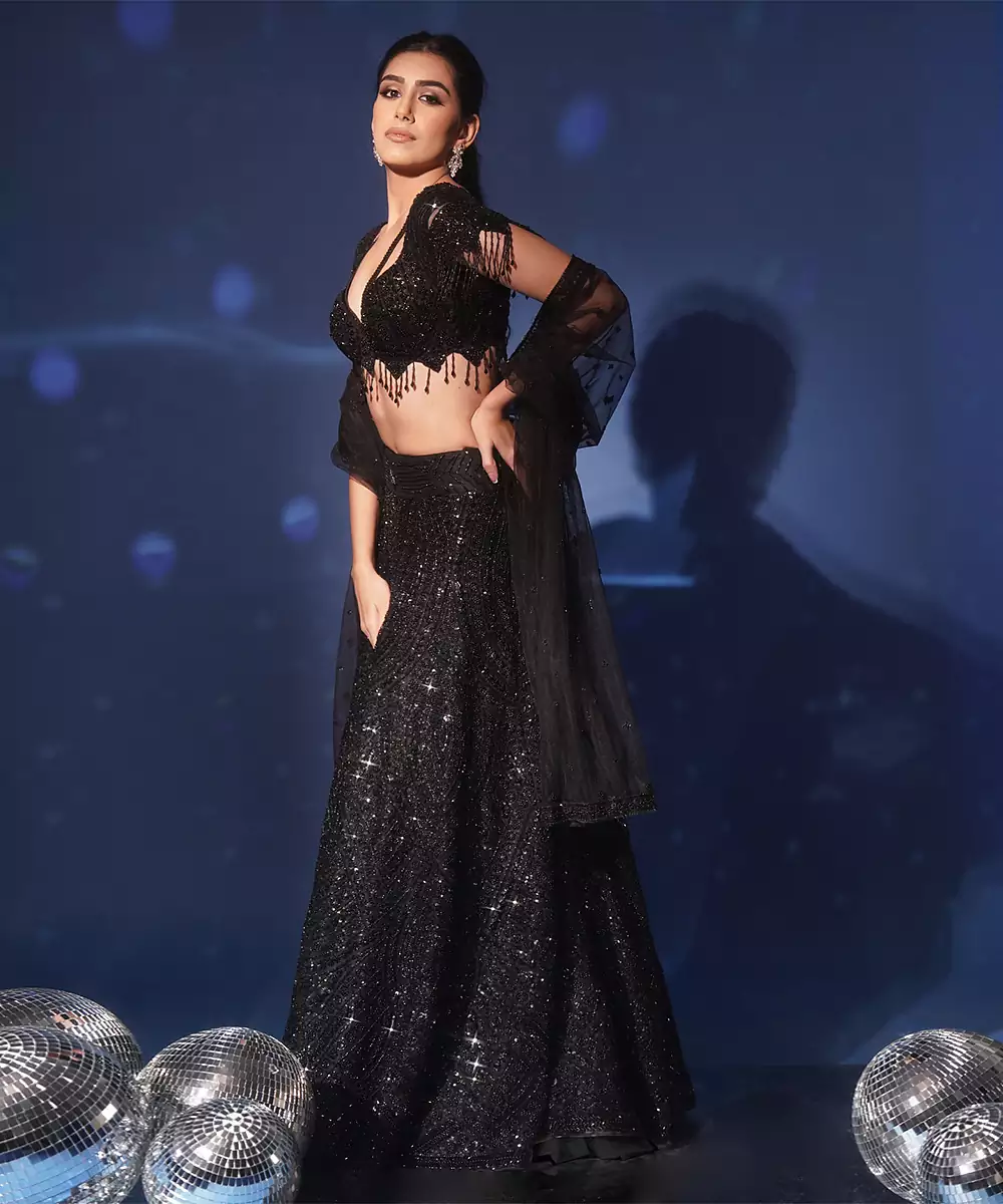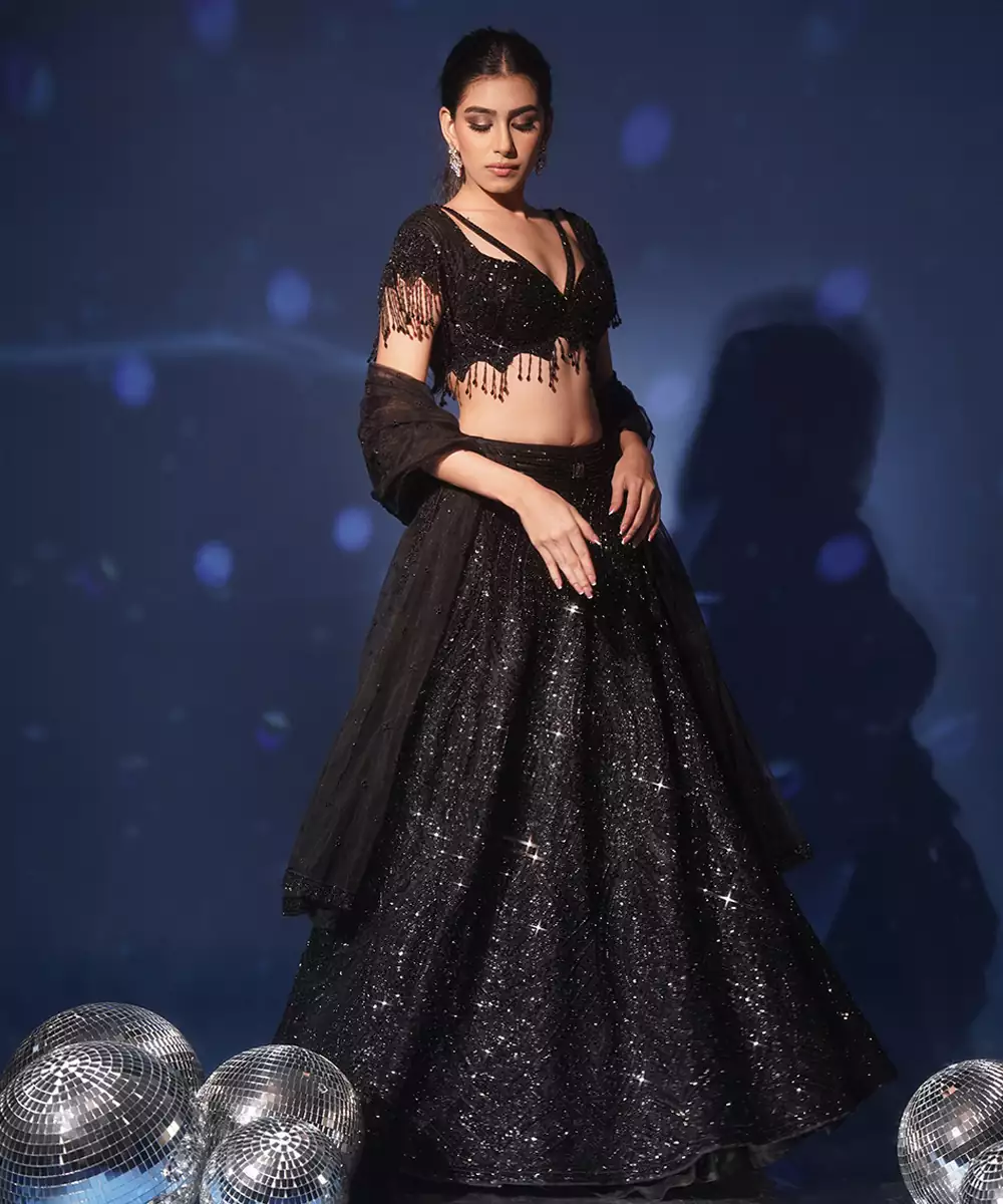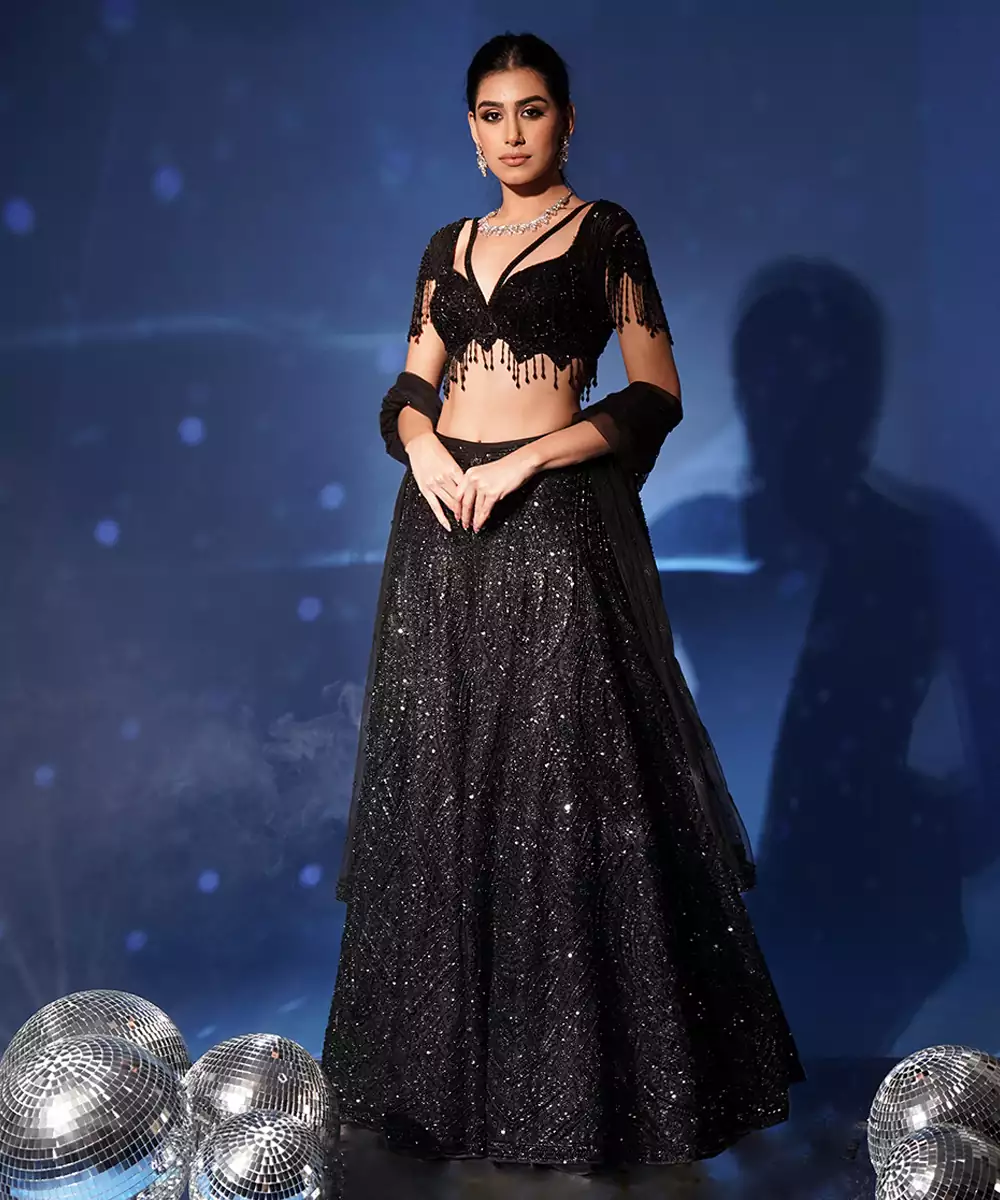This Black Embroidered Net Lehenga Set Exudes Understated Elegance And Contemporary Charm. Crafted From Sheer Net Fabric, It Features Intricate Embroidery That Adds A Refined, Graceful Touch. Perfect For Weddings And Festive Occasions, It Offers A Beautiful Silhouette With Timeless Sophistication.