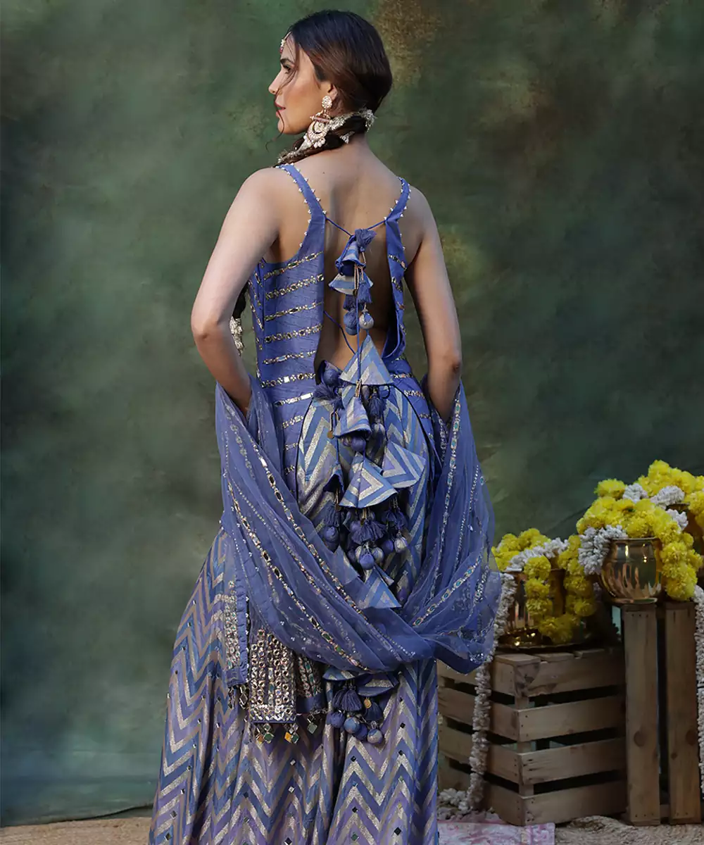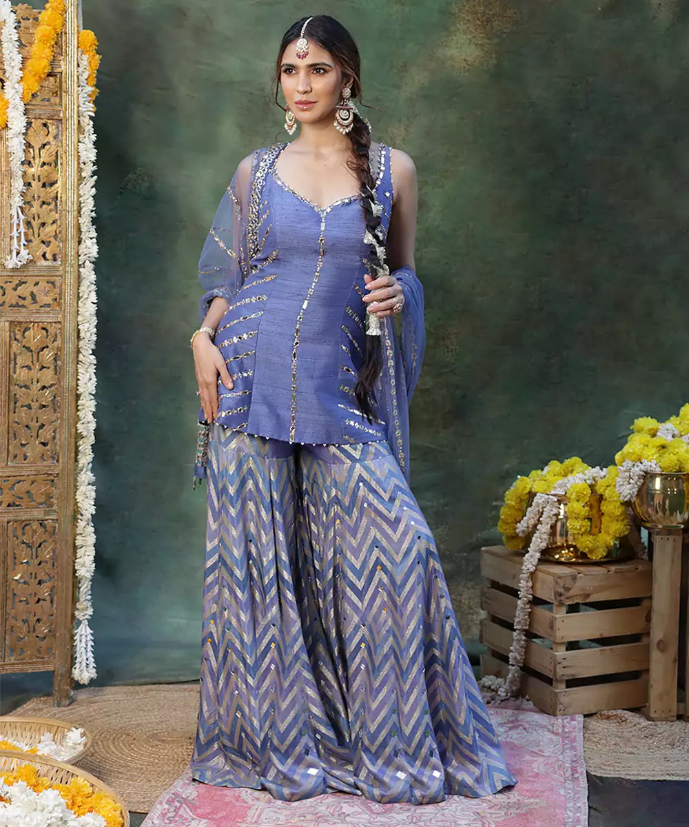 A Striking Blue Sharara Set Crafted In Rich Raw Silk And Detailed With Elegant Embroidery For A Festive Finish. The Luxurious Texture And Graceful Flare Create A Flattering Silhouette, Making It Ideal For Weddings, Evening Celebrations, And Special Occasions With Timeless Ethnic Charm.