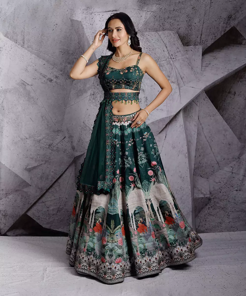 Enveloped Between Floral And Regal Motifs Lies This Lehenga. The Digitally Printed Green Lehenga Has An Embroidered Belt With The Brands Logo In The Center. The Blouse Is Highlighted With Hand Embroidery Done With Gold Sequences And Beads By Our In House Artisans. It Is Paired With A Bordered Dupatta An Embroidered Waist Belt.