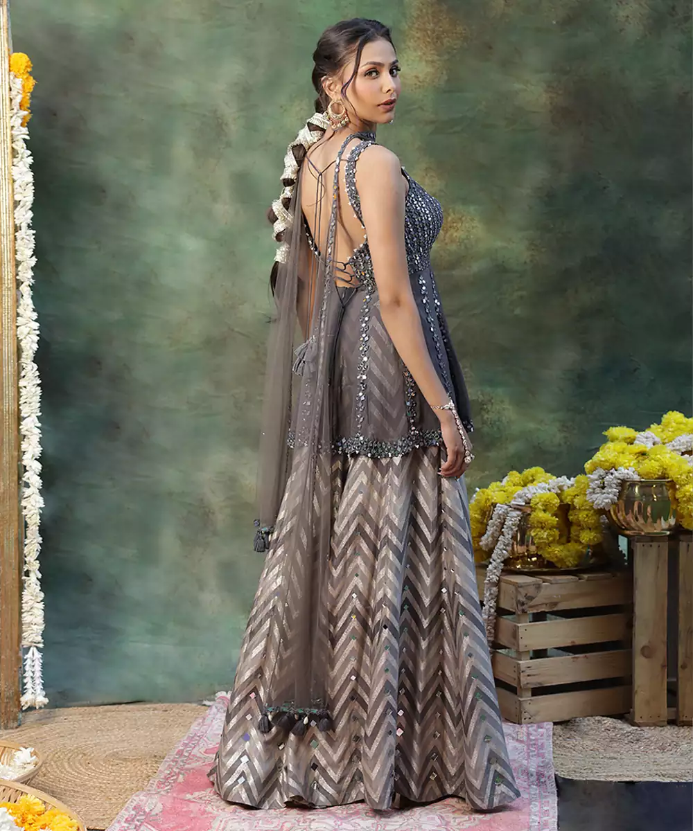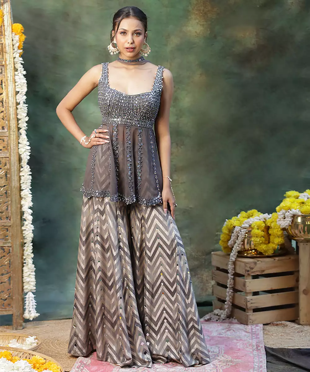 An Elegant Grey Sharara Set Made In Lightweight Georgette And Highlighted With Refined Embroidery. The Airy Drape And Flowing Silhouette Offer Effortless Grace, Making It Suitable For Festive Lunches, Cocktail Evenings, And Contemporary Ethnic Occasions With Understated Sophistication.