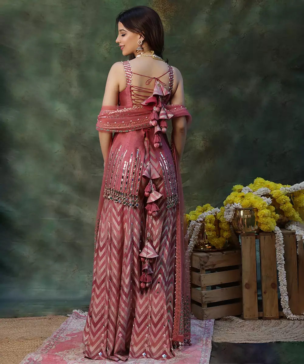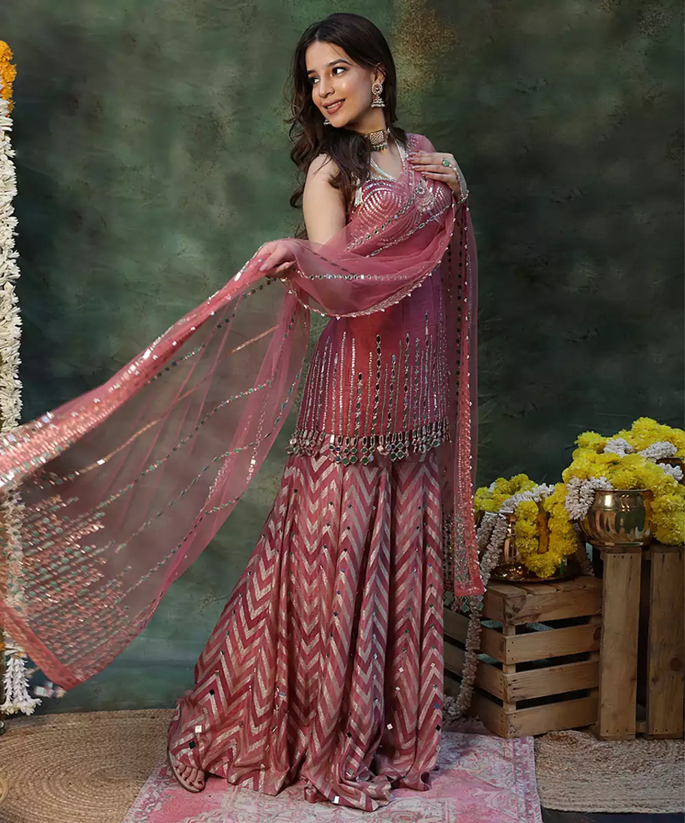 A Graceful Pink Sharara Set In Lustrous Raw Silk, Enhanced With Delicate Embroidery For A Refined Ethnic Appeal. The Flattering Flare And Soft Sheen Bring Festive Charm, Making It Perfect For Wedding Functions, Family Celebrations, And Stylish Daytime Festivities.