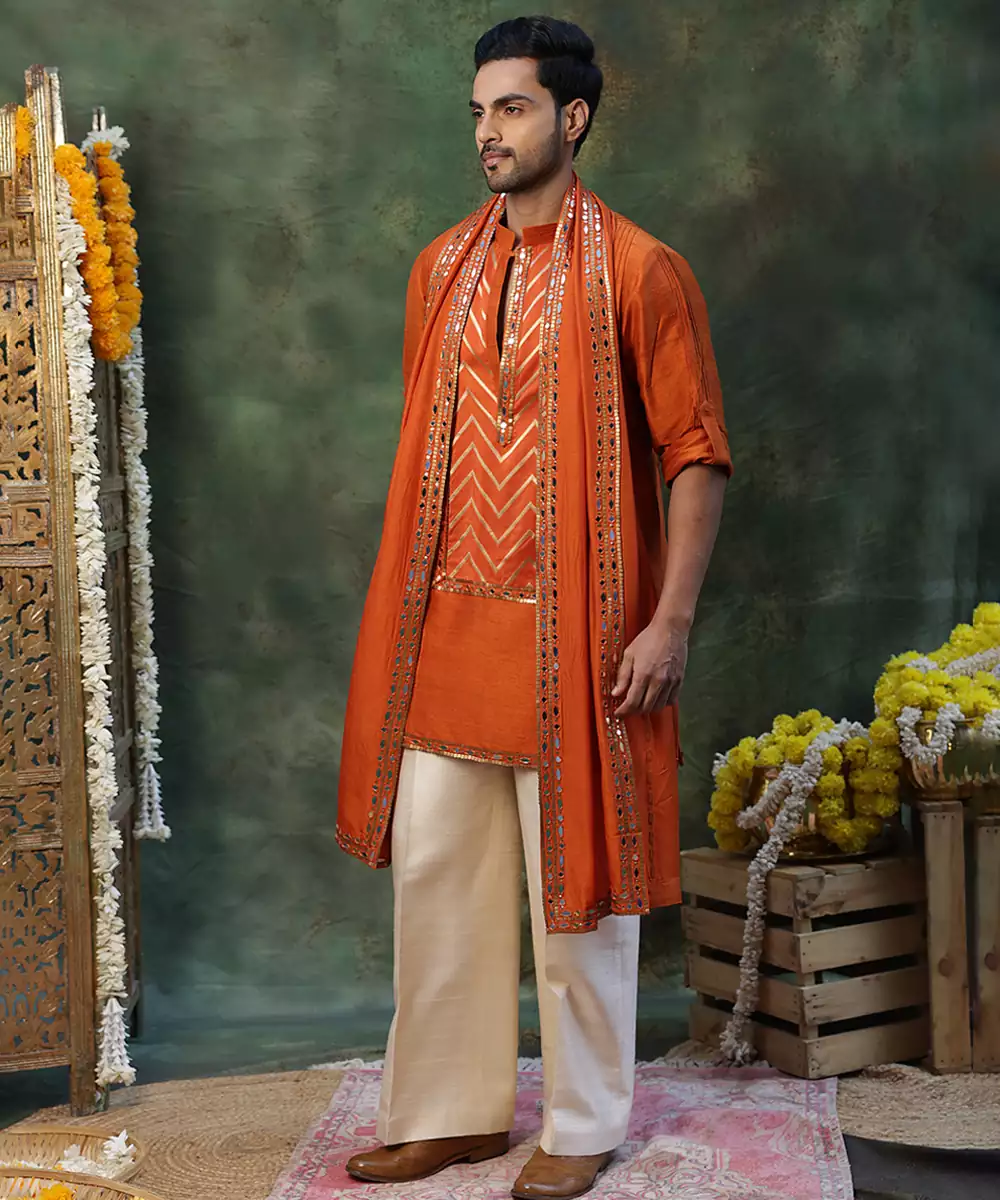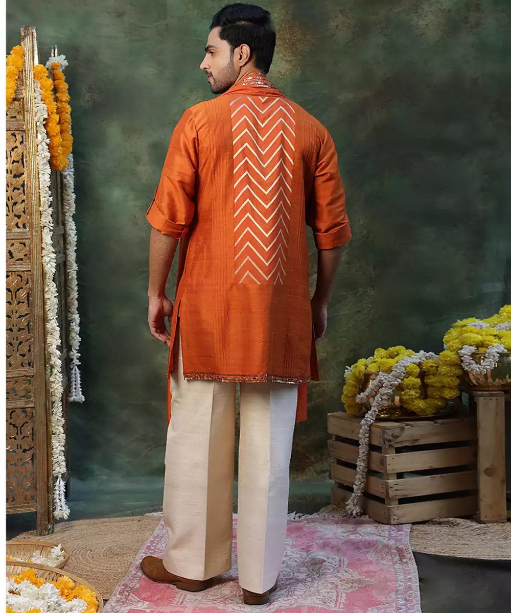 This Rust Orange Silk Kurta Set Features Intricate Embroidery That Adds Richness And Depth To Its Warm Hue. The Luxurious Silk Fabric Gives A Soft Sheen And Elegant Fall, Making It Ideal For Festive Functions, Pujas, And Celebratory Gatherings With A Touch Of Ethnic Sophistication.