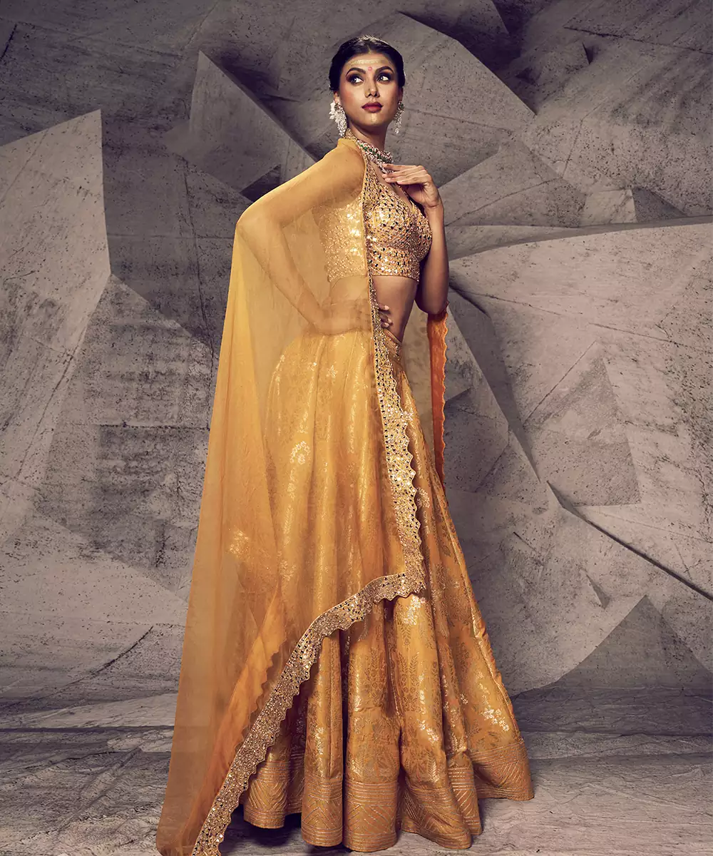 The Anant Genda Lehenga Embellished With Gota Thread In The Border And Belt Of Brocade Woven Lehanga Paired With Embroidered Mirror Work Blouse And Scallop Border Organza Dupatta .