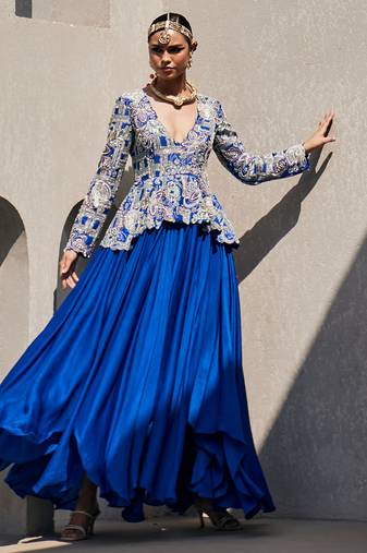 The Shimmering Blue Gown Saree Embellished With Floral Embroidery .The Sleeves Are Adorned With Kardana Tassels .