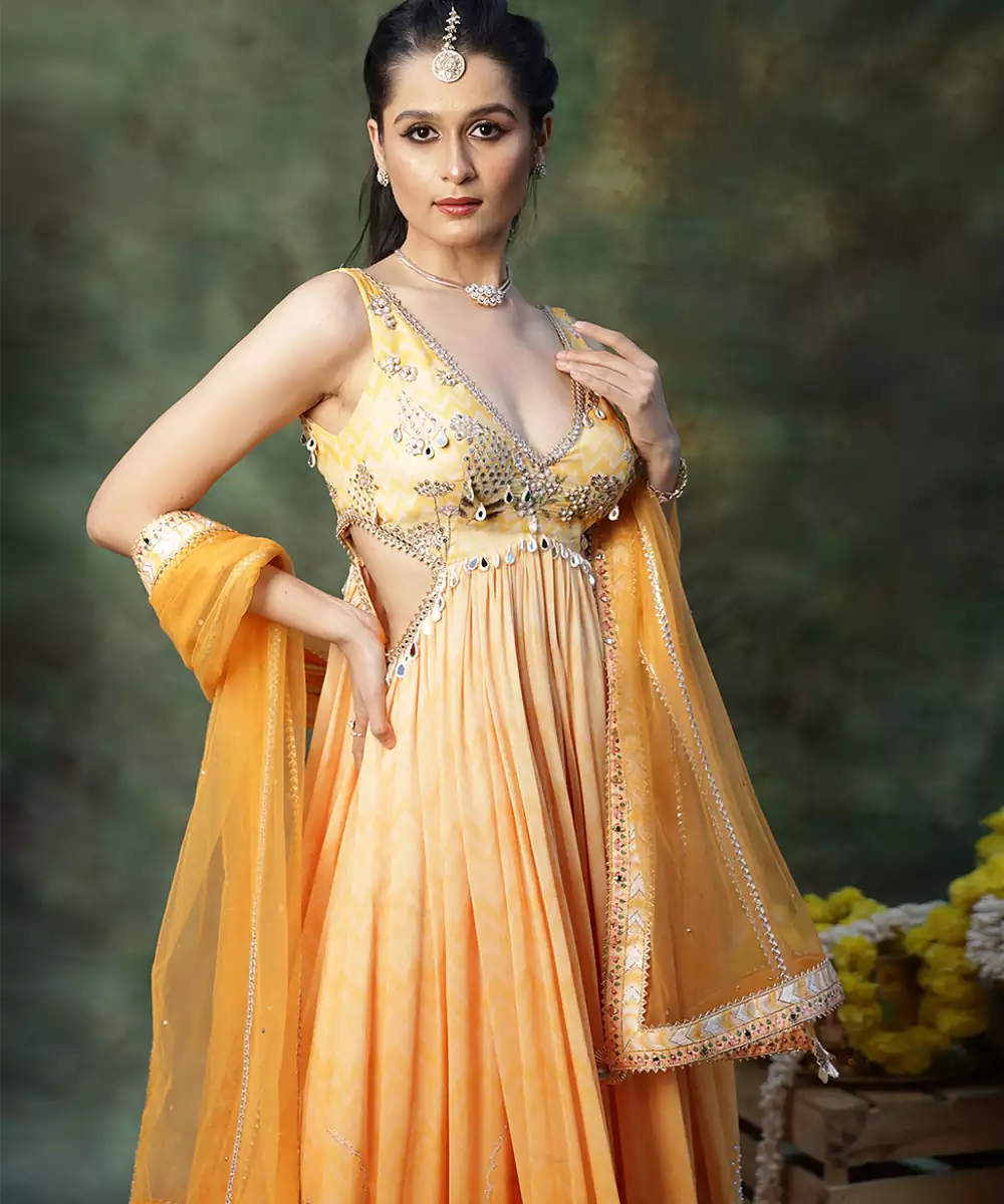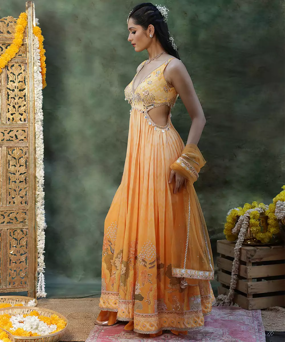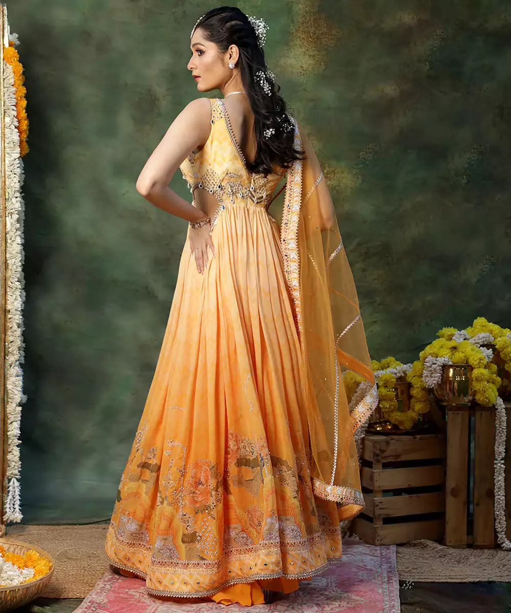 Glow With Festive Elegance In This Yellow Embroidered Georgette Anarkali Set, Crafted From Lightweight, Flowy Fabric With A Soft Drape. Intricate Embroidery Enhances Its Regal Charm, While The Flared Silhouette Creates Graceful Movement. Perfect For Weddings, Haldi Ceremonies, And Joyful Celebratory Occasions.