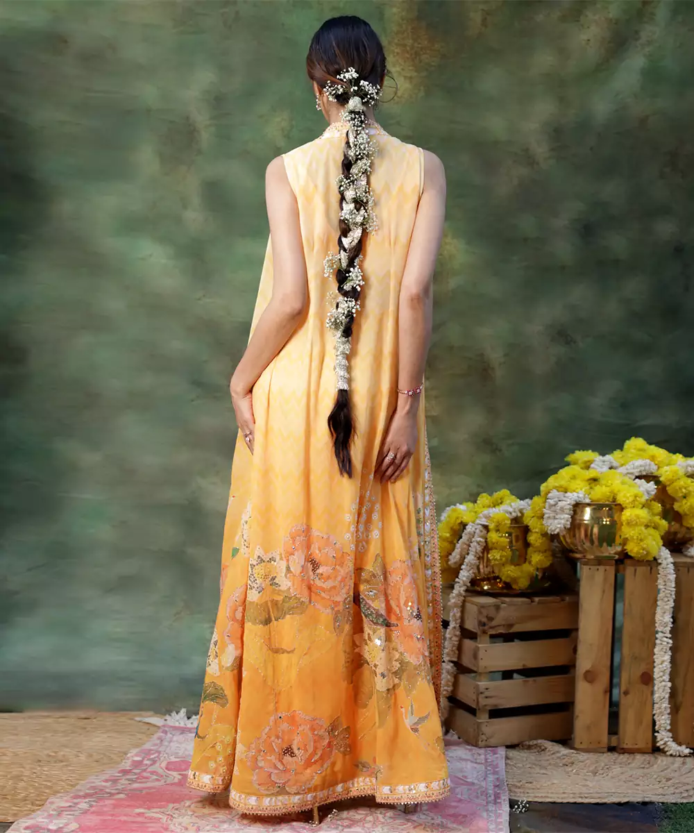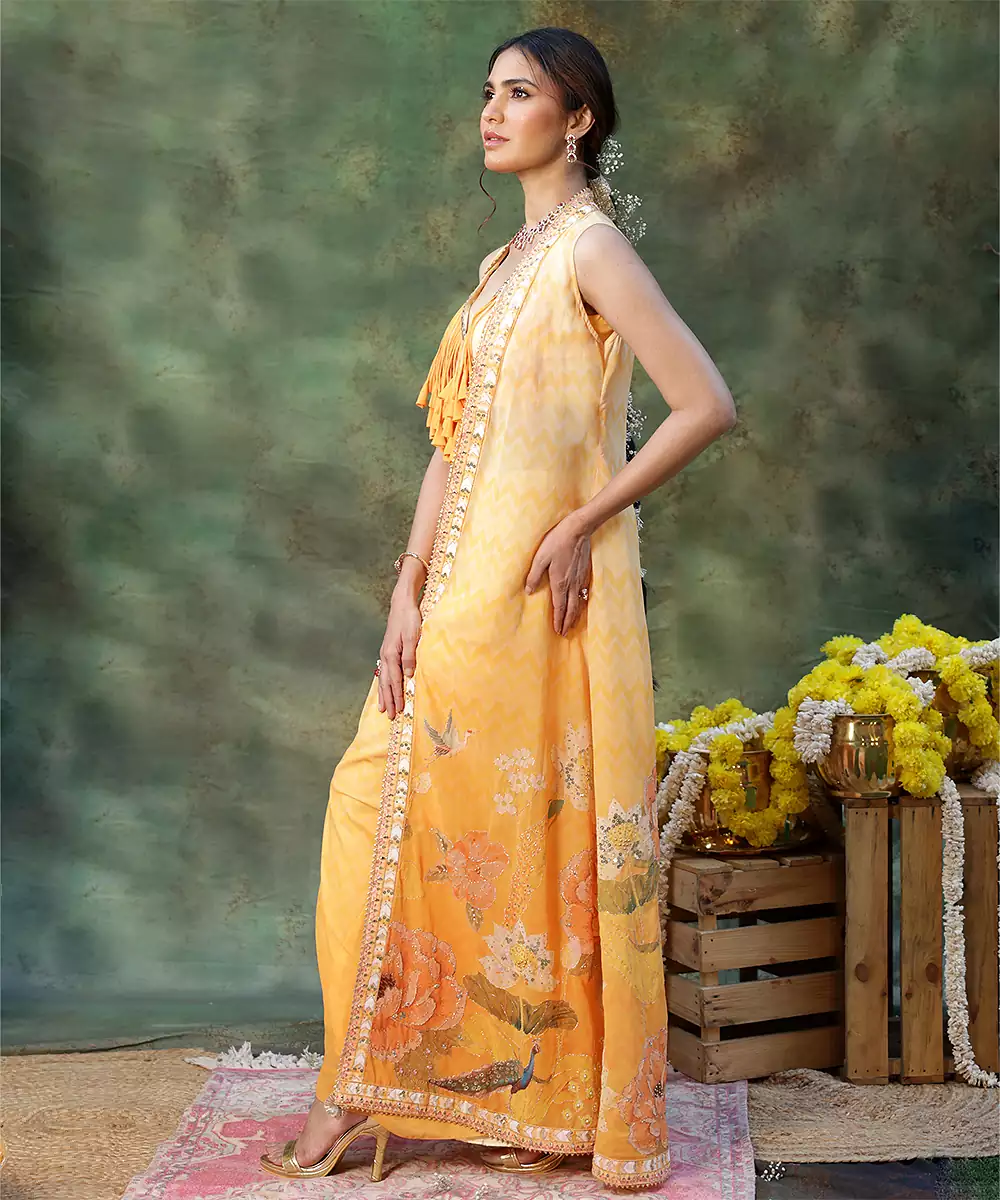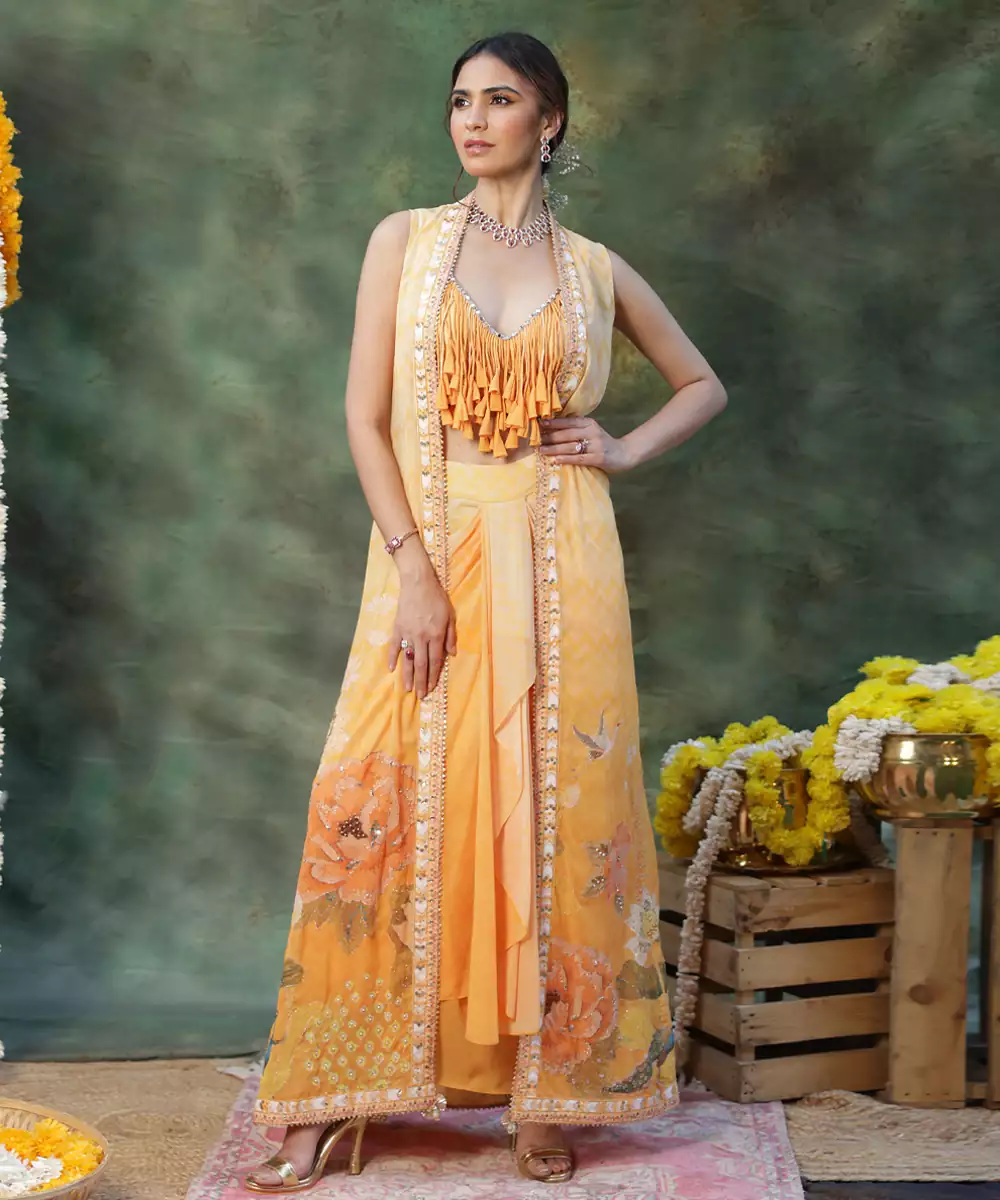 Shine With Graceful Charm In This Yellow Embroidered Georgette Lehenga Set, Crafted From Lightweight, Flowy Fabric With A Soft Drape. Intricate Embroidery Adds Festive Elegance, While The Flared Silhouette Enhances Movement And Comfort. Paired With A Matching Blouse And Dupatta, It Is Perfect For Weddings, Haldi Functions, And Joyful Celebrations.