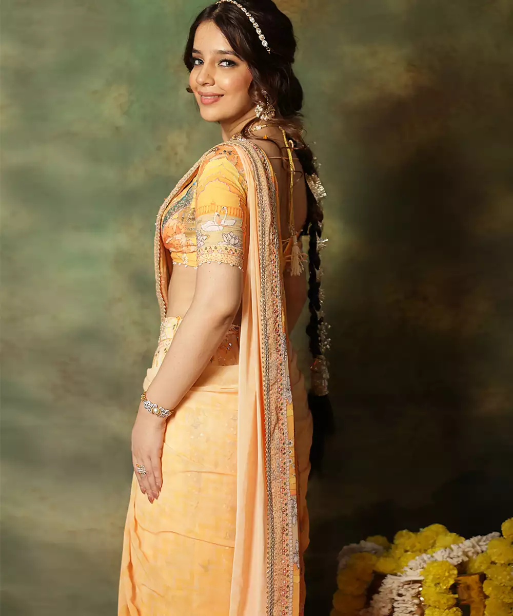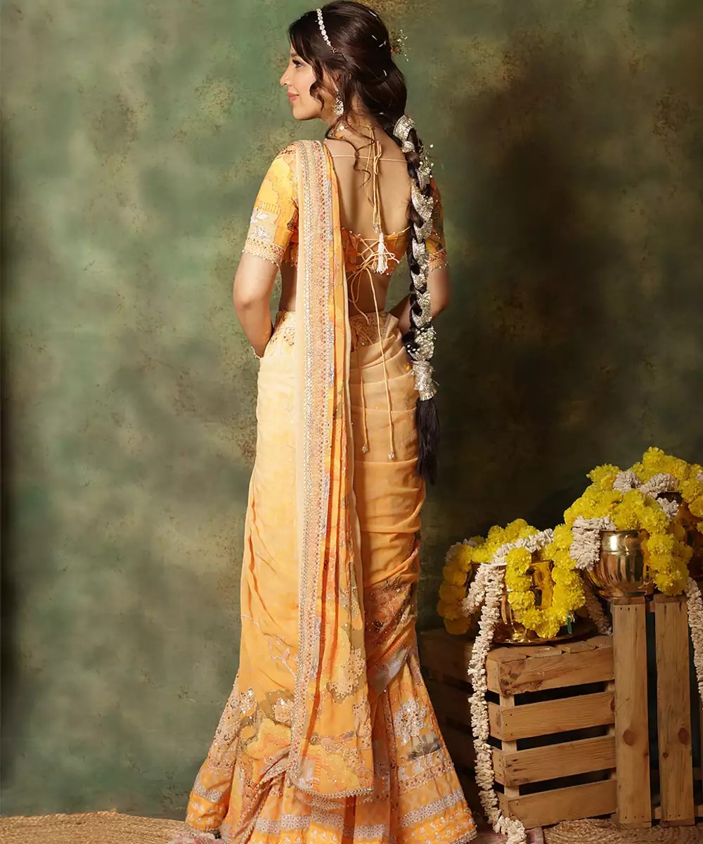 "Radiate Cheerful Elegance In This Yellow Embroidered Georgette Saree, Crafted From Lightweight, Flowy Fabric With A Soft, Graceful Drape. Intricate Embroidery Adds Festive Charm And Refined Detail. Paired With A Matching Blouse, It Is Perfect For Weddings, Haldi Functions, And Joyful Celebratory Occasions.