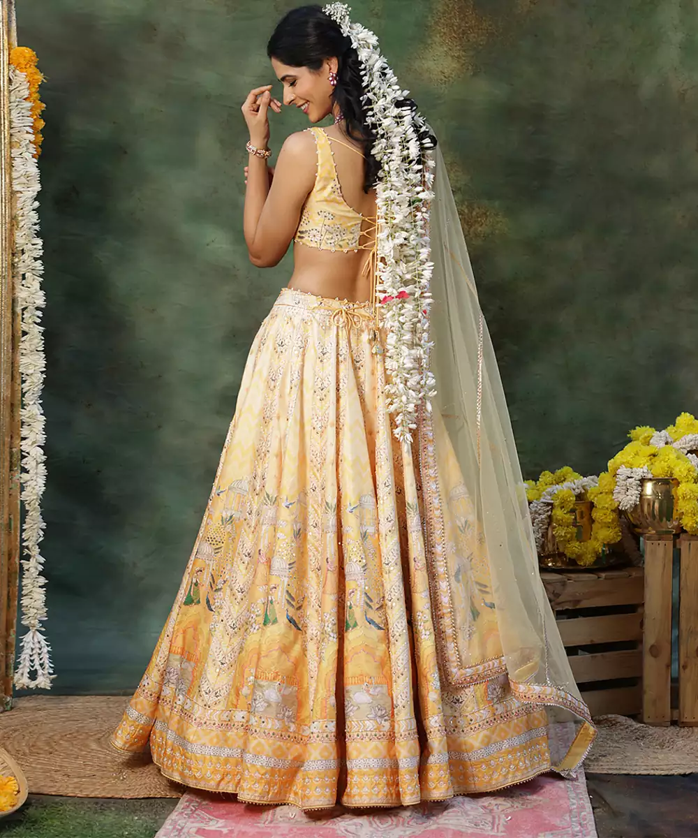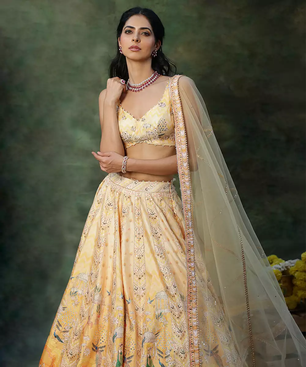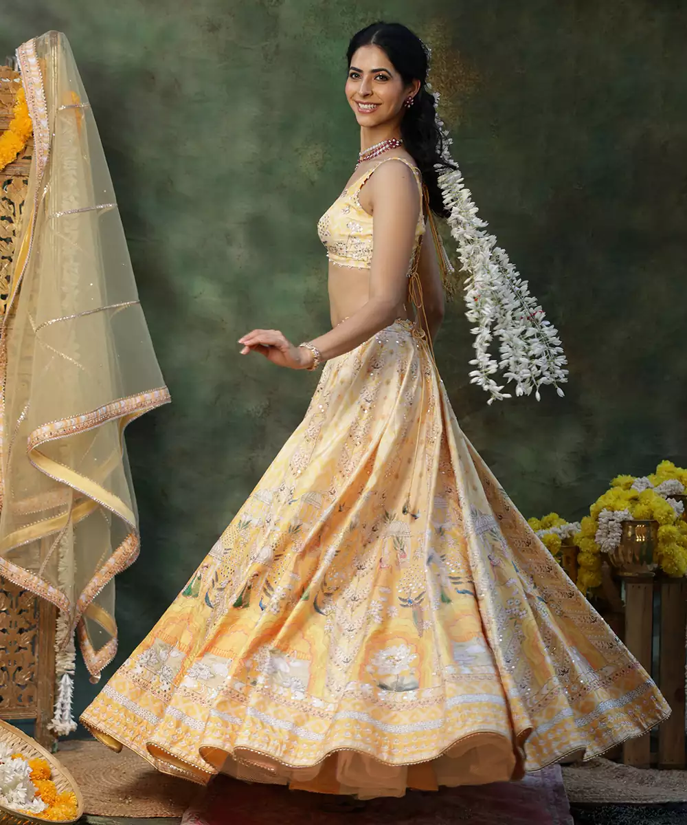 Radiate Festive Charm In This Yellow Embroidered Raw Silk Lehenga Set, Featuring A Rich Texture And Subtle Natural Sheen. Intricate Embroidery Adds A Regal Touch, While The Graceful Flare Ensures Elegant Movement. Paired With A Matching Blouse And Dupatta, It Is Perfect For Weddings, Haldi Ceremonies, And Celebratory Occasions.