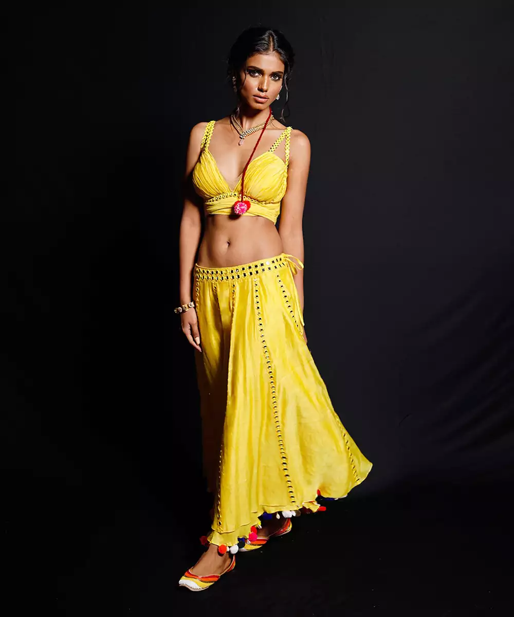 Make A Bold Fashion Statement In This Vibrant Yellow Lehenga Choli Set, Crafted For The Free Spirited Diva. The Sleeveless Choli Features A Flattering Plunge Neckline And Intricate Mirror Work Straps, While The Flared Lehenga Is Adorned With Linear Mirror Detailing And Playful Multi Colored Pom Poms At The Hem.