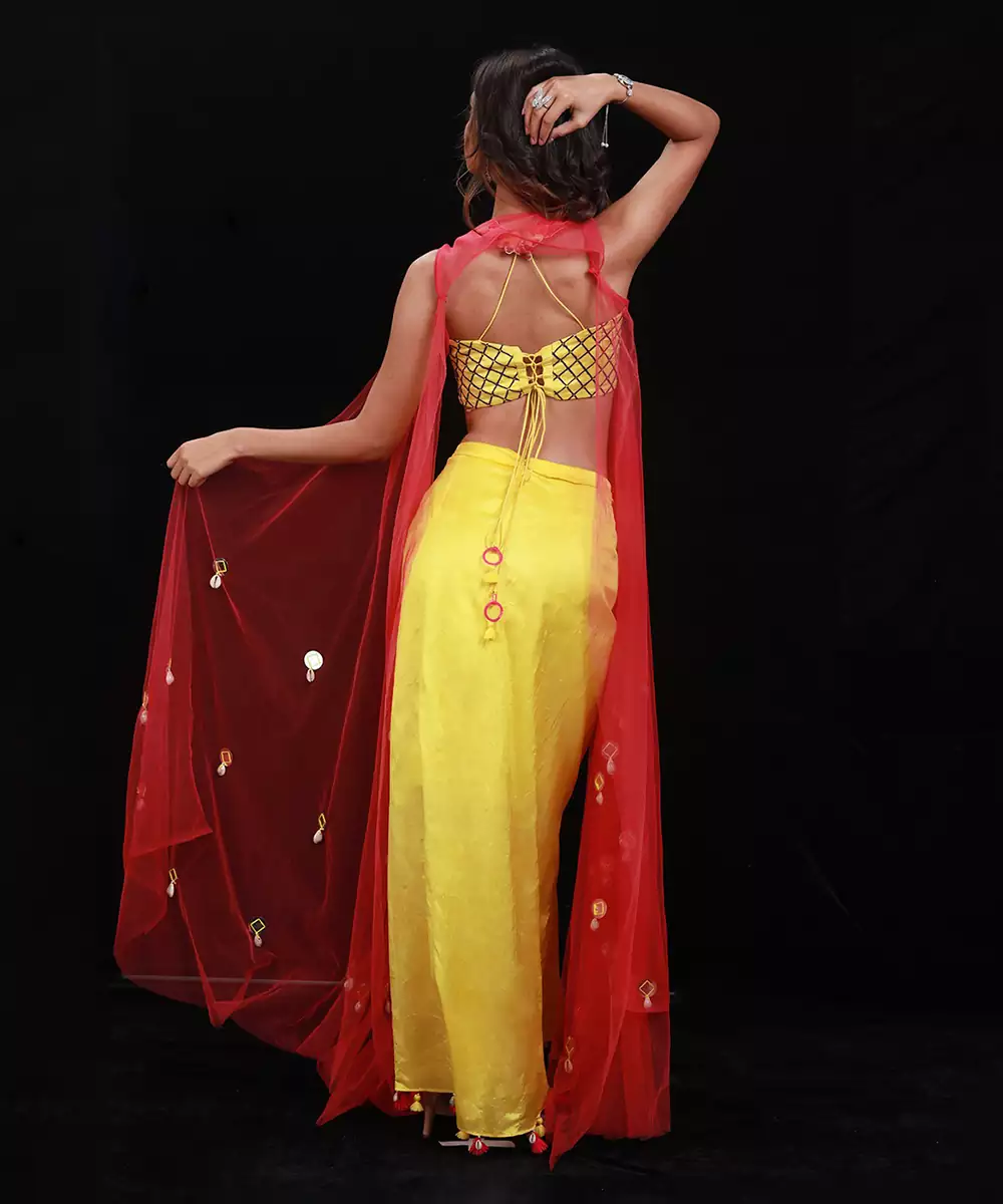 Our Phoolon Ki Haldi Skirt Set Is Enveloped Between A Flowy Net Jacket And A Drapey Skirt. It Has Hand Work Done Using Shells, Resham Thread, Wool And Polymer To Create Fusion Embroidery. It Consists Of A Detailed Embellished Blouse And A Knotted Skirt To Create An Indo Western Look. The Chanderi Of This Outfit Is Handloomed With Love By Women Weavers From The Interiors Of Madhya Pradesh. We Can Customize The Outfit Colour And The Blouse Design For You.