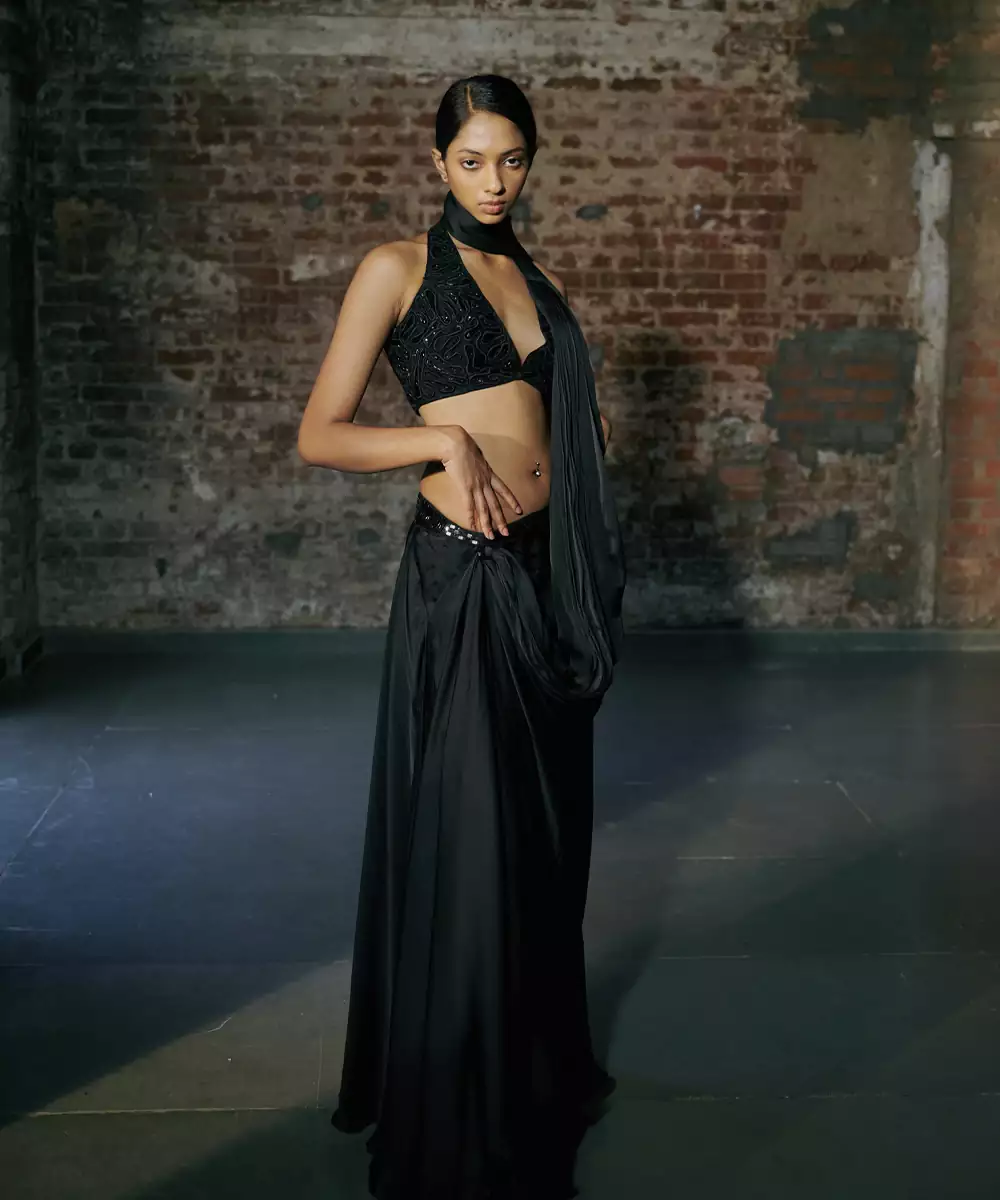 Chemy Black Satin Organza Drape Saree With Hand Emb Tulle Blouse Colour: Black Fabric: Satin Components : 1 Saree / 1 Blouse