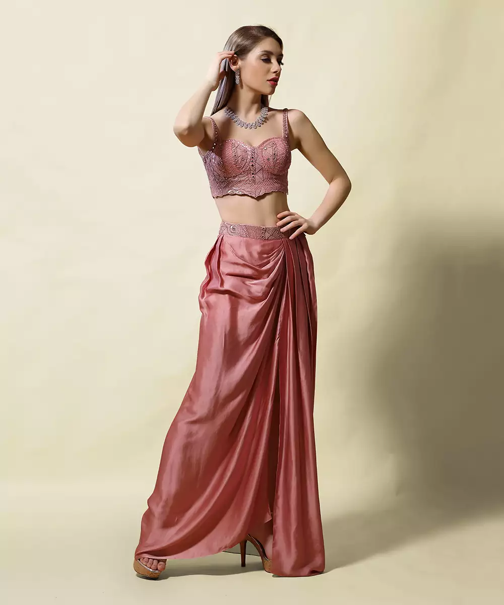 Pink Embroidered Silk Choli With Pre Drape Skirt Paired With An Embroidered Jacket.