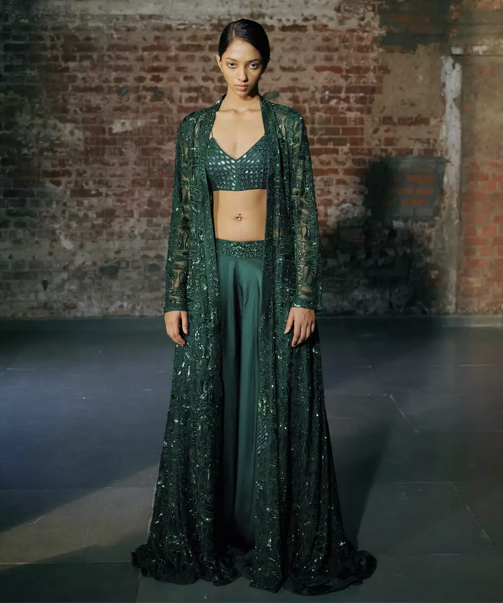 Cyme Hand Emb Blouse And Long Jacket Paired With Flared Sharara Colour: Emerald Fabric: Satin Components : 1 Kurta / 1 Sharara / 1 Cape