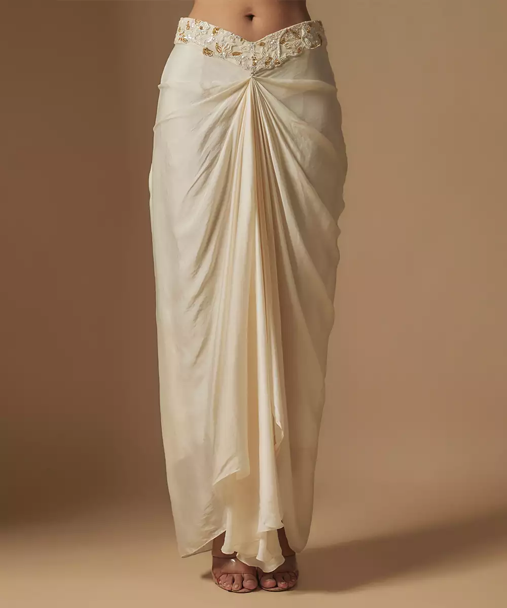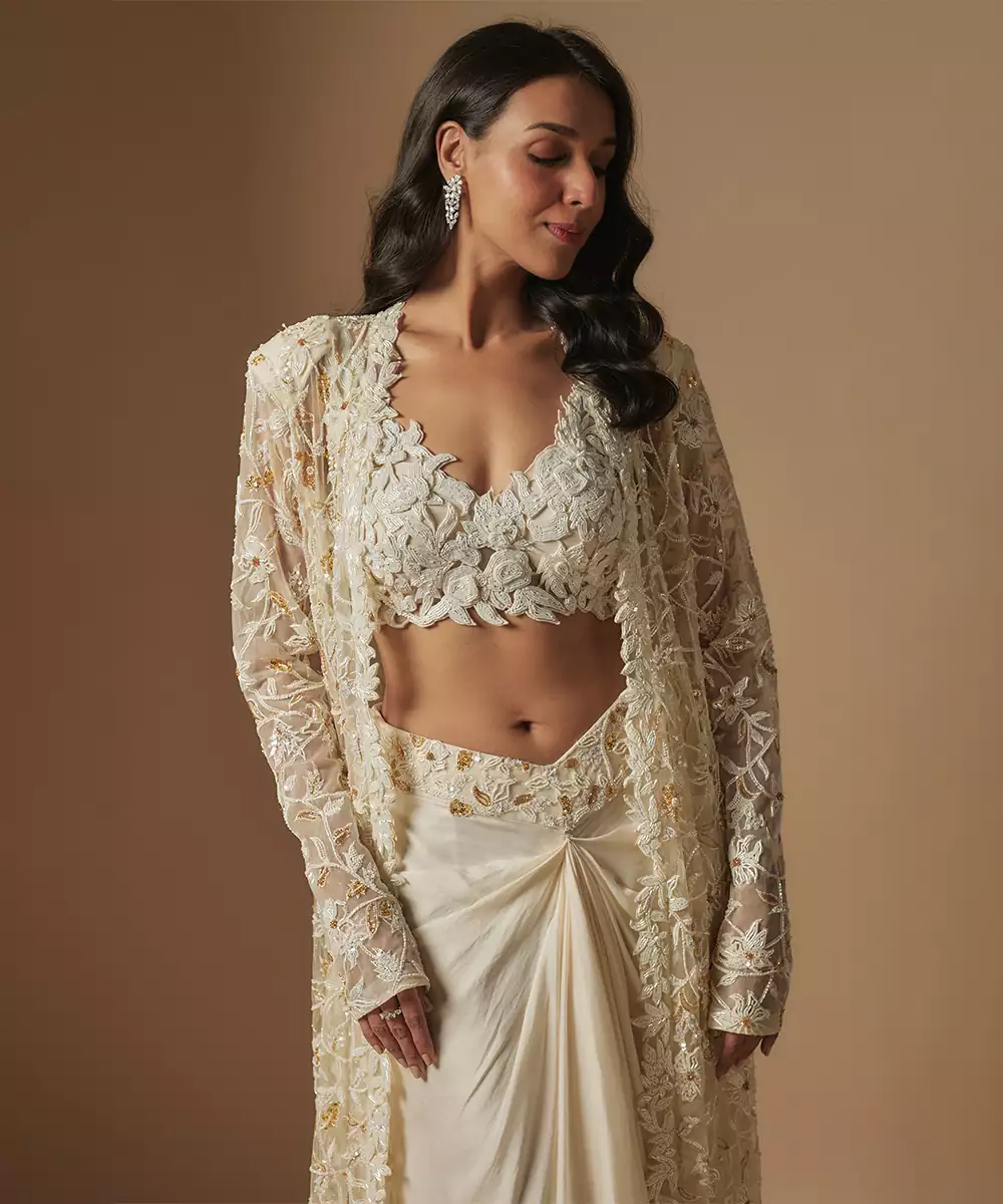 Moon Pie Full Embroidered Blouse Paired With Drape Skirt And Emb Full Jacket Colour: Ivory Fabric: Satin Organza Components : 1 Skirt / 1 Blouse / 1 Jacket