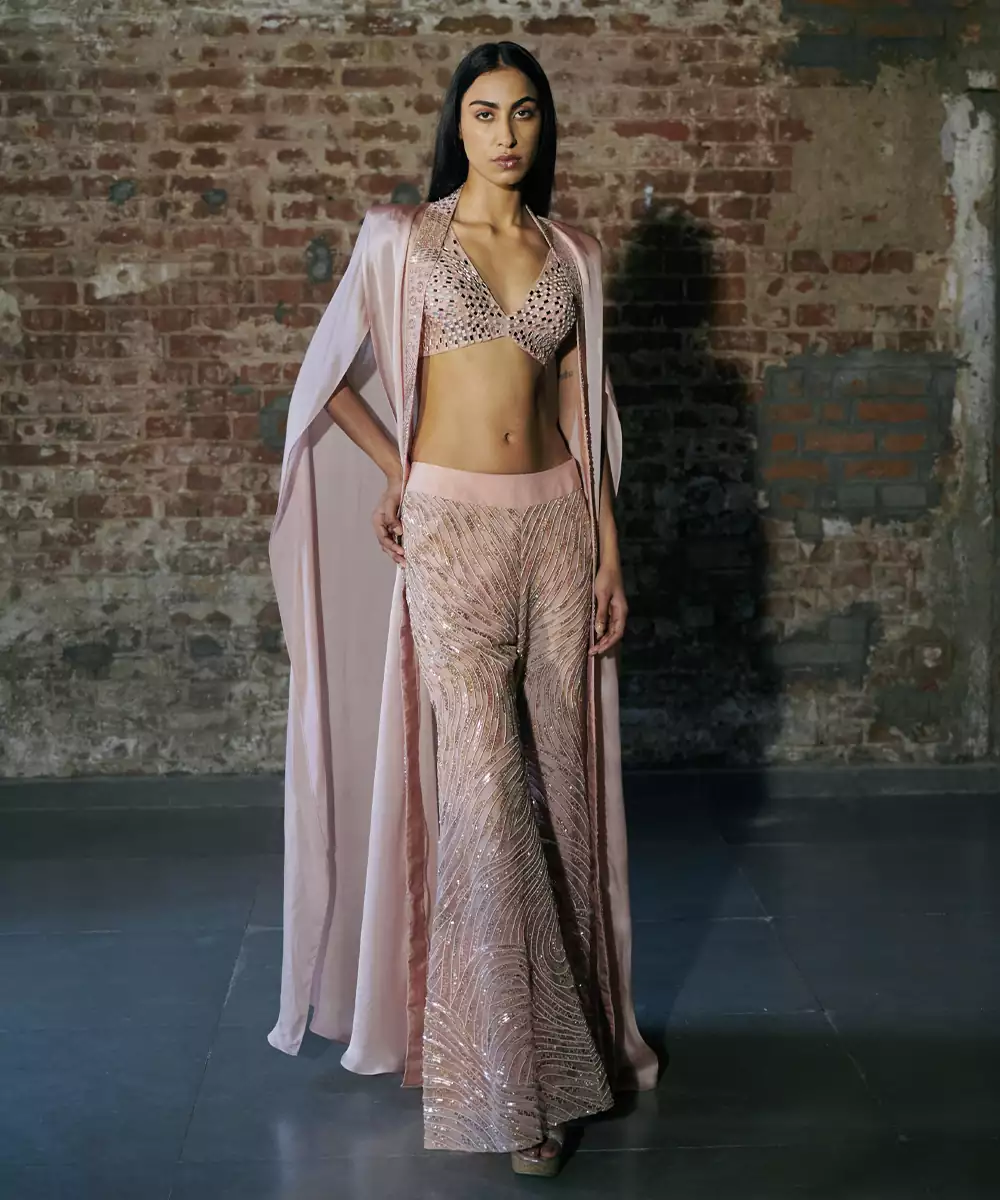 Efilys Hand Emb Sharara With Long Cape And Mirror Blouse Colour: Baby Pink Fabric: Satin Components : 1 Kurta / 1 Sharara / 1 Cape