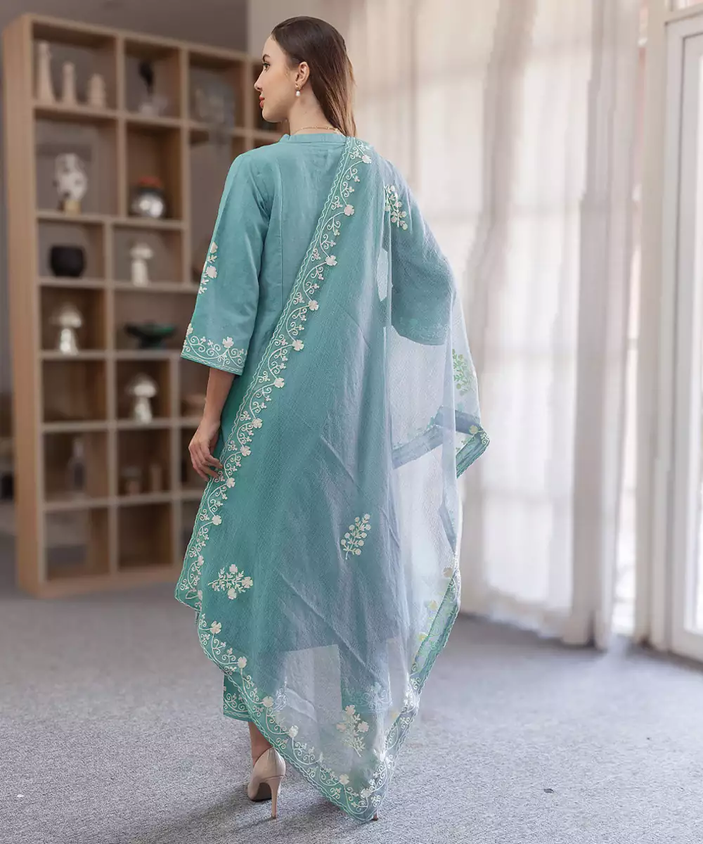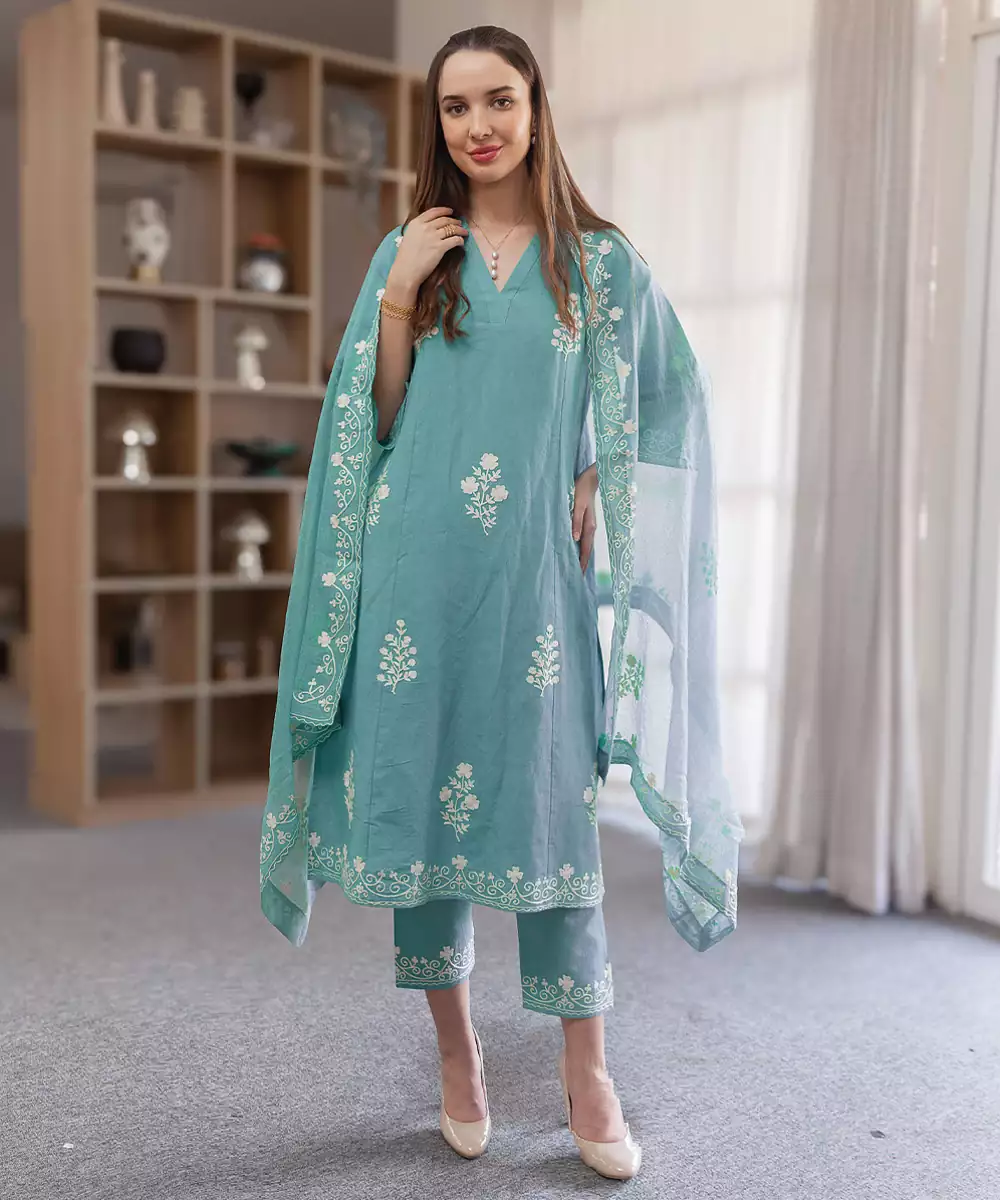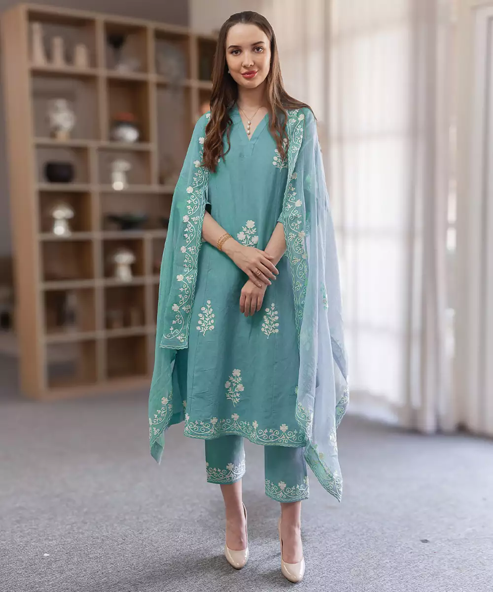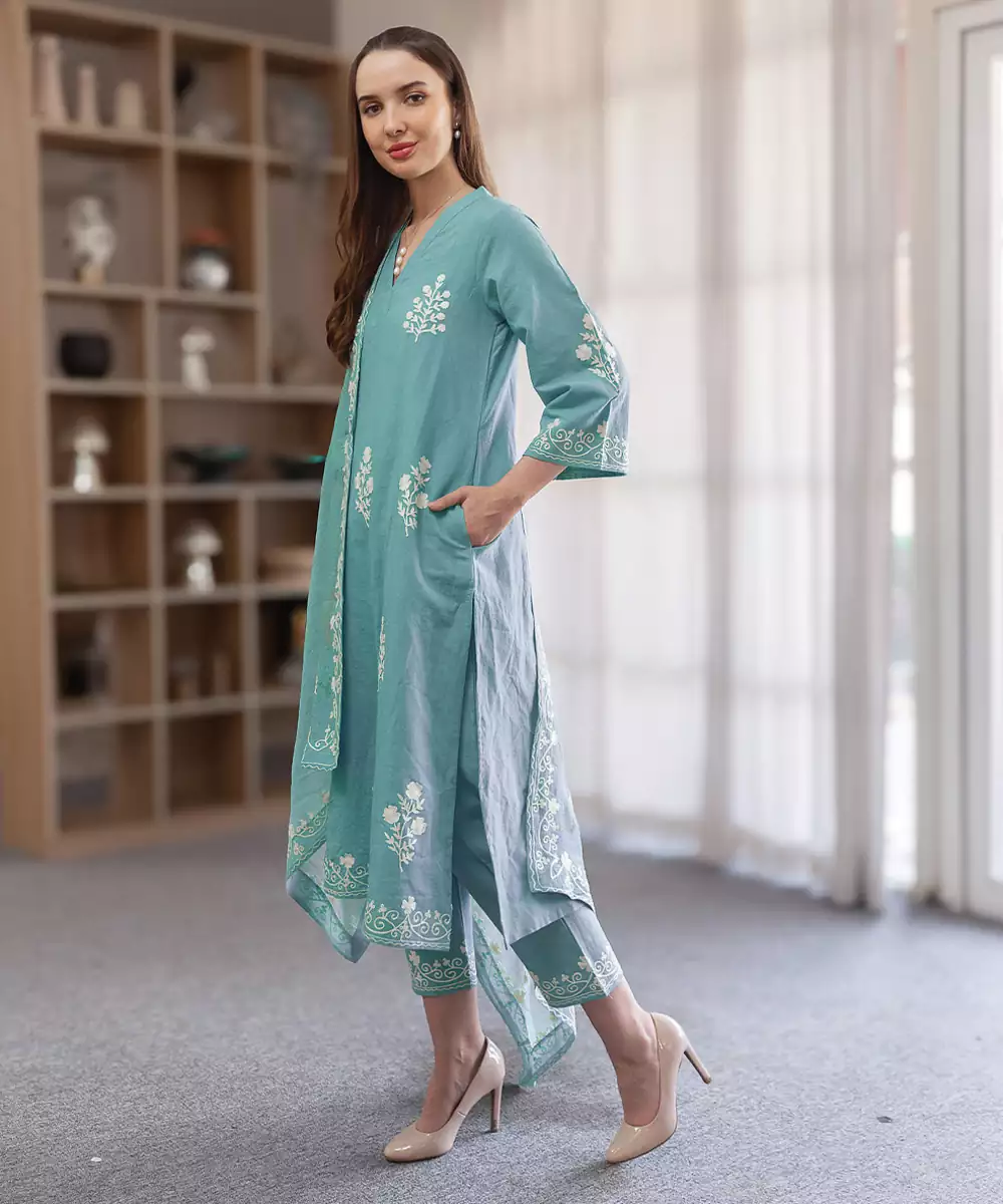 Crafted In Breathable Linen, This Aqua Blue Embroidered Straight Suit Set Offers A Refreshing And Elegant Appeal. The Subtle Embroidery Enhances Its Charm, Making It Suitable For Casual And Festive Wear. A Perfect Choice For Those Seeking Comfort With A Stylish And Graceful Finish.