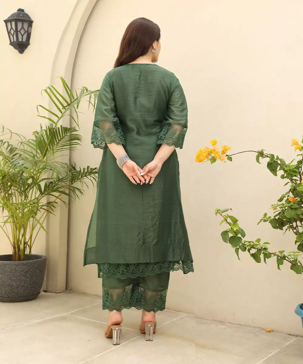 Introducing Our Exquisite "Emerald Elegance" Chanderi Fabric Suit Set, A True Embodiment Of Grace And Sophistication. This Stunning Ensemble Features A Beautifully Crafted Emerald Green A Line Kurta Adorned With Intricate Lace Detailing, Perfectly Complemented By An Elegant Organza Dupatta. Complete With A Slip For Added Comfort, This Ensemble Is Finished With Delicate Embroidered Lace, Adding A Touch Of Luxury To Your Wardrobe. Elevate Your Style With The Timeless Charm Of Our "Emerald Elegance" Suit Set. 45 Inches Kurta 16 Inches Sleeve 36 Inches Pant Lining Attached Pockets On Both Sides In The Pant. Garment Fabric: Chanderi