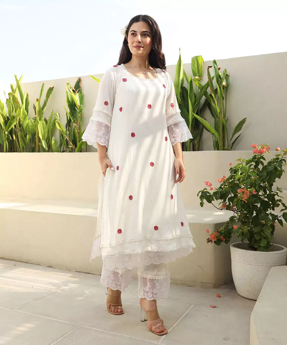 Elevate Your Ethnic Wardrobe With This Stunning White Cotton Gauze Fabric Kurta Set Paired With A Kota Doriya Dupatta. The Full Set Is Beautifully Finished With Intricate Embroidery Work On Organza Lace, Adding A Touch Of Elegance To The Ensemble. The Kurta And Dupatta Feature Beautiful Red Flower Embroidery, Adding A Pop Of Color And Charm To The Outfit. This Ensemble Is Perfect For Special Occasions, Festivities, Or Even Casual Gatherings Where You Want To Make A Style Statement. Floral Elegance: White Cotton Gauze Kurta Set With Kota Doriya Dupatta 45 Inches Kurta 16 Inches Sleeve 36 Inches Pant This Suit Includes Cotton Slip. Pockets On Both Sides In The Pant. Garment Fabric: Cotton Gauze