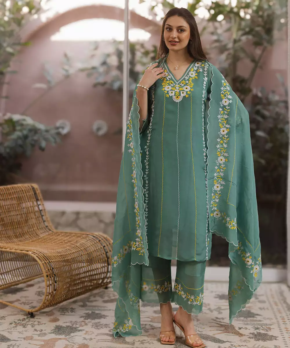 Crafted In Smooth Viscose Fabric, This Green Embroidered Straight Suit Set Offers A Refined And Elegant Look. The Detailed Embroidery Enhances Its Charm, While The Comfortable Fit Makes It Suitable For Various Occasions, Blending Traditional Aesthetics With Contemporary Style Effortlessly.