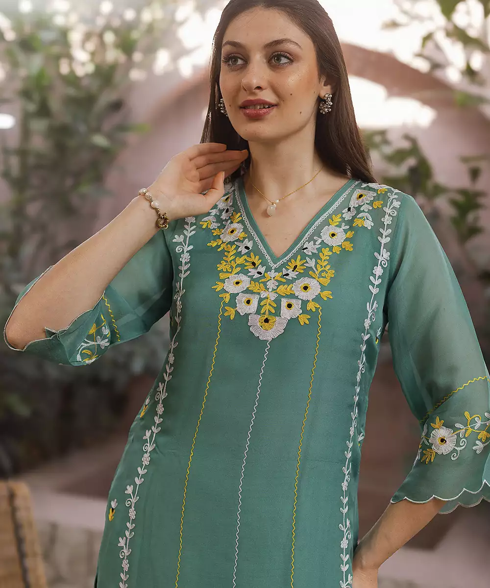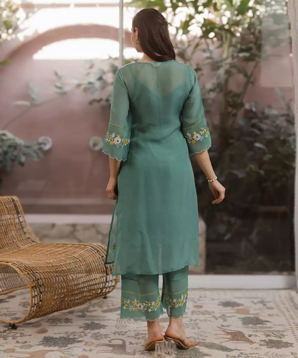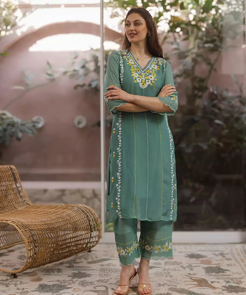 Green Embroidered Viscose Straight Suit Set
