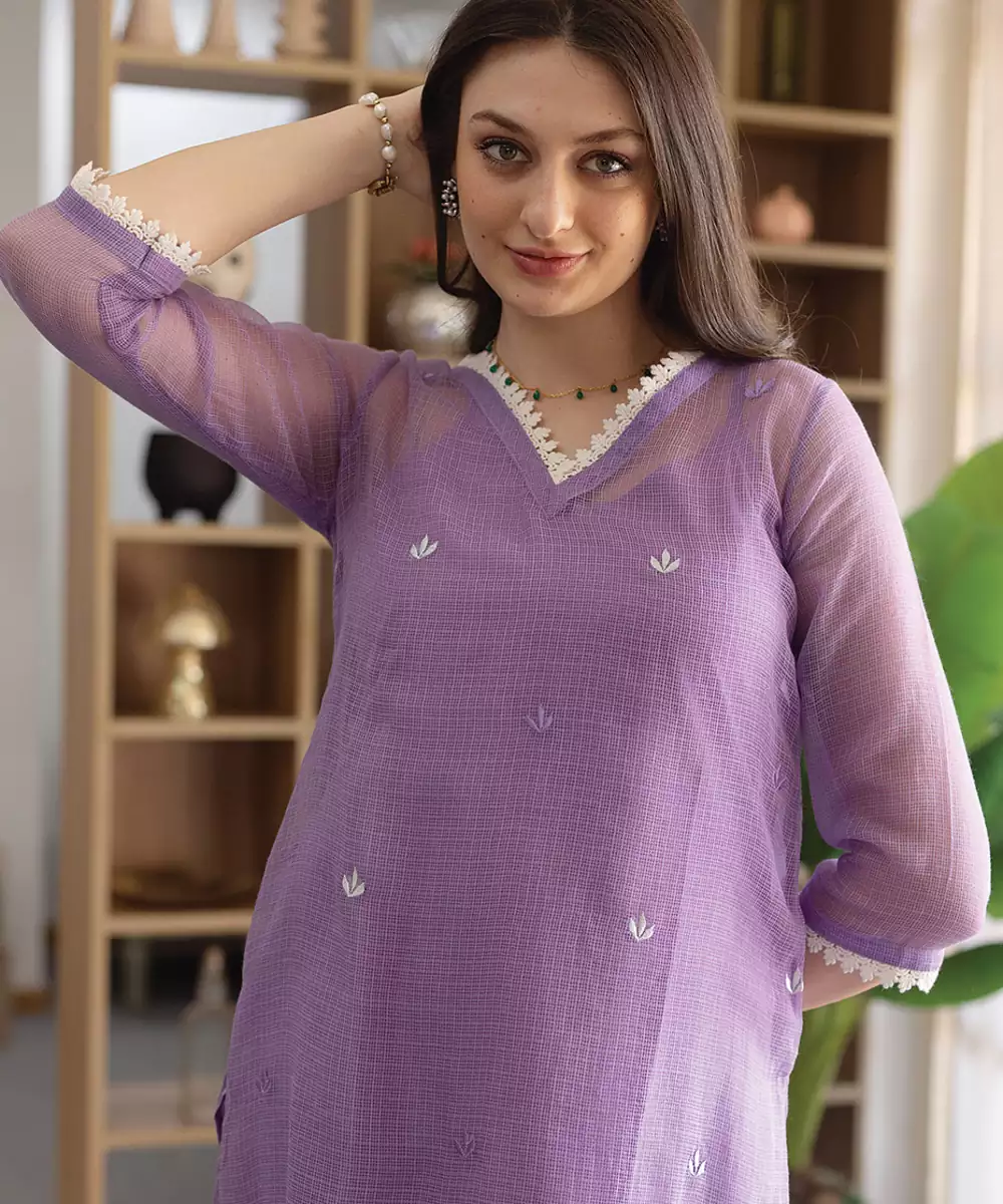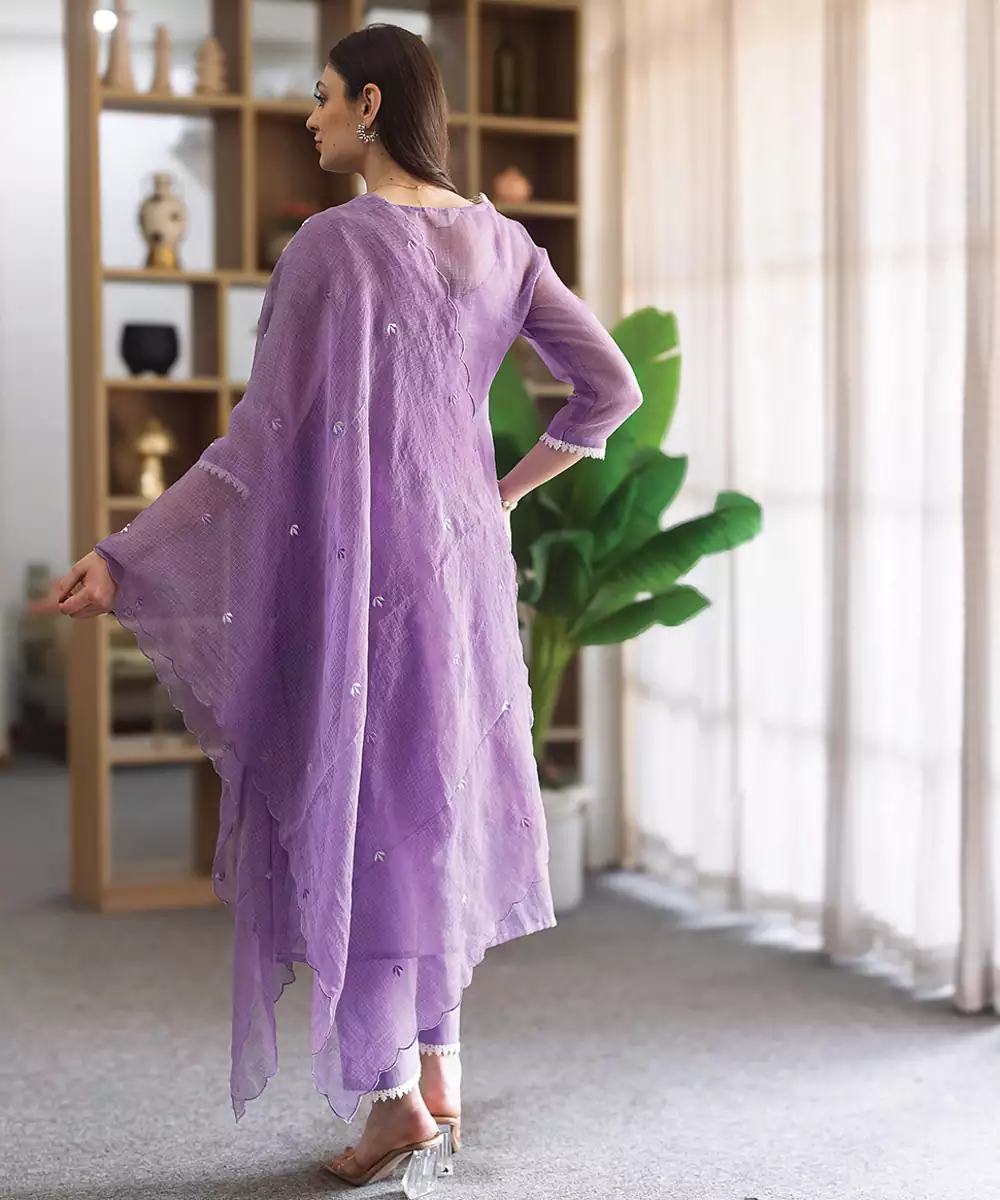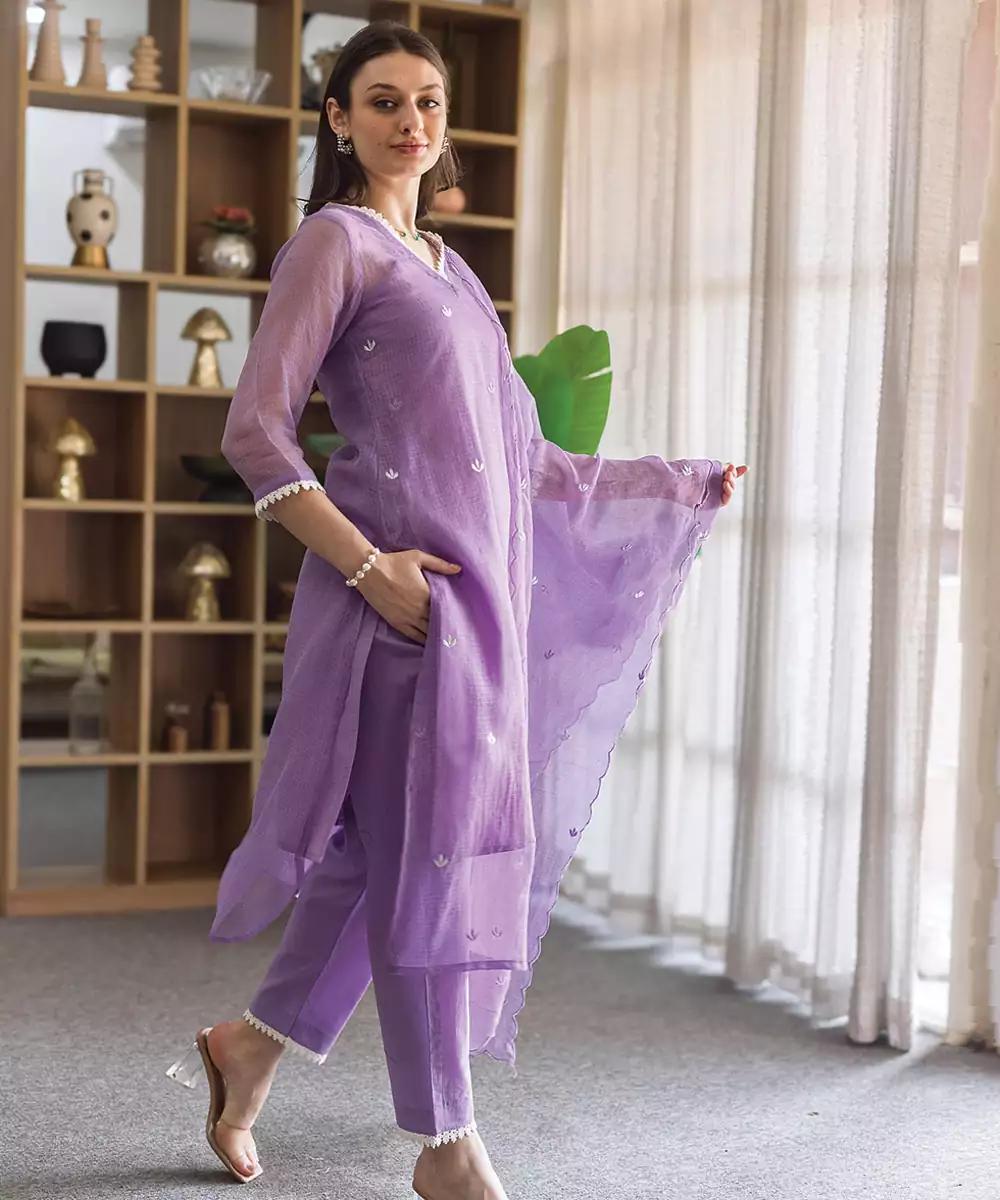 Elegant And Soothing, This Lavender Embroidered Cotton Straight Suit Set Features Delicate Detailing On Soft Fabric. Designed For Comfort And Style, It Is Perfect For Everyday Wear And Festive Occasions, Offering A Graceful And Feminine Look With A Modern Touch.