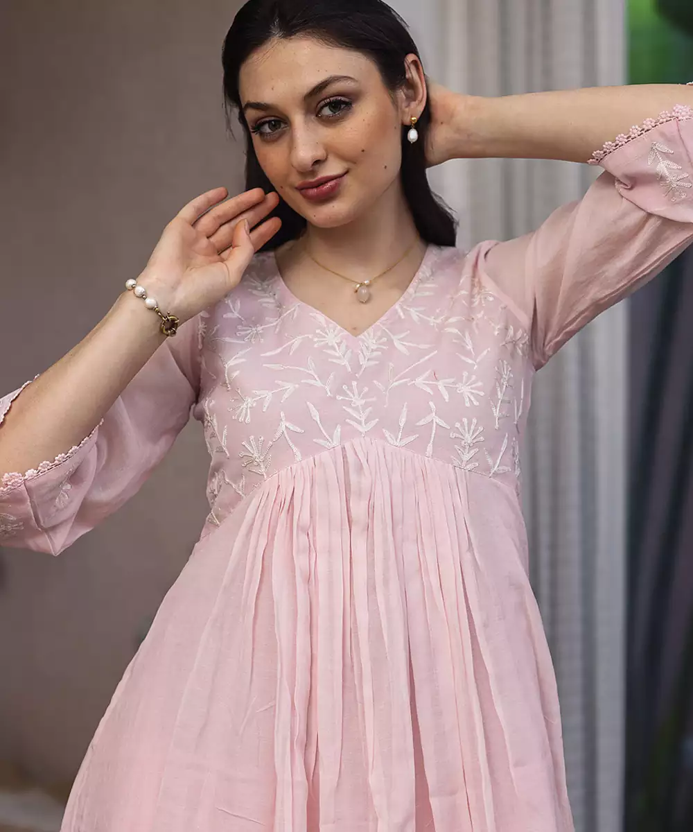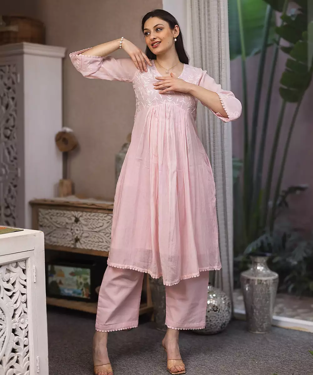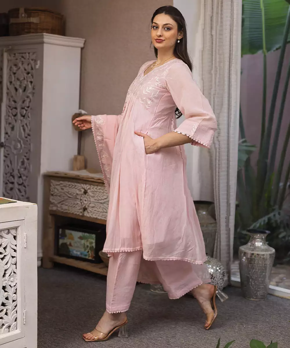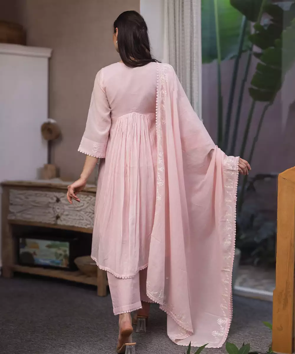 Light Pink Embroidered Mul Chanderi Straight Suit Set