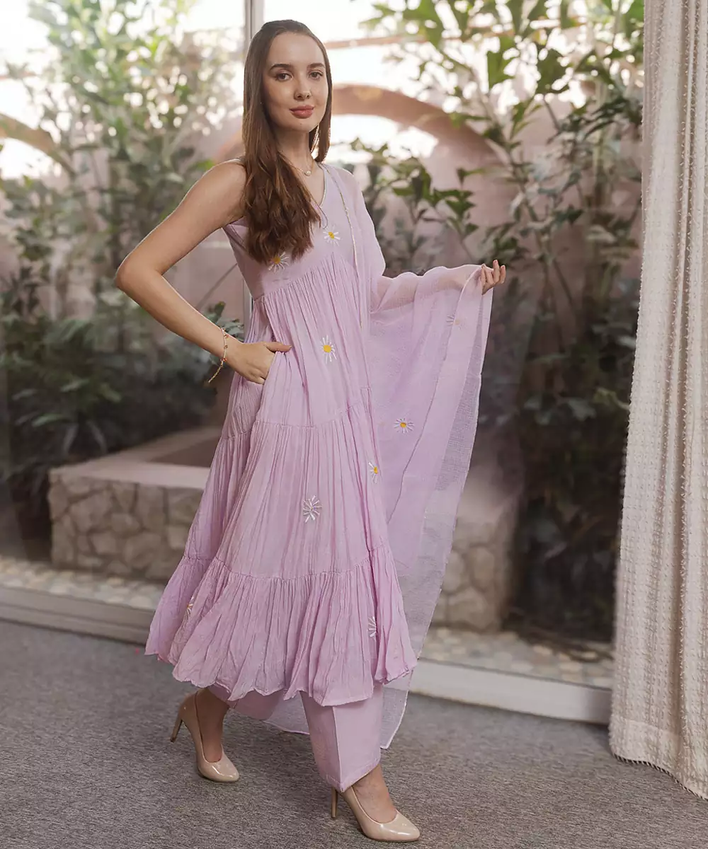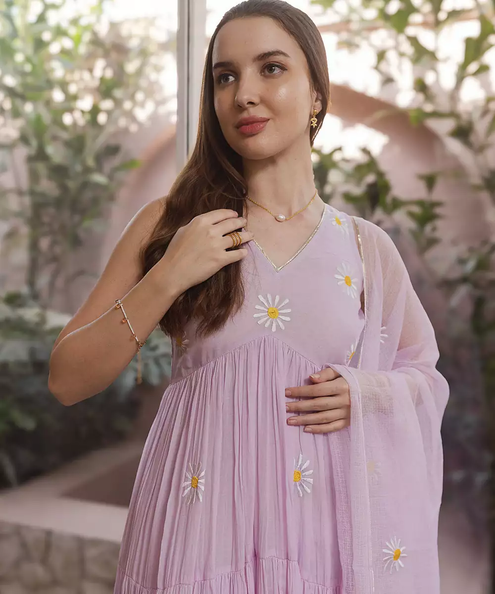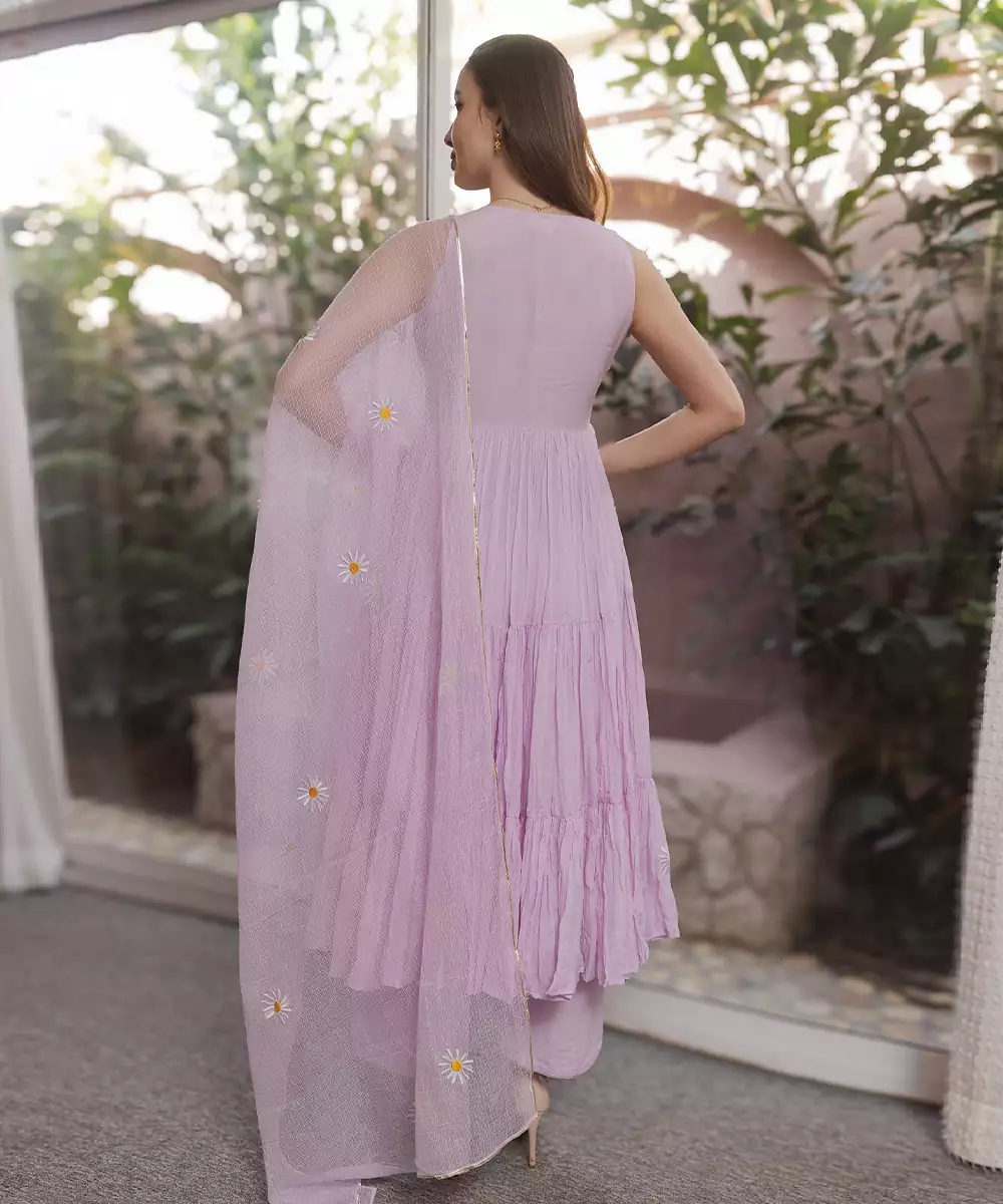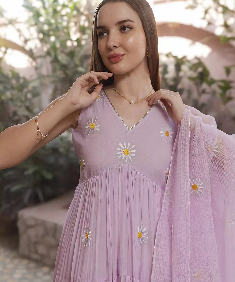 This Lilac Embroidered Mulmul Anarkali Set Features A Delicate Color With Intricate Detailing. The Lightweight Fabric Ensures Comfort, While The Flared Silhouette Adds Elegance. Ideal For Festive Gatherings And Celebrations, It Offers A Graceful And Feminine Look With A Modern Touch.