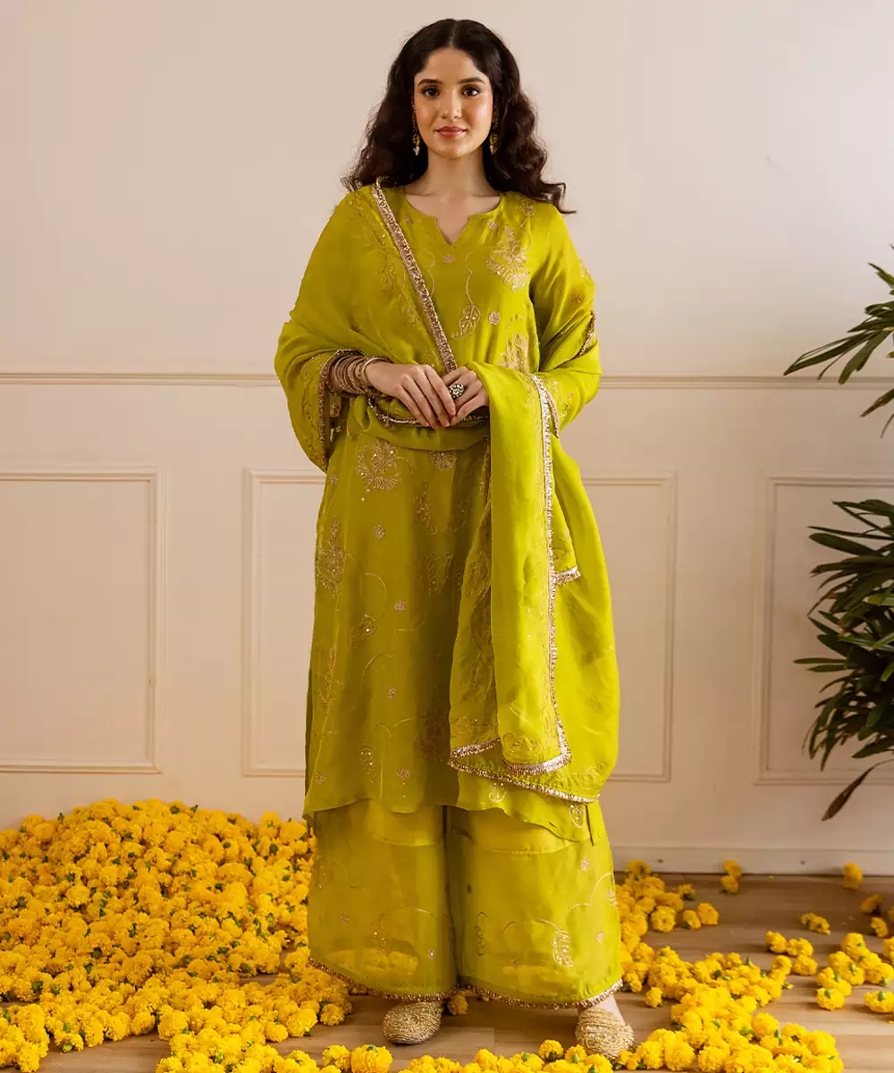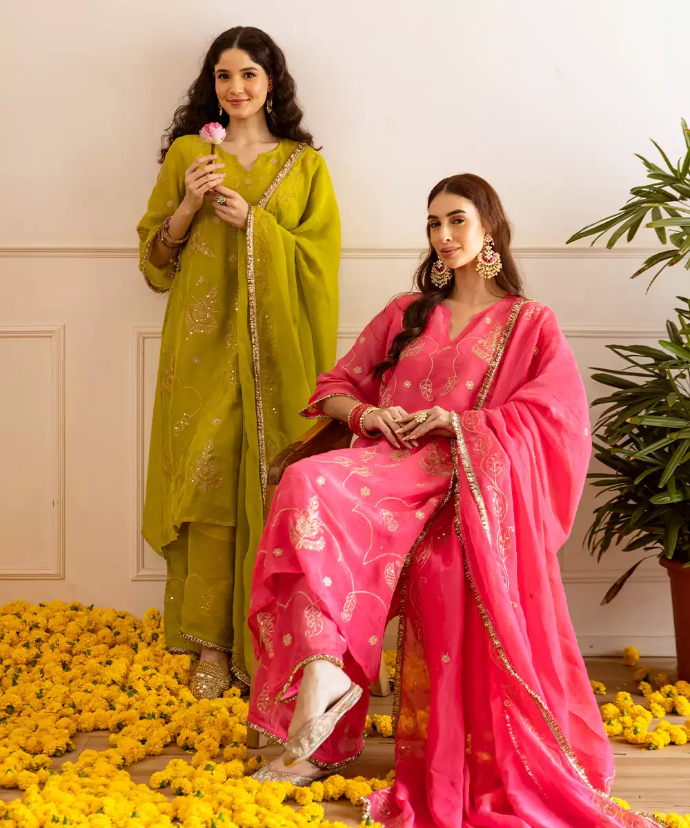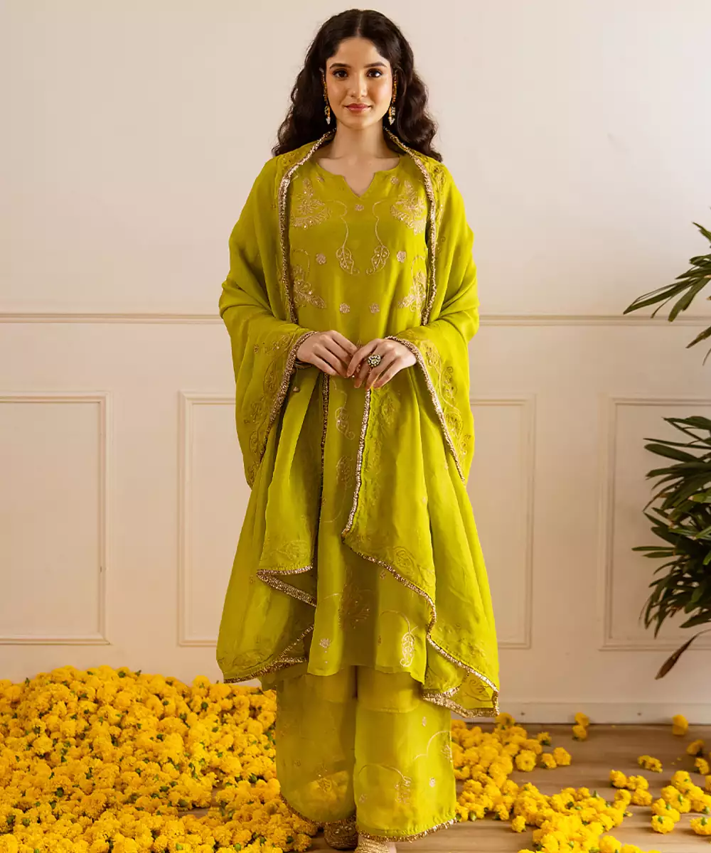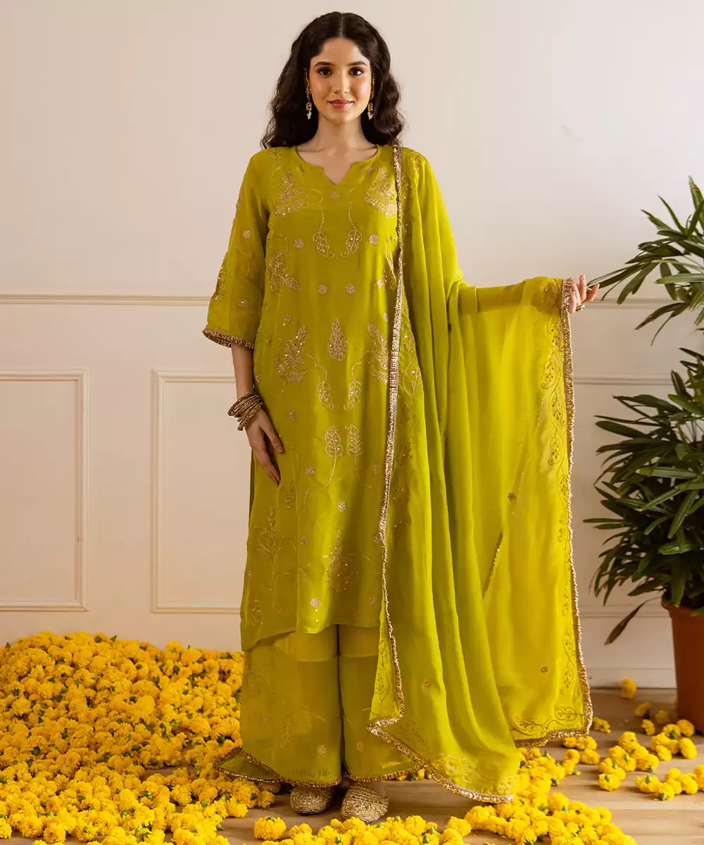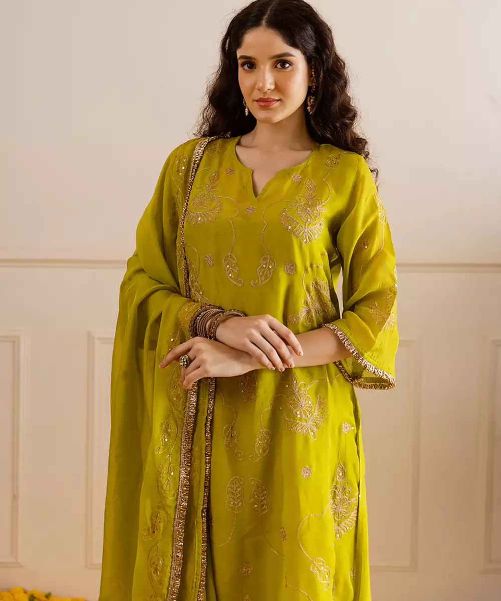 Fresh, Radiant, And Festive – This Green Viscose Organza Set Is A Perfect Choice For The Season. Tailored In Viscose Organza Fabric With An Inner Slip For Comfort, The 45 Inch Kurta Features Detailed Zari And Taari Embroidery That Reflects Traditional Artistry. Kiran Lace Finishing Enhances The Edges Of Both The Kurta And The 2.5 Meter Dupatta, Creating A Luminous Look.