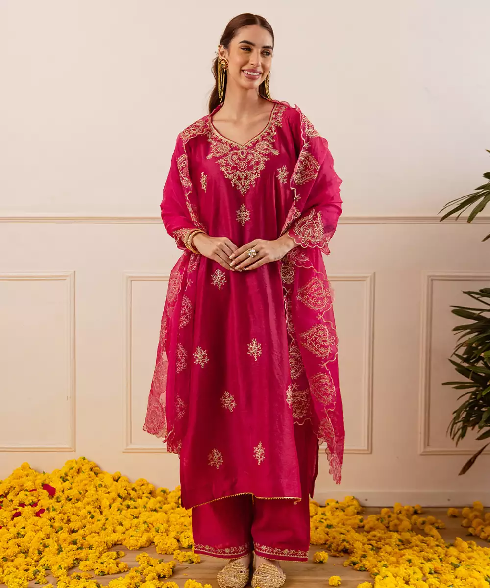 Pink Straight Set: A Vivid Pink Straight Fit Kurta Set Crafted In A Lustrous Chanderi Style Fabric, Featuring A Gently Curved V Neckline Framed With Intricate Zari Vines And Scalloped Motif Work That Cascades Along The Yoke. Scattered Zari Buttas Add Soft Sparkle Across The Body, While The Sheer Organza Dupatta Is Beautifully Handcrafted With Oversized Scalloped Zari Appliqués Along The Border And Anchored Corner Medallions To Mirror The Neckline.