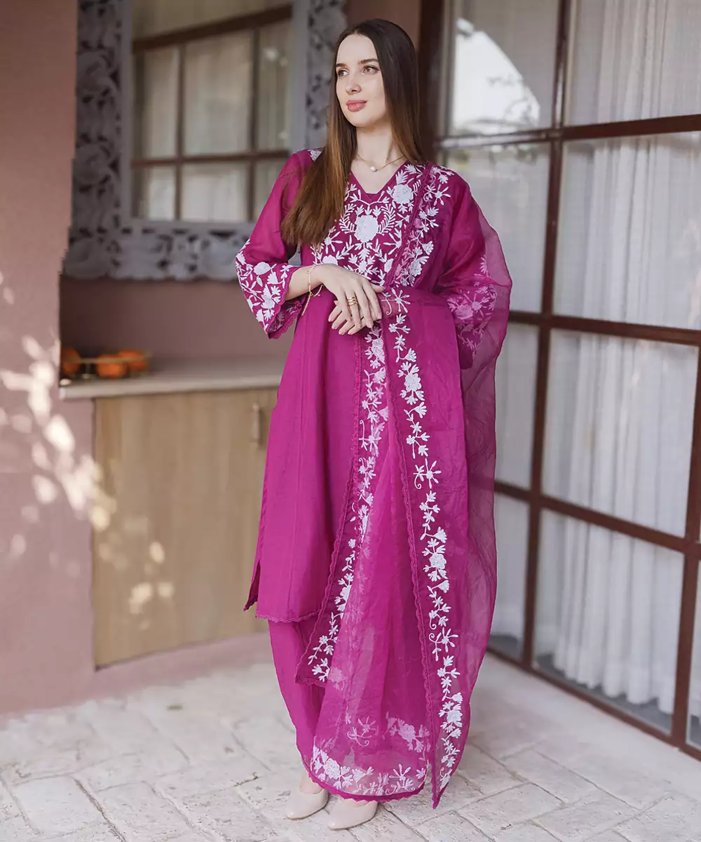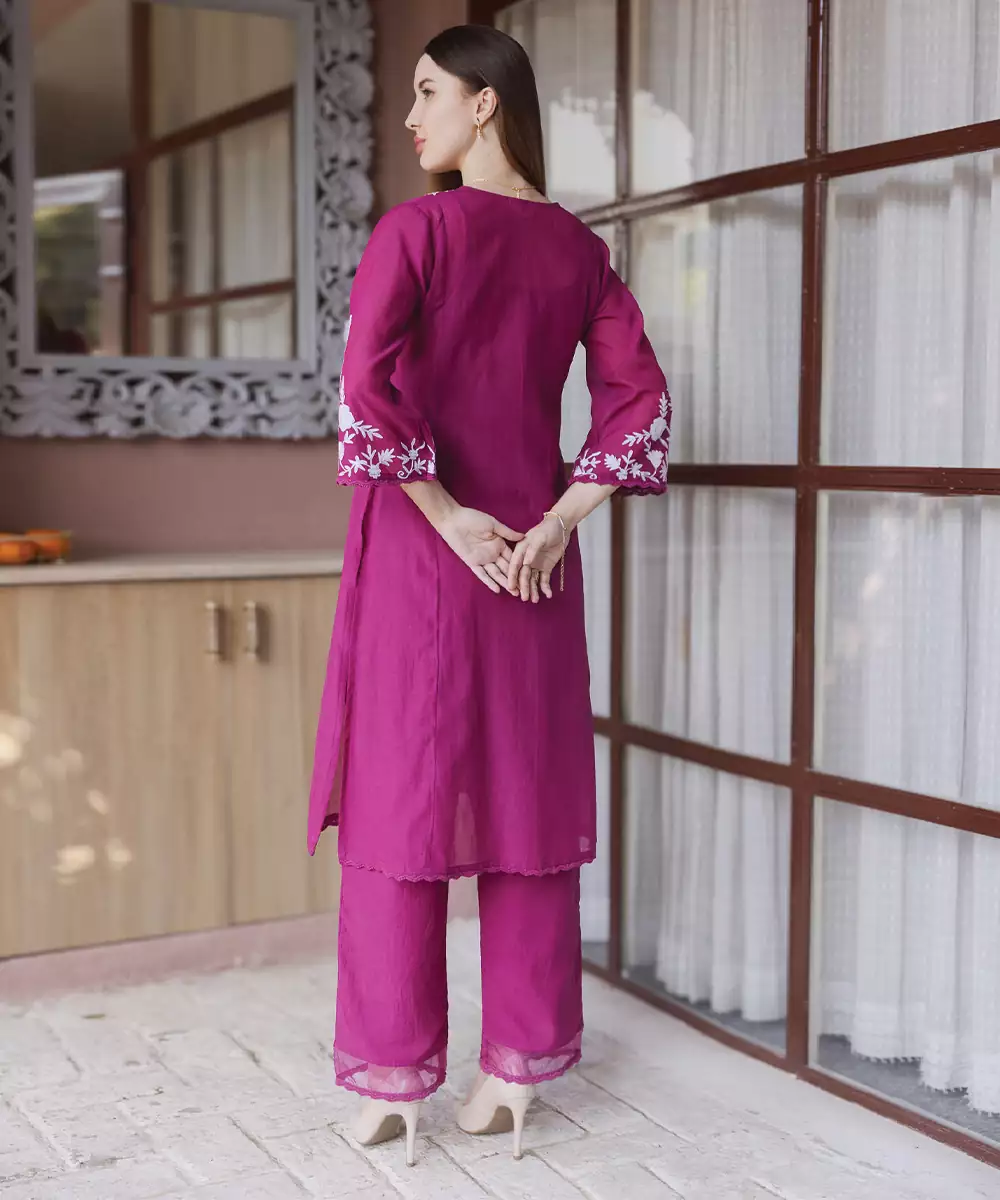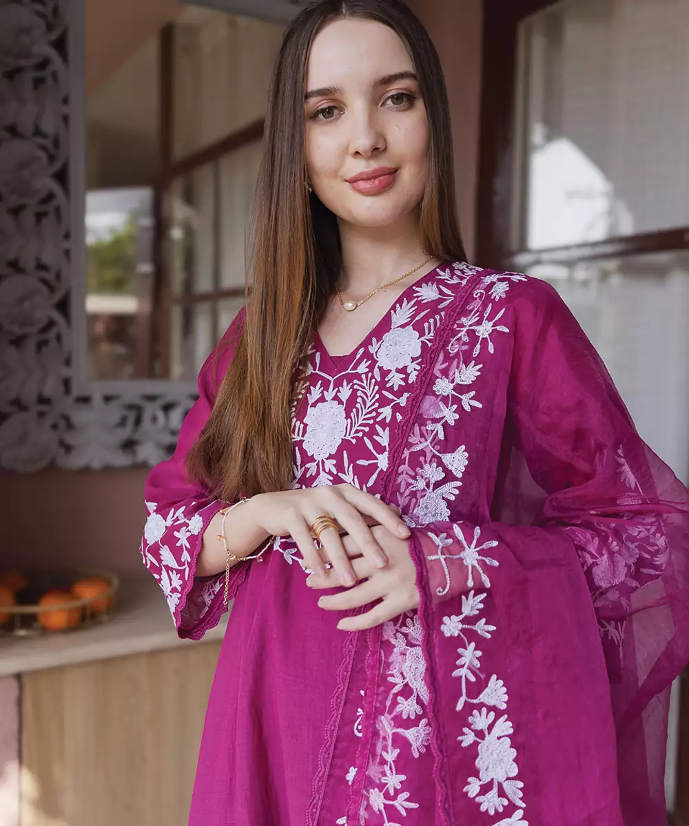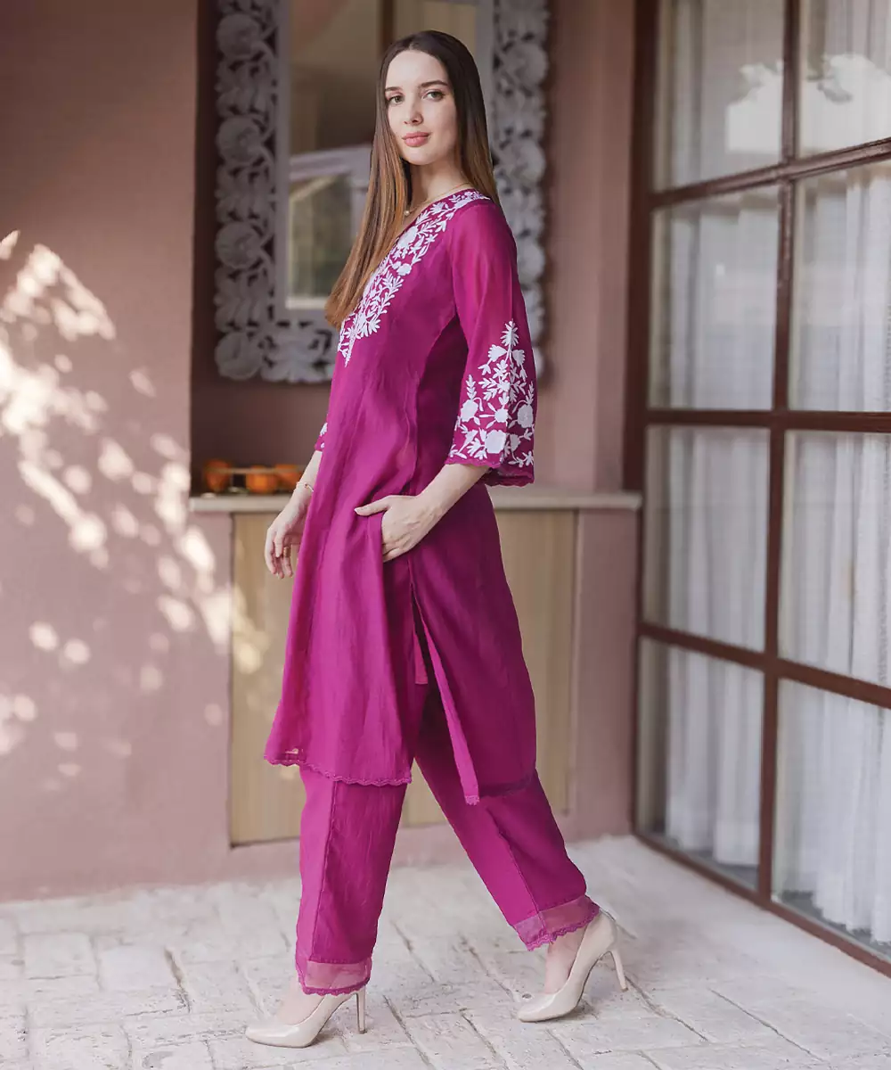 This Magenta Embroidered Mul Chanderi Straight Suit Set Stands Out With Its Bold Color And Intricate Craftsmanship. The Subtle Sheen Enhances Its Richness, Making It Perfect For Festive Occasions. A Statement Outfit That Combines Elegance, Comfort, And Traditional Charm Effortlessly.