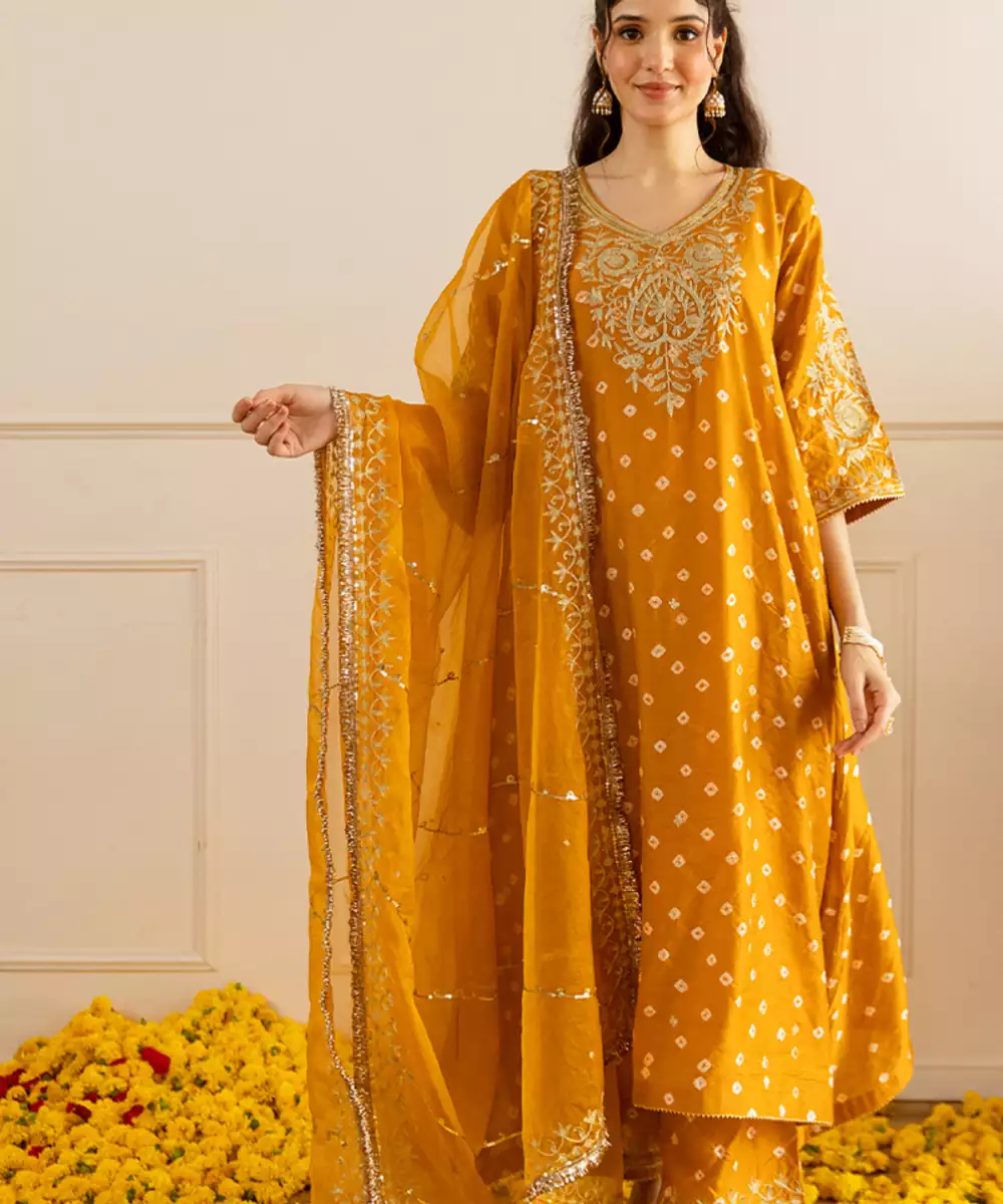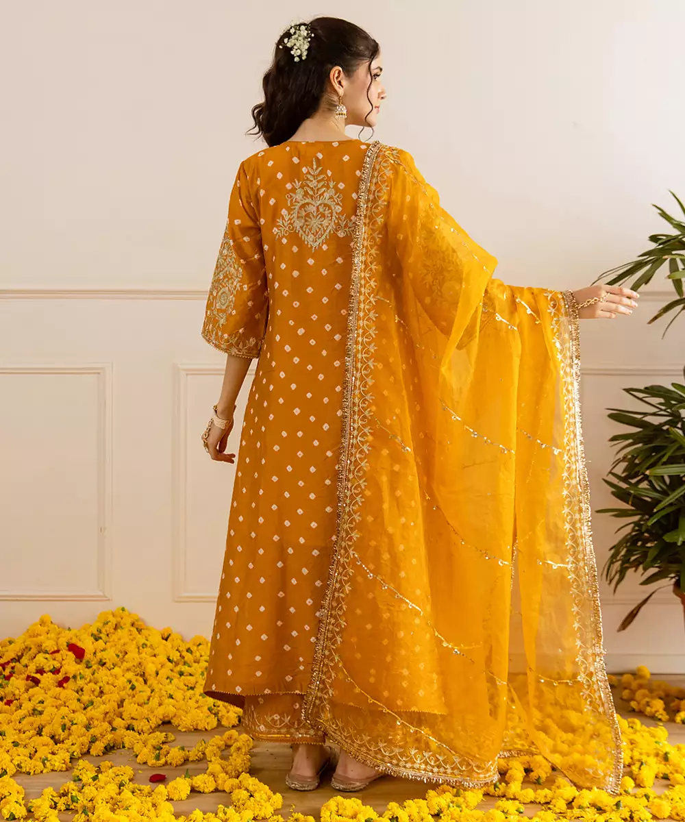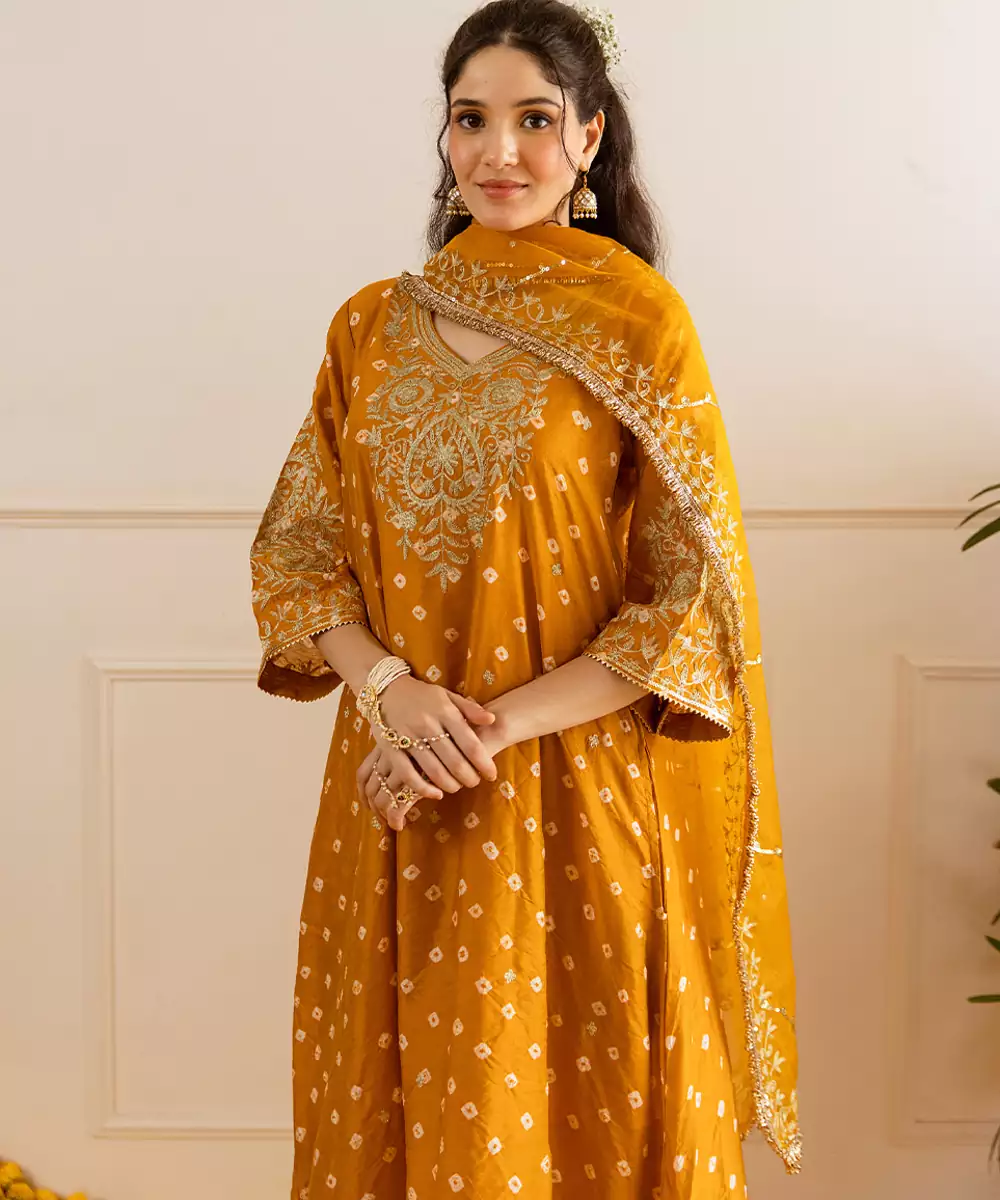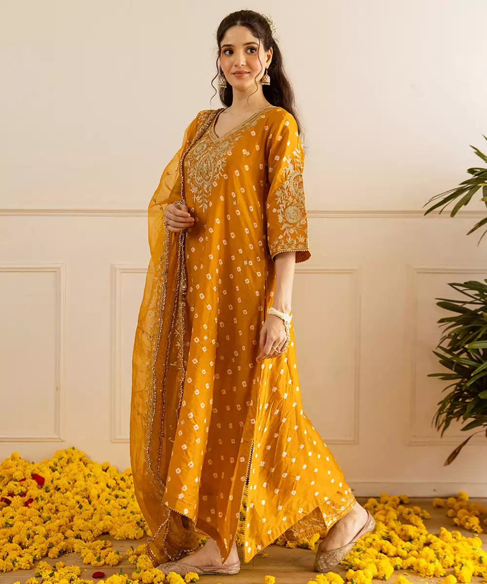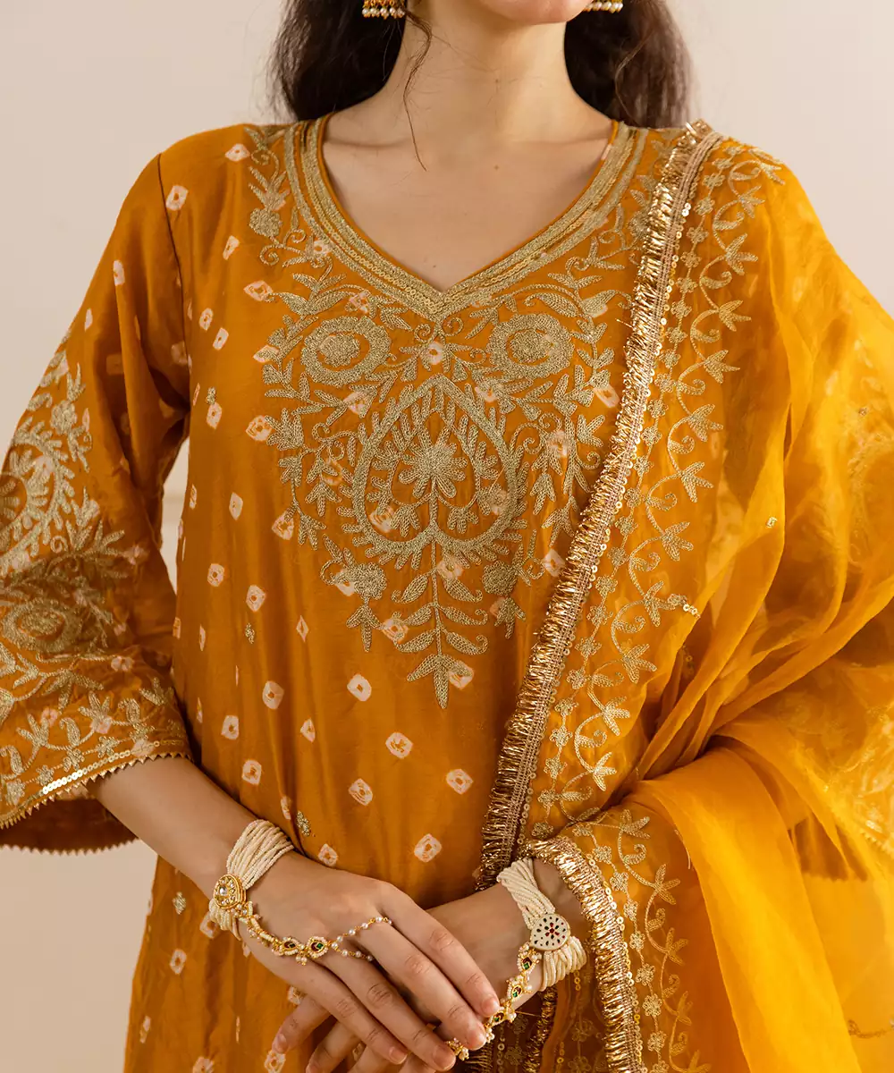 A Marigold Hand Bandhej Festive Set, Delicately Tied By Hand And Elevated With Ornate Aari Zari Taari Embroidery Forming A Heritage Neckline Panel. The Organza Dupatta Features Neat Taari Line Zari Running Along The Edges With Sprinkled Buttis, Balancing A Flared Kurta And Straight Pants For Ceremony Ready Brilliance.
