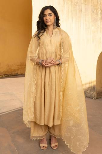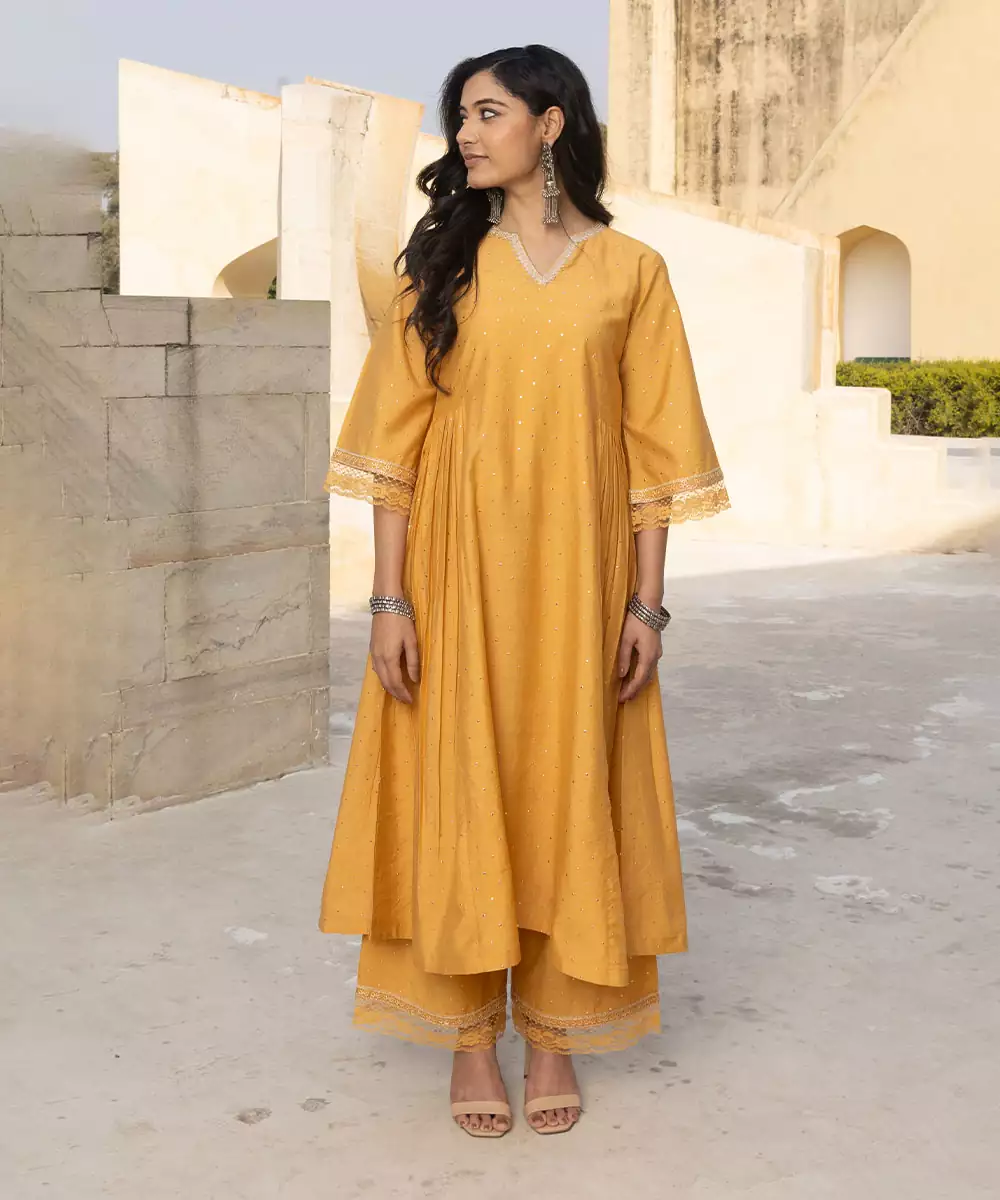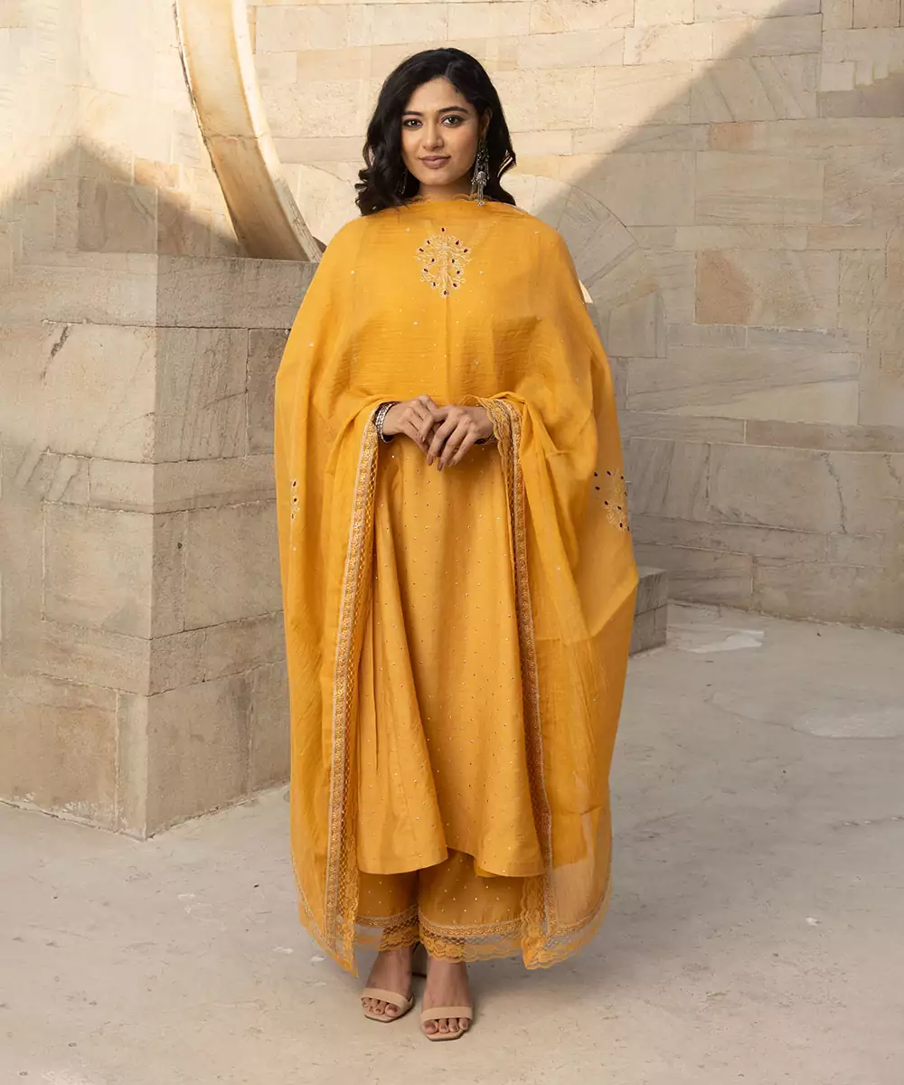 Introducing Our Exquisite “A Mustard Yellow Mukaish Work Three Kali Gathered Suit Set Sounds Like A Stunning And Intricate Ensemble.