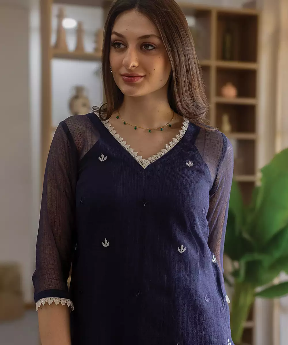 This Navy Blue Embroidered Cotton Straight Suit Set Showcases A Rich Tone With Intricate Detailing. The Breathable Fabric Ensures Comfort, While The Elegant Silhouette Makes It Ideal For Both Casual And Festive Occasions, Offering A Timeless And Sophisticated Ethnic Look.