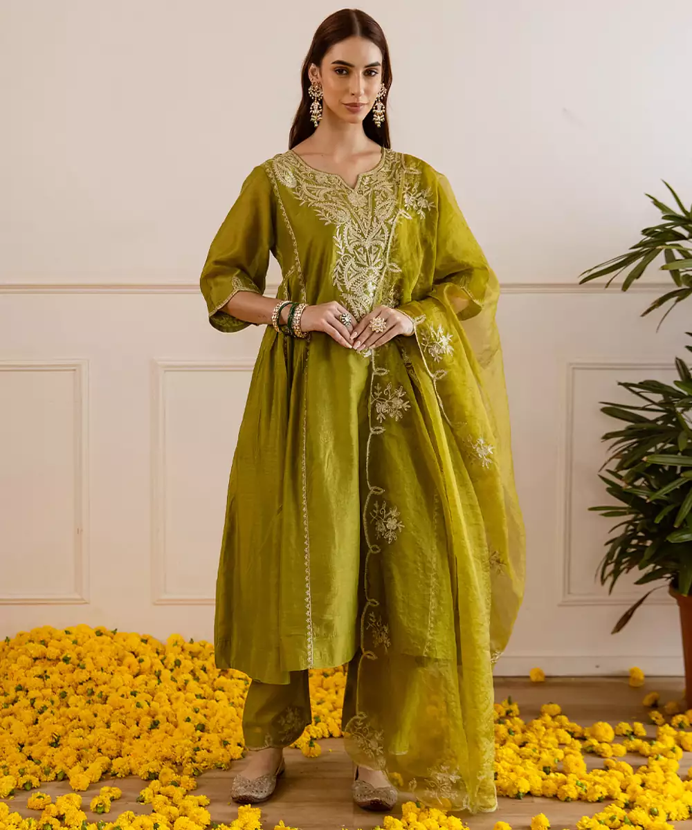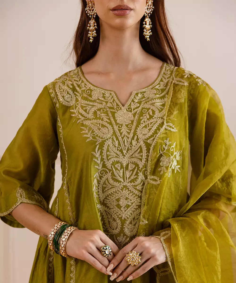 Bring Freshness And Vibrance To Your Festive Wardrobe With This Green Chanderi Kurta Set. Featuring A 45 Inch A Line Kurta With Detailed Zari And Taari Embroidery, It Balances Festive Richness With Comfort. The Set Is Completed With 36 Inch Pants And A Side Pocket For Convenience.