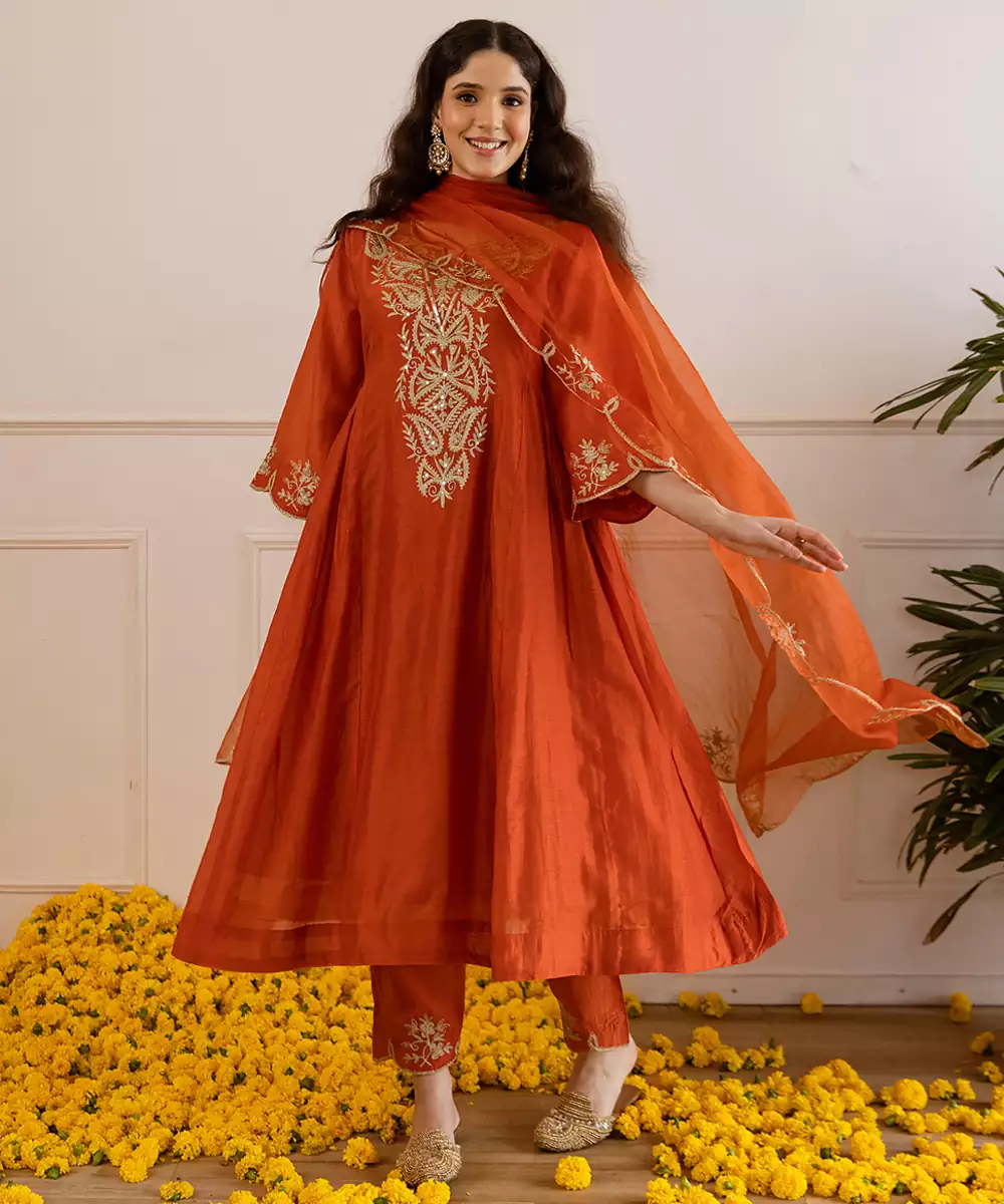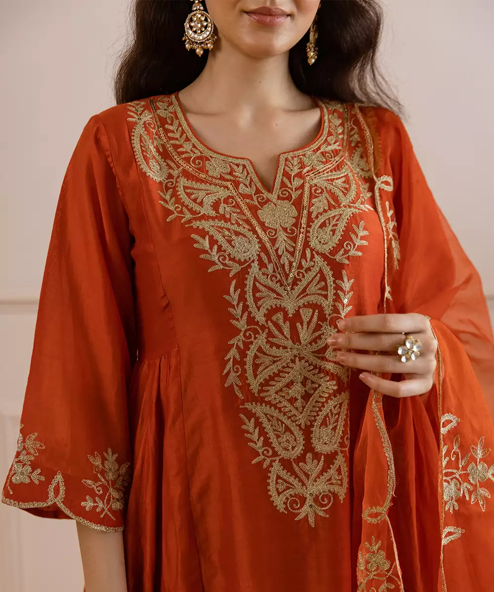 Warm And Festive, This Rust Orange Chanderi Kurta Set Is A Celebration Of Earthy Elegance. The 45 Inch A Line Kurta Is Detailed With Zari And Taari Embroidery, Enhanced By A Practical Pocket And Paired With 36 Inch Pants For A Comfortable Yet Regal Silhouette.