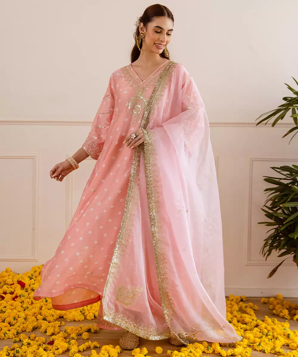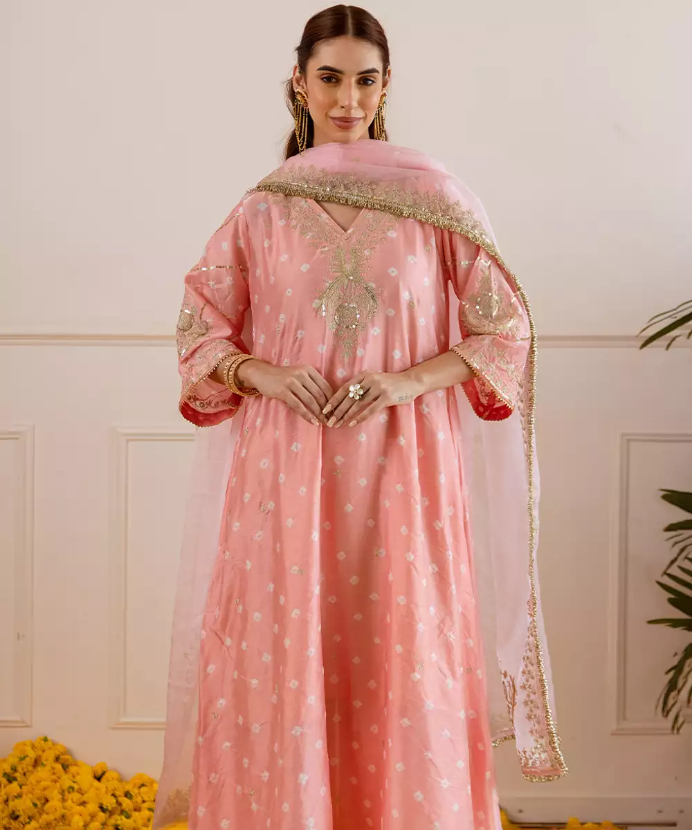 An Exquisitely Made Soft Peach Hand Bandhej Ensemble With Artisan Knot Tying Across The Fabric And Refined Hand Embroidered Zari Taari Motifs At The Neckline. The Airy Organza Dupatta Carries Continuous Taari Line Zari Detailing And A Scalloped Edge, Complementing The Gentle Drape Of The Relaxed Kurta And Slim Pants.
