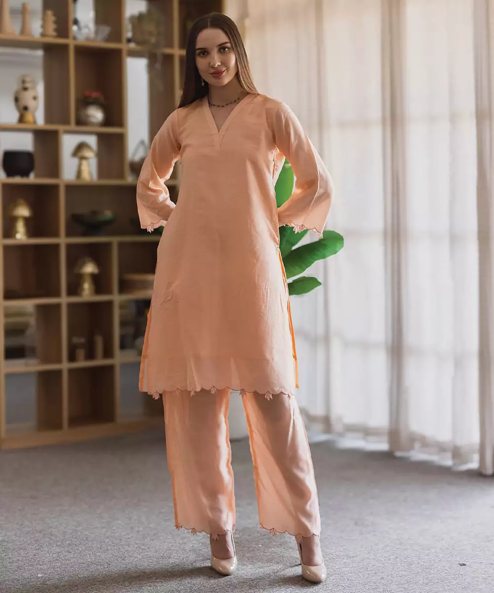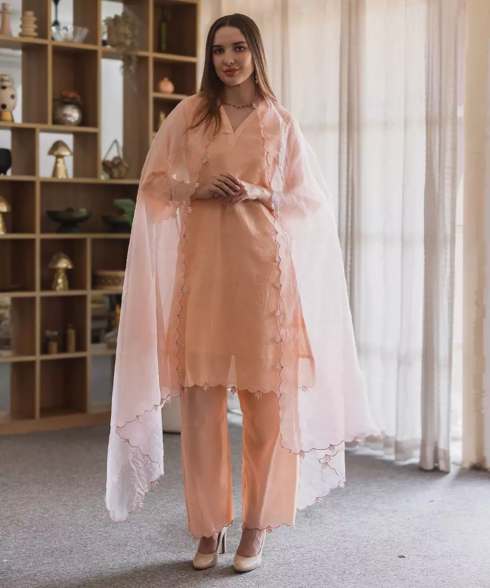 Soft And Elegant, This Peach Embroidered Chanderi Straight Suit Set Features Delicate Detailing With A Subtle Sheen. The Lightweight Fabric And Graceful Silhouette Make It Perfect For Festive Wear And Daytime Events, Offering A Refined And Feminine Look With Effortless Charm.