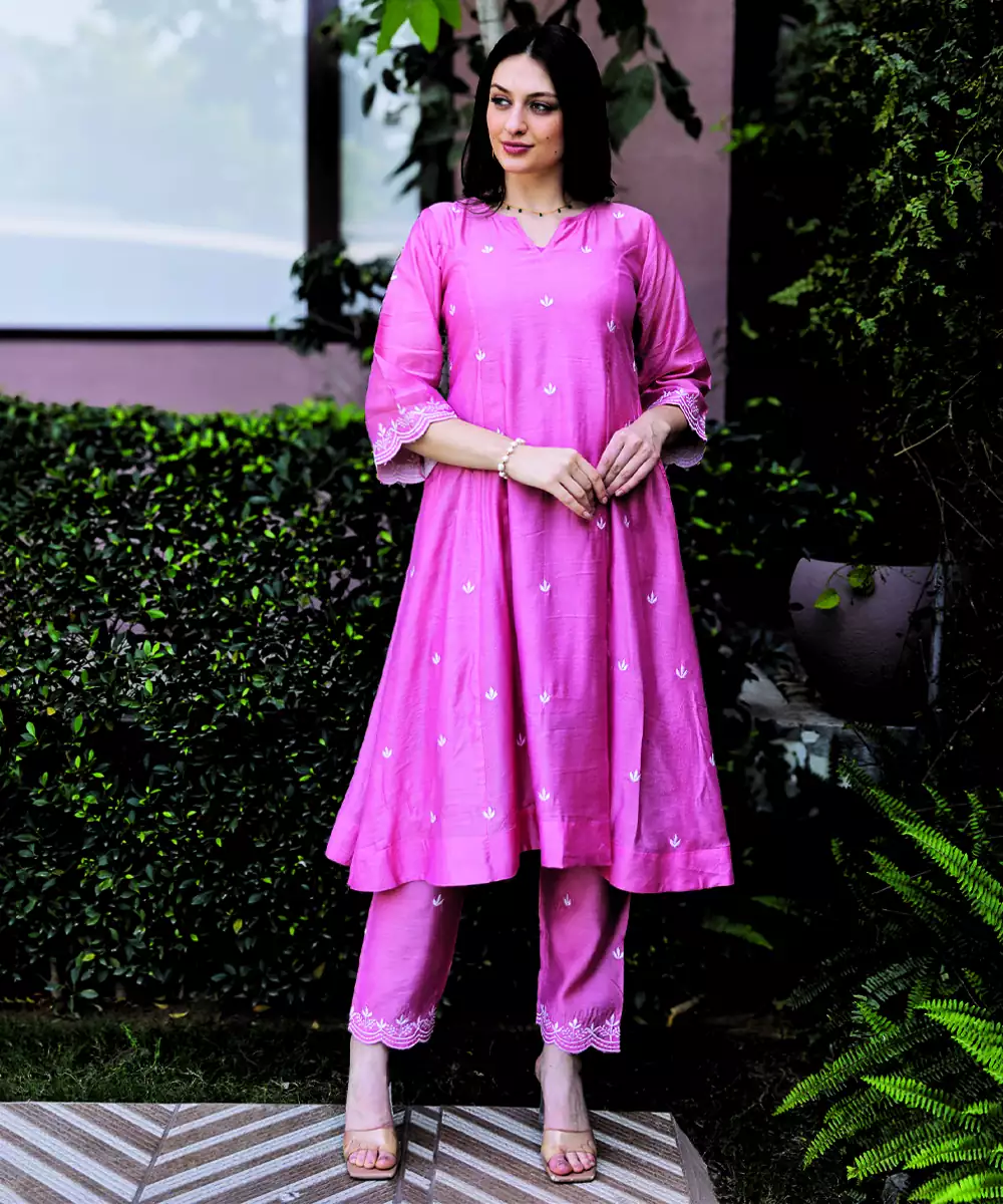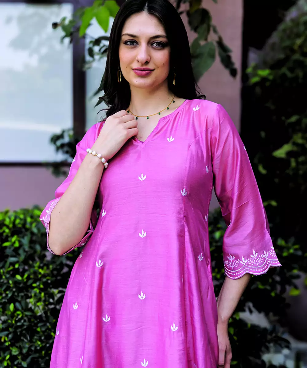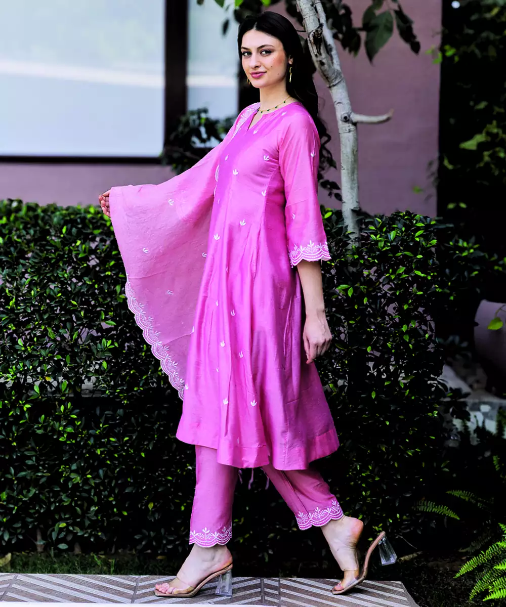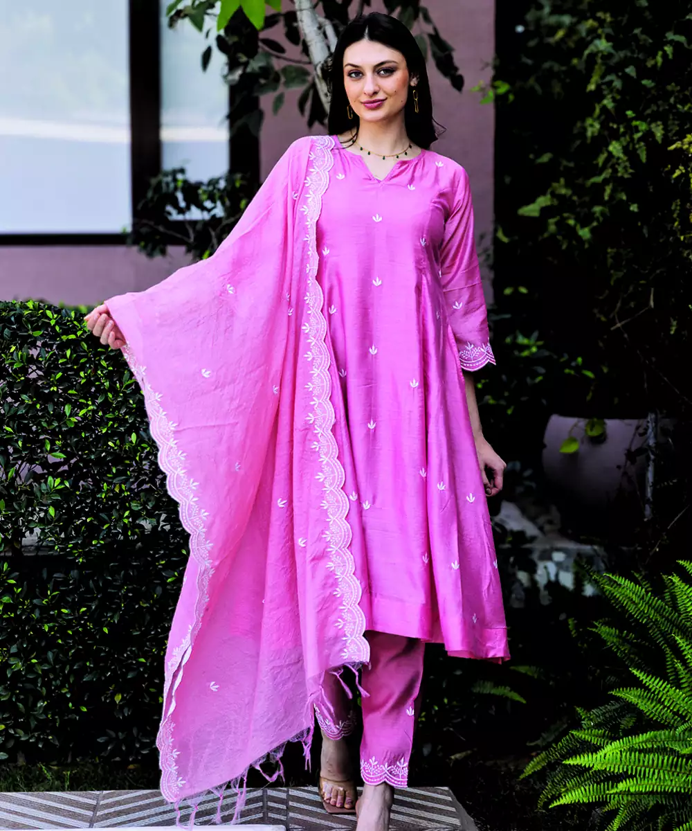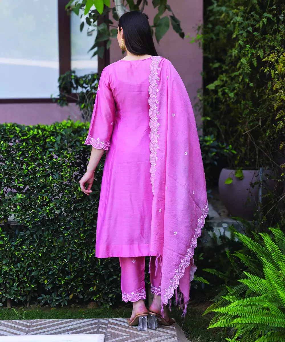 This Pink Embroidered Chanderi Straight Suit Set Offers A Perfect Blend Of Softness And Elegance. The Lightweight Fabric With Subtle Sheen And Intricate Detailing Makes It Ideal For Festive Wear, Adding A Graceful And Feminine Touch To Your Ethnic Style.