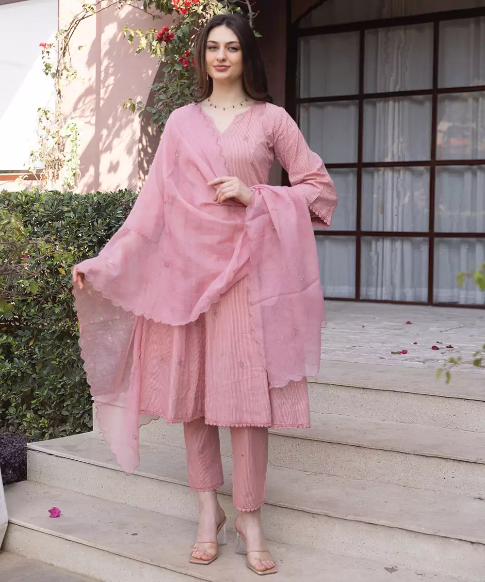 This Pink Embroidered Cotton Straight Suit Set Offers A Muted Yet Elegant Look. Crafted From Breathable Fabric, It Ensures Comfort While The Delicate Embroidery Adds Refinement. Ideal For Everyday Wear And Small Gatherings, It Combines Subtle Charm With Timeless Style.