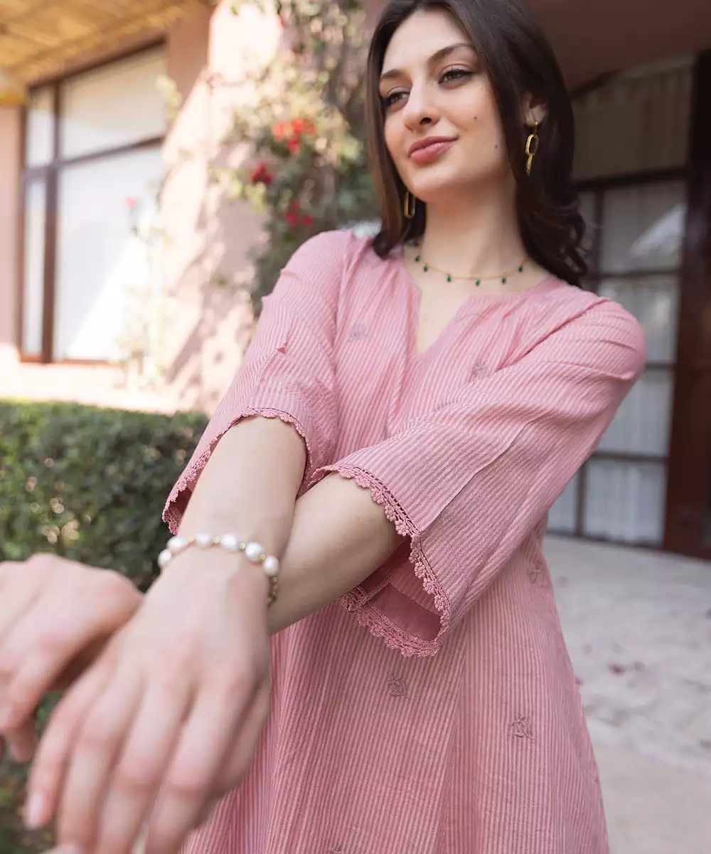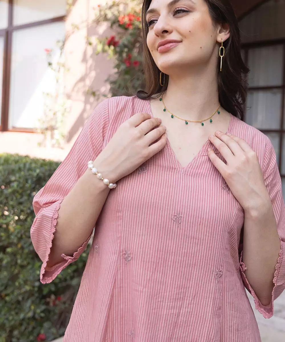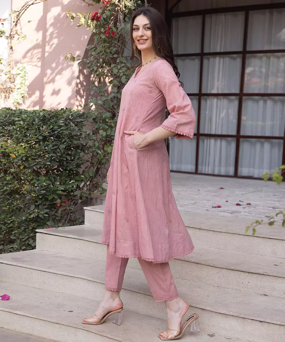 Pink Embroidered Cotton Straight Suit Set