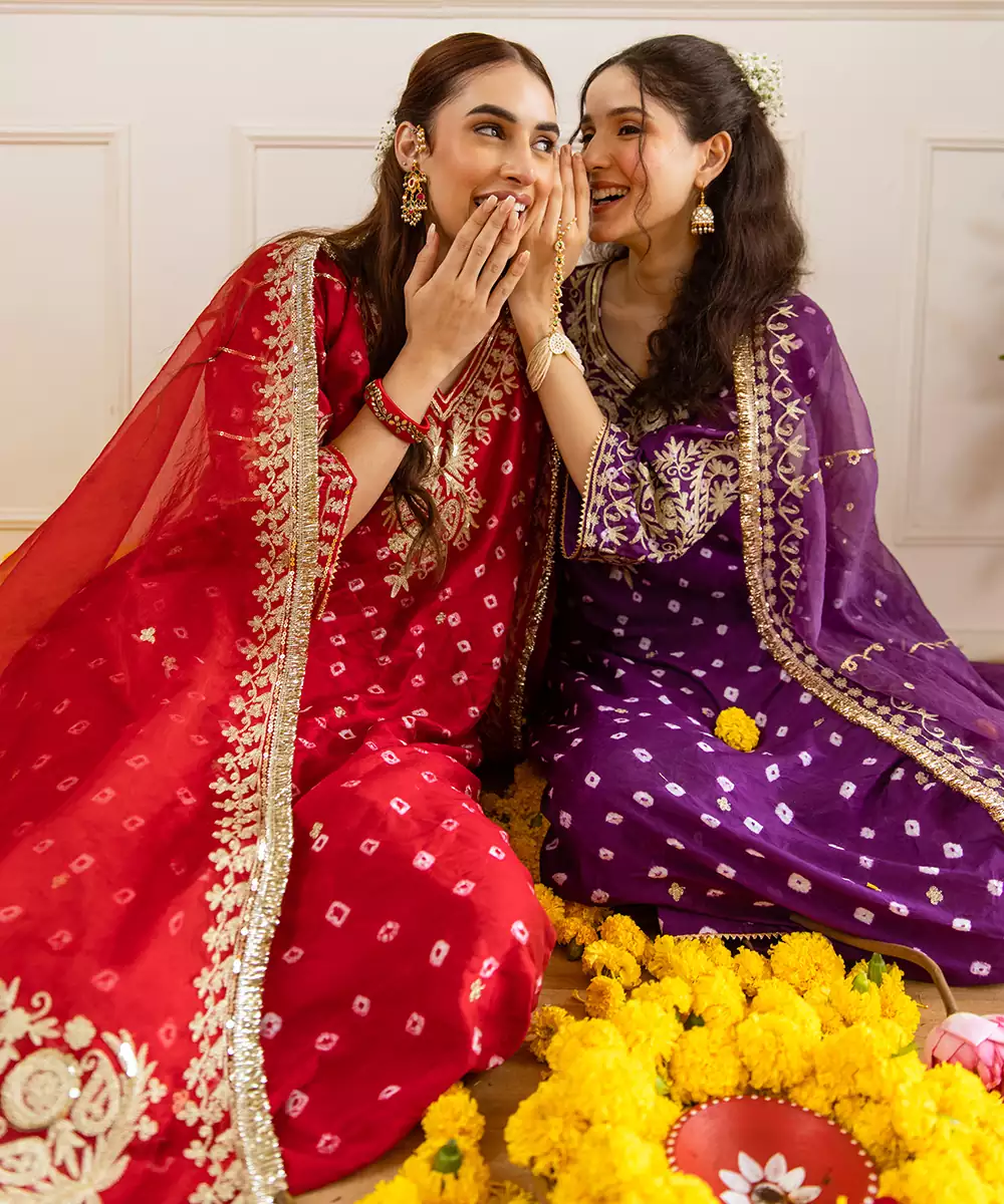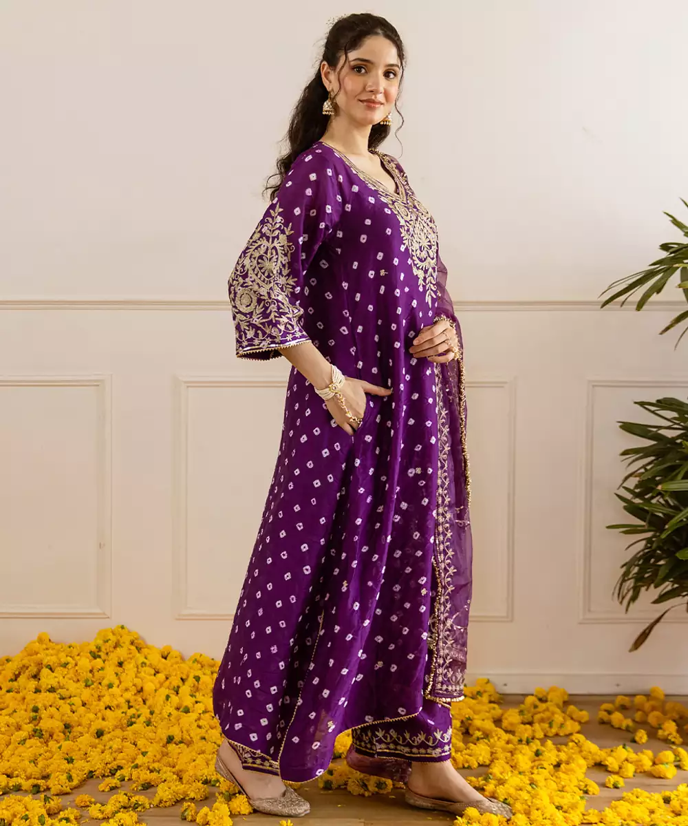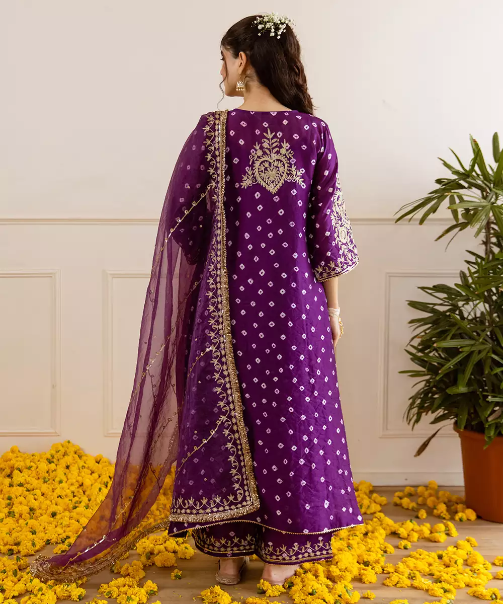 Handmade Royal Purple Bandhej Suit Set With Artisanal Tie Dye Buttis And A Central Hand Embroidered Zari Taari Medallion At The Neckline. The Sheer Organza Dupatta Is Traced In Continuous Taari Line Zari And A Broad Border, Framing The Jewel Tone For Refined Evening Elegance.
