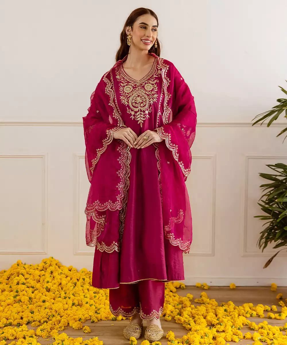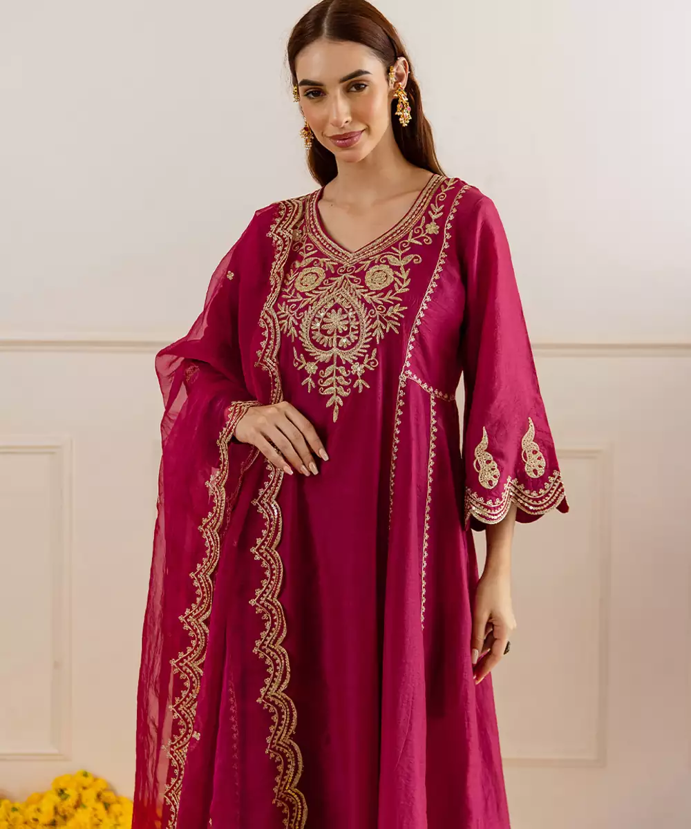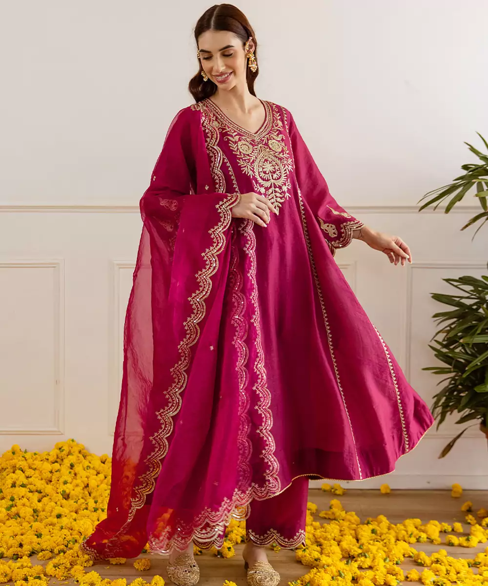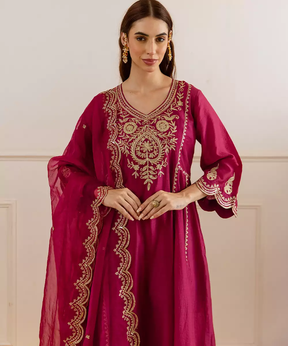 Celebrate The Festive Season In Timeless Elegance With This Red Chanderi Kurta Set. The A Line Kurta (45 Inches) Is Delicately Embroidered With Zari And Taari Work, Creating A Regal Shimmer Perfect For Special Occasions. Thoughtfully Designed With Pockets For Added Convenience, This Kurta Is Paired With 36 Inch Pants For A Graceful Fall.Flowing And Radiant, The Dupatta Adds A Luxurious Touch To The Overall Look.
